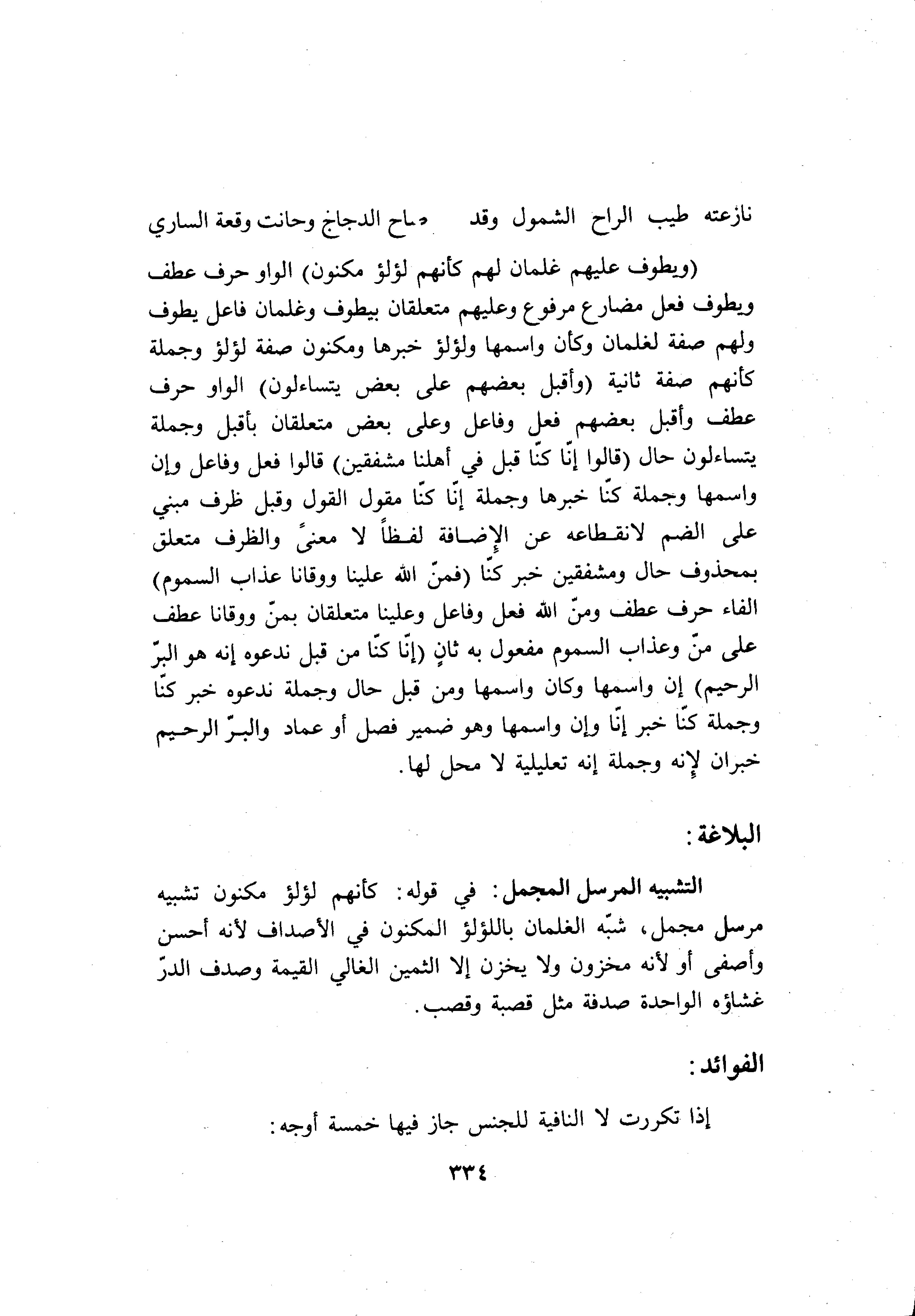 التشبيه المرسل المجمل: في قوله: كأنهم لؤلؤ مكنون تشبيه مرسل مجمل، شبّه الغلمان باللؤلؤ المكنون في الأصداف لأنه أحسن وأصفى أو لأنه مخزون ولا يخزن إلا الثمين الغالي القيمة وصدف الدرّ غشاؤه الواحدة صدفة مثل قصبة وقصب.