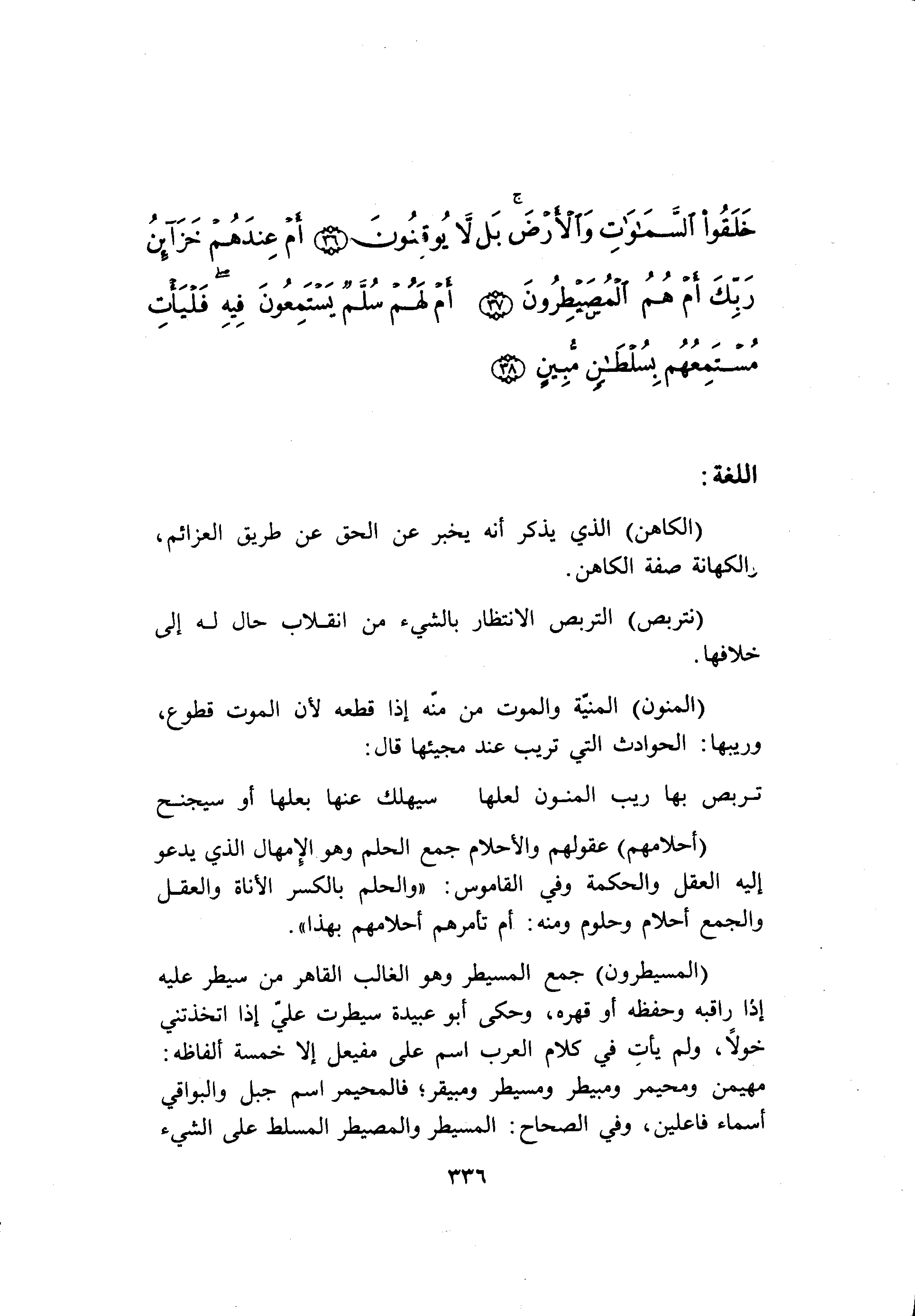 (الْمُصَيْطِرُونَ) جمع المسيطر وهو الغالب القاهر من سيطر عليه إذا راقبه وحفظه أو قهره، وحكى أبو عبيدة سيطرت عليّ إذا اتخذتني خولا، ولم يأت في كلام العرب اسم على مفيعل إلا خمسة ألفاظه: