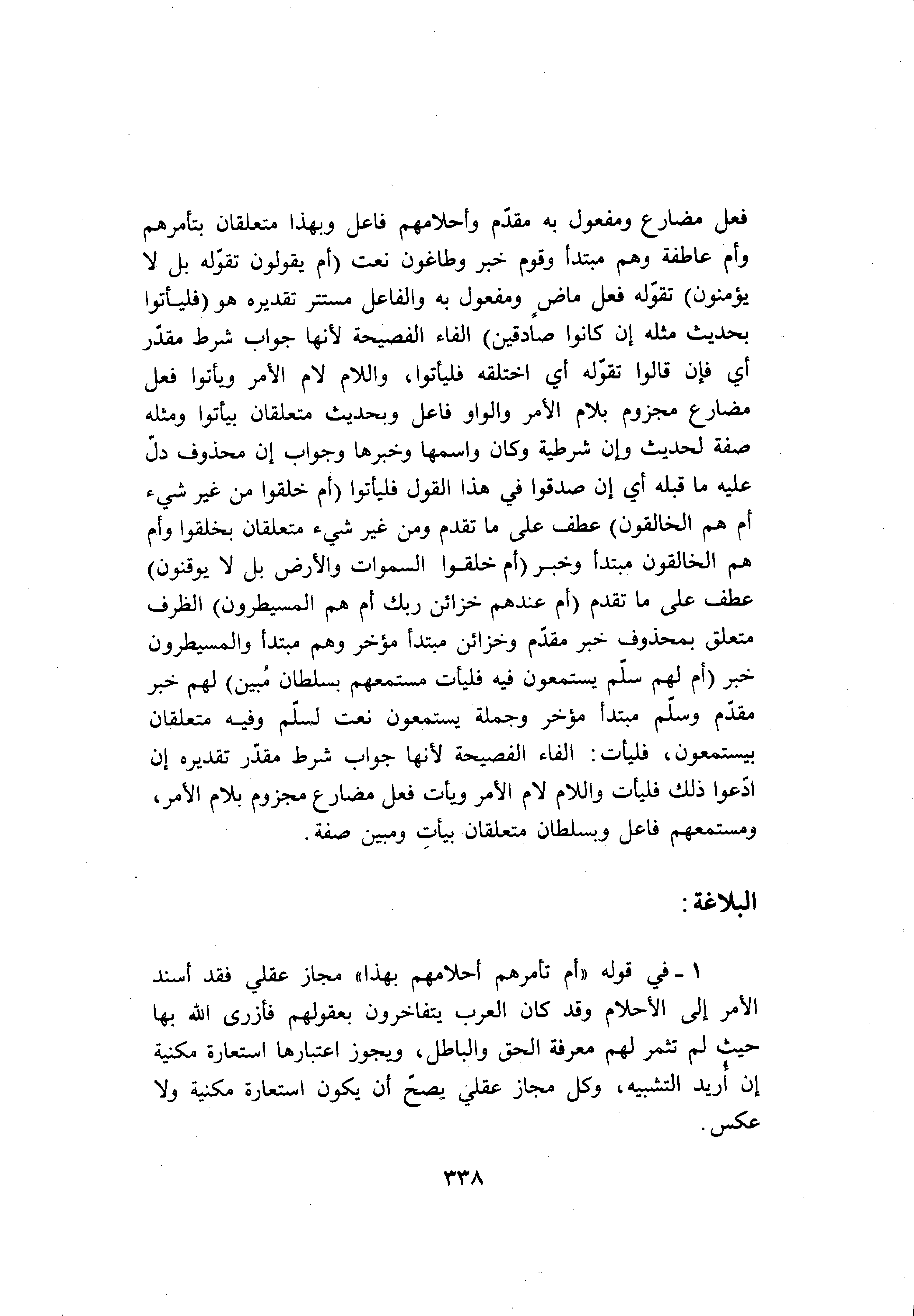 فعل مضارع ومفعول به مقدّم وأحلامهم فاعل وبهذا متعلقان بتأمرهم وأم عاطفة وهم مبتدأ وقوم خبر وطاغون نعت (أَمْ يَقُولُونَ تَقَوَّلَهُ بَلْ لا يُؤْمِنُونَ) تقوّله فعل ماض ومفعول به والفاعل مستتر تقديره هو (فَلْيَأْتُوا بِحَدِيثٍ مِثْلِهِ إِنْ كانُوا صادِقِينَ) الفاء الفصيحة لأنها جواب شرط مقدّر أي فإن قالوا تقوّله أي اختلقه فليأتوا، واللام لام الأمر ويأتوا فعل مضارع مجزوم بلام الأمر والواو فاعل وبحديث متعلقان بيأتوا ومثله صفة لحديث وإن شرطية وكان واسمها وخبرها وجواب إن محذوف دلّ عليه ما قبله أي إن صدقوا في هذا القول فليأتوا (أَمْ خُلِقُوا مِنْ غَيْرِ شَيْءٍ أَمْ هُمُ الْخالِقُونَ) عطف على ما تقدم ومن غير شيء متعلقان بخلقوا وأم هم الخالقون مبتدأ وخبر (أَمْ خَلَقُوا السَّماواتِ وَالْأَرْضَ بَلْ لا يُوقِنُونَ) عطف على ما تقدم (أَمْ عِنْدَهُمْ خَزائِنُ رَبِّكَ أَمْ هُمُ الْمُصَيْطِرُونَ) الظرف متعلق بمحذوف خبر مقدّم وخزائن مبتدأ مؤخر وهم مبتدأ والمسيطرون خبر (أَمْ لَهُمْ سُلَّمٌ يَسْتَمِعُونَ فِيهِ فَلْيَأْتِ مُسْتَمِعُهُمْ بِسُلْطانٍ مُبِينٍ) لهم خبر مقدّم وسلّم مبتدأ مؤخر وجملة يستمعون نعت لسلّم وفيه متعلقان بيستمعون، فليأت: الفاء الفصيحة لأنها جواب شرط مقدّر تقديره إن ادّعوا ذلك فليأت واللام لام الأمر ويأت فعل مضارع مجزوم بلام الأمر، ومستمعهم فاعل وبسلطان متعلقان بيأت ومبين صفة.