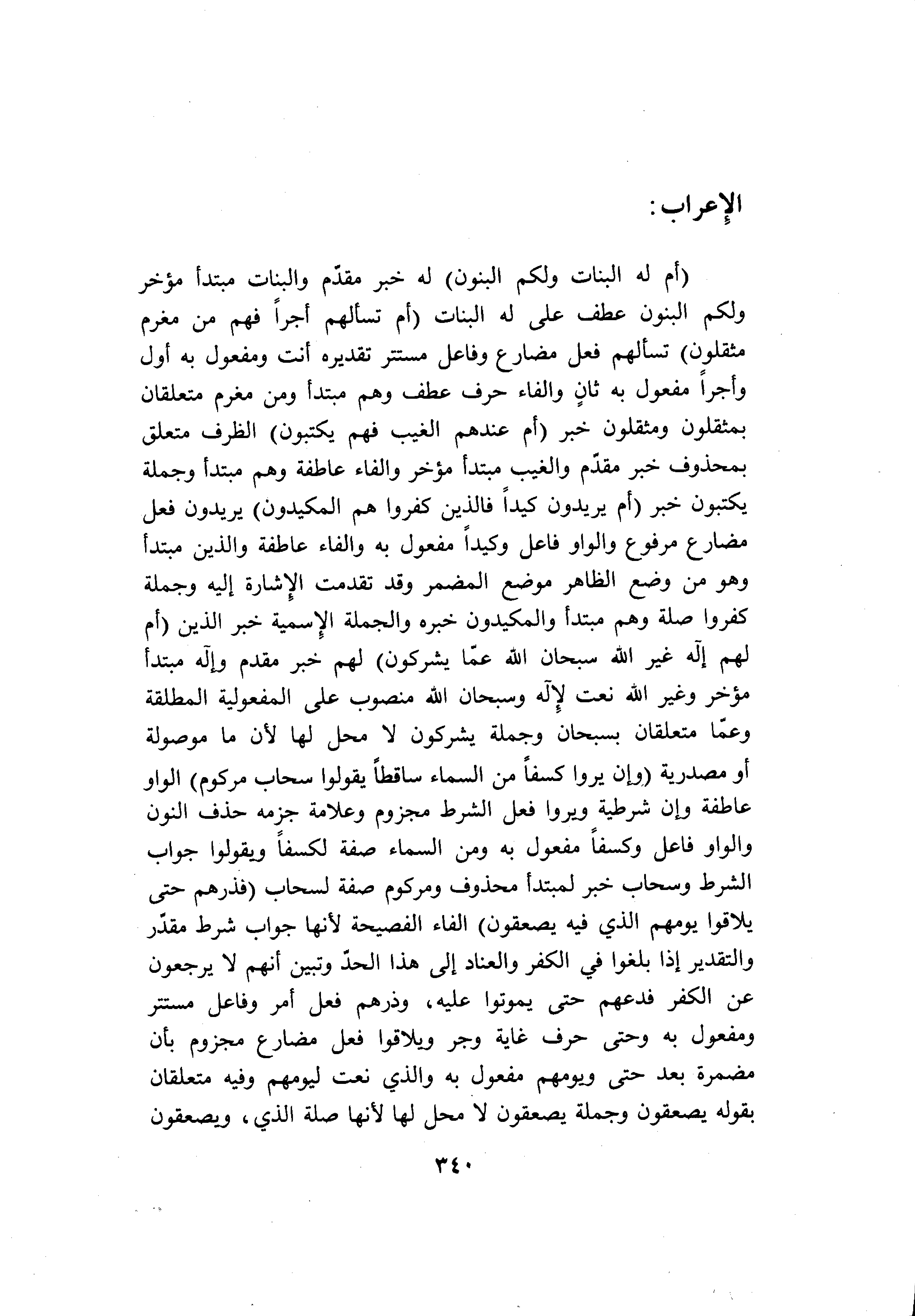 (أَمْ لَهُ الْبَناتُ وَلَكُمُ الْبَنُونَ) له خبر مقدّم والبنات مبتدأ مؤخر ولكم البنون عطف على له البنات (أَمْ تَسْئَلُهُمْ أَجْراً فَهُمْ مِنْ مَغْرَمٍ مُثْقَلُونَ) تسألهم فعل مضارع وفاعل مستتر تقديره أنت ومفعول به أول وأجرا مفعول به ثان والفاء حرف عطف وهم مبتدأ ومن مغرم متعلقان بمثقلون ومثقلون خبر (أَمْ عِنْدَهُمُ الْغَيْبُ فَهُمْ يَكْتُبُونَ) الظرف متعلق بمحذوف خبر مقدّم والغيب مبتدأ مؤخر والفاء عاطفة وهم مبتدأ وجملة يكتبون خبر (أَمْ يُرِيدُونَ كَيْداً فَالَّذِينَ كَفَرُوا هُمُ الْمَكِيدُونَ) يريدون فعل مضارع مرفوع والواو فاعل وكيدا مفعول به والفاء عاطفة والذين مبتدأ وهو من وضع الظاهر موضع المضمر وقد تقدمت الإشارة إليه وجملة كفروا صلة وهم مبتدأ والمكيدون خبره والجملة الاسمية خبر الذين (أَمْ لَهُمْ إِلهٌ غَيْرُ اللَّهِ سُبْحانَ اللَّهِ عَمَّا يُشْرِكُونَ) لهم خبر مقدم وإله مبتدأ مؤخر وغير الله نعت لإله وسبحان الله منصوب على المفعولية المطلقة وعمّا متعلقان بسبحان وجملة يشركون لا محل لها لأن ما موصولة أو مصدرية (وَإِنْ يَرَوْا كِسْفاً مِنَ السَّماءِ ساقِطاً يَقُولُوا سَحابٌ مَرْكُومٌ) الواو عاطفة وإن شرطية ويروا فعل الشرط مجزوم وعلامة جزمه حذف النون والواو فاعل وكسفا مفعول به ومن السماء صفة لكسفا ويقولوا جواب الشرط وسحاب خبر لمبتدأ محذوف ومركوم صفة لسحاب (فَذَرْهُمْ حَتَّى يُلاقُوا يَوْمَهُمُ الَّذِي فِيهِ يُصْعَقُونَ) الفاء الفصيحة لأنها جواب شرط مقدّر والتقدير إذا بلغوا في الكفر والعناد إلى هذا الحدّ وتبين أنهم لا يرجعون عن الكفر فدعهم حتى يموتوا عليه، وذرهم فعل أمر وفاعل مستتر ومفعول به وحتى حرف غاية وجر ويلاقوا فعل مضارع مجزوم بأن مضمرة بعد حتى ويومهم مفعول به والذي نعت ليومهم وفيه متعلقان بقوله يصعقون وجملة يصعقون لا محل لها لأنها صلة الذي، ويصعقون
