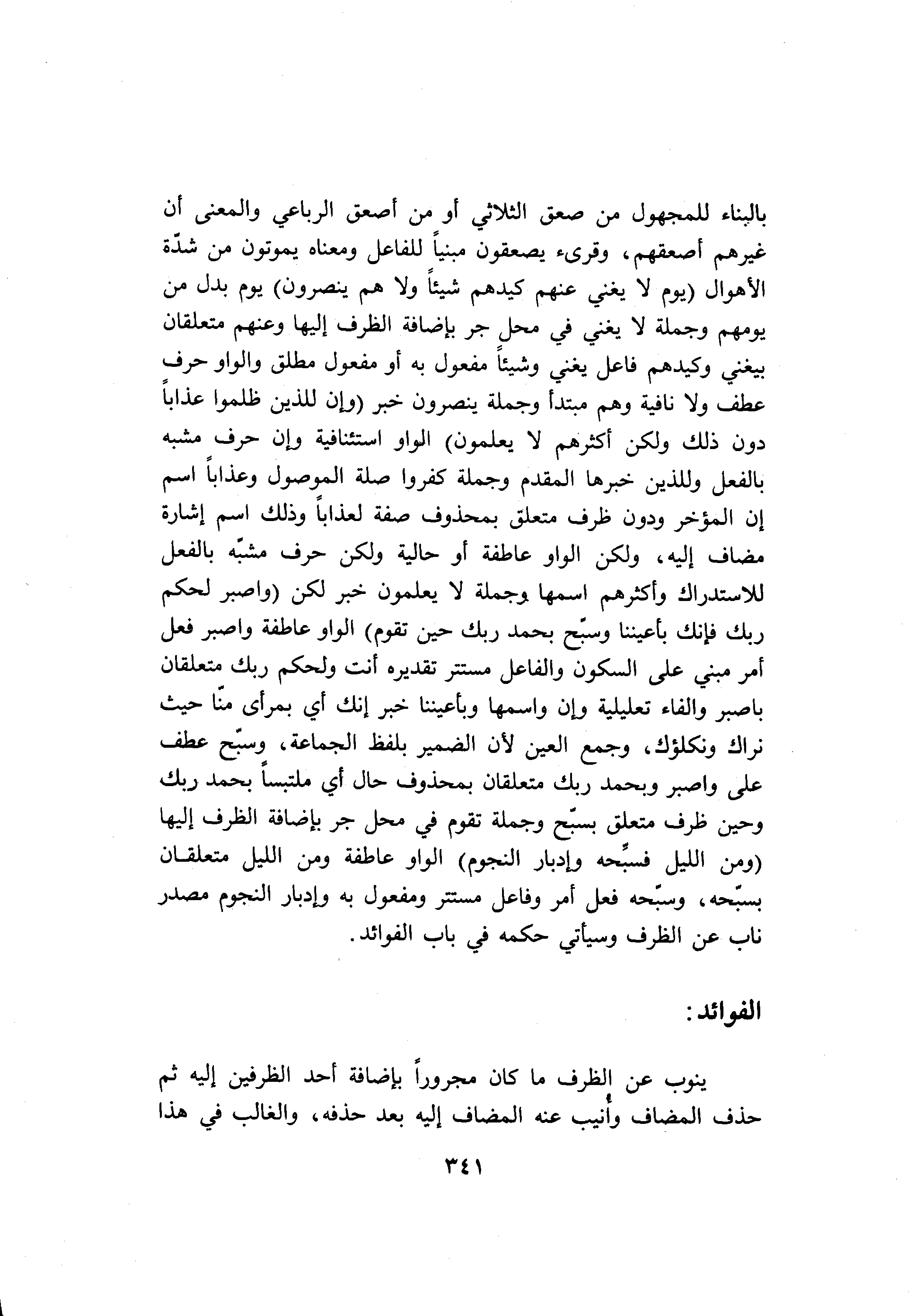 بالبناء للمجهول من صعق الثلاثي أو من أصعق الرباعي والمعنى أن غيرهم أصعقهم، وقرئ يصعقون مبنيا للفاعل ومعناه يموتون من شدّة الأهوال (يَوْمَ لا يُغْنِي عَنْهُمْ كَيْدُهُمْ شَيْئاً وَلا هُمْ يُنْصَرُونَ) يوم بدل من يومهم وجملة لا يغني في محل جر بإضافة الظرف إليها وعنهم متعلقان بيغني وكيدهم فاعل يغني وشيئا مفعول به أو مفعول مطلق والواو حرف عطف ولا نافية وهم مبتدأ وجملة ينصرون خبر (وَإِنَّ لِلَّذِينَ ظَلَمُوا عَذاباً دُونَ ذلِكَ وَلكِنَّ أَكْثَرَهُمْ لا يَعْلَمُونَ) الواو استئنافية وإن حرف مشبه بالفعل وللذين خبرها المقدم وجملة كفروا صلة الموصول وعذابا اسم إن المؤخر ودون ظرف متعلق بمحذوف صفة لعذابا وذلك اسم إشارة مضاف إليه، ولكن الواو عاطفة أو حالية ولكن حرف مشبّه بالفعل للاستدراك وأكثرهم اسمها وجملة لا يعلمون خبر لكن (وَاصْبِرْ لِحُكْمِ رَبِّكَ فَإِنَّكَ بِأَعْيُنِنا وَسَبِّحْ بِحَمْدِ رَبِّكَ حِينَ تَقُومُ) الواو عاطفة واصبر فعل أمر مبني على السكون والفاعل مستتر تقديره أنت ولحكم ربك متعلقان باصبر والفاء تعليلية وإن واسمها وبأعيننا خبر إنك أي بمرأى منّا حيث نراك ونكلؤك، وجمع العين لأن الضمير بلفظ الجماعة، وسبّح عطف على واصبر وبحمد ربك متعلقان بمحذوف حال أي ملتبسا بحمد ربك وحين ظرف متعلق بسبّح وجملة تقوم في محل جر بإضافة الظرف إليها (وَمِنَ اللَّيْلِ فَسَبِّحْهُ وَإِدْبارَ النُّجُومِ) الواو عاطفة ومن الليل متعلقان بسبّحه، وسبّحه فعل أمر وفاعل مستتر ومفعول به وإدبار النجوم مصدر ناب عن الظرف وسيأتي حكمه في باب الفوائد.