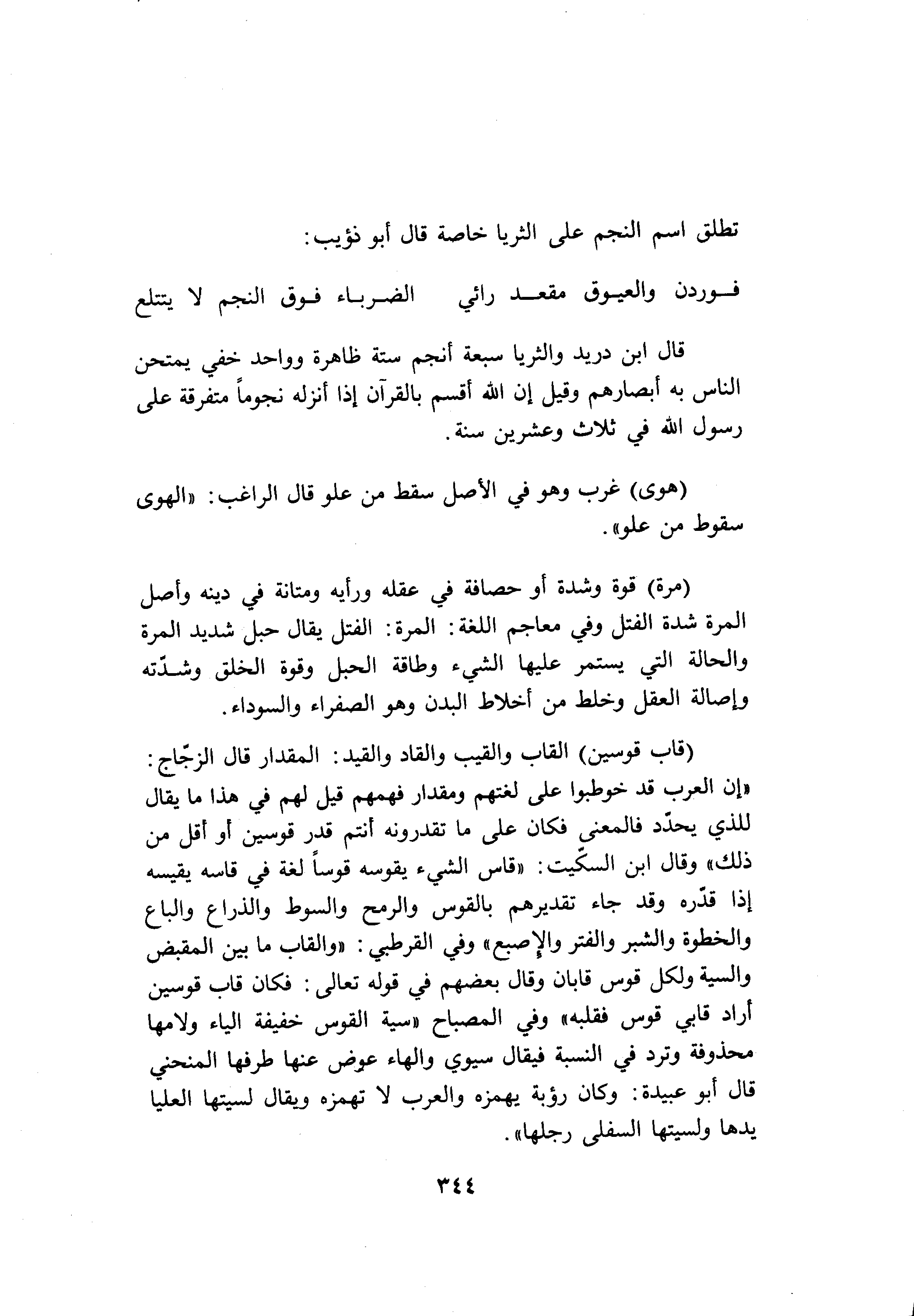 «إن العرب قد خوطبوا على لغتهم ومقدار فهمهم قيل لهم في هذا ما يقال للذي يحدّد فالمعنى فكان على ما تقدرونه أنتم قدر قوسين أو أقل من ذلك» وقال ابن السكّيت: «قاس الشيء يقوسه قوسا لغة في قاسه يقيسه إذا قدّره وقد جاء تقديرهم بالقوس والرمح والسوط والذراع والباع والخطوة والشبر والفتر والإصبع» وفي القرطبي: «والقاب ما بين المقبض والسية ولكل قوس قابان وقال بعضهم في قوله تعالى: فكان قاب قوسين أراد قابي قوس فقلبه» وفي المصباح «سية القوس خفيفة الياء ولامها محذوفة وترد في النسبة فيقال سيوي والهاء عوض عنها طرفها المنحني قال أبو عبيدة: وكان رؤبة يهمزه والعرب لا تهمزه ويقال لسيتها العليا يدها ولسيتها السفلى رجلها» .