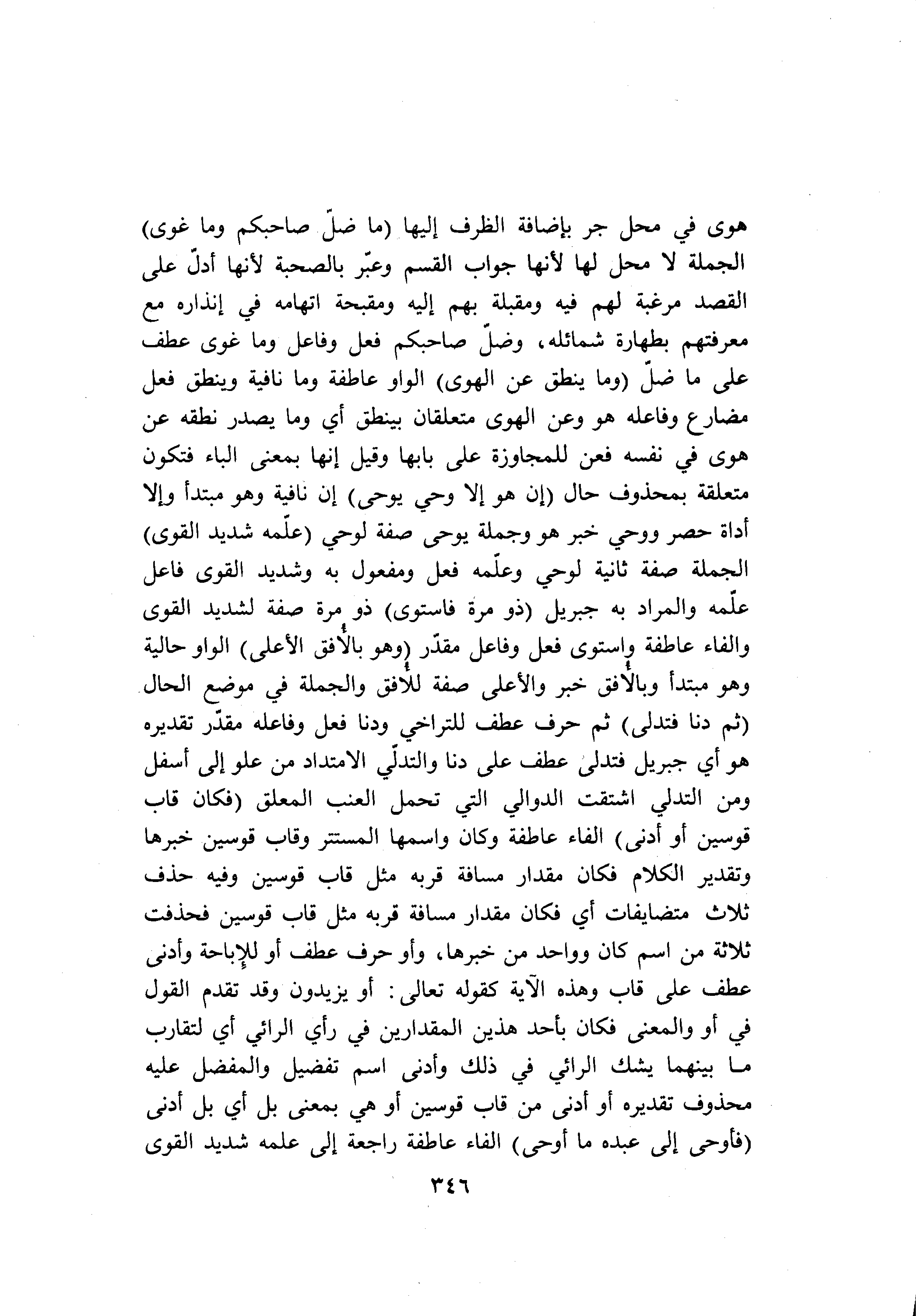 هوى في محل جر بإضافة الظرف إليها (ما ضَلَّ صاحِبُكُمْ وَما غَوى) الجملة لا محل لها لأنها جواب القسم وعبّر بالصحبة لأنها أدلّ على القصد مرغبة لهم فيه ومقبلة بهم إليه ومقبحة اتهامه في إنذاره مع معرفتهم بطهارة شمائله، وضلّ صاحبكم فعل وفاعل وما غوى عطف على ما ضلّ (وَما يَنْطِقُ عَنِ الْهَوى) الواو عاطفة وما نافية وينطق فعل مضارع وفاعله هو وعن الهوى متعلقان بينطق أي وما يصدر نطقه عن هوى في نفسه فعن للمجاوزة على بابها وقيل إنها بمعنى الباء فتكون متعلقة بمحذوف حال (إِنْ هُوَ إِلَّا وَحْيٌ يُوحى) إن نافية وهو مبتدأ وإلا أداة حصر ووحي خبر هو وجملة يوحى صفة لوحي (عَلَّمَهُ شَدِيدُ الْقُوى) الجملة صفة ثانية لوحي وعلّمه فعل ومفعول به وشديد القوى فاعل علّمه والمراد به جبريل (ذُو مِرَّةٍ فَاسْتَوى) ذو مرة صفة لشديد القوى والفاء عاطفة واستوى فعل وفاعل مقدّر (وَهُوَ بِالْأُفُقِ الْأَعْلى) الواو حالية وهو مبتدأ وبالأفق خبر والأعلى صفة للأفق والجملة في موضع الحال (ثُمَّ دَنا فَتَدَلَّى) ثم حرف عطف للتراخي ودنا فعل وفاعله مقدّر تقديره هو أي جبريل فتدلى عطف على دنا والتدلّي الامتداد من علو إلى أسفل ومن التدلي اشتقت الدوالي التي تحمل العنب المعلق (فَكانَ قابَ قَوْسَيْنِ أَوْ أَدْنى) الفاء عاطفة وكان واسمها المستتر وقاب قوسين خبرها وتقدير الكلام فكان مقدار مسافة قربه مثل قاب قوسين وفيه حذف ثلاث متضايفات أي فكان مقدار مسافة قربه مثل قاب قوسين وفيه فحذفت ثلاثة من اسم كان وواحد من خبرها، وأو حرف عطف أو للإباحة وأدنى عطف على قاب وهذه الآية كقوله تعالى: أو يزيدون وقد تقدم القول في أو والمعنى فكان بأحد هذين المقدارين في رأي الرائي أي لتقارب ما بينهما يشك الرائي في ذلك وأدنى اسم تفضيل والمفضل عليه محذوف تقديره أو أدنى من قاب قوسين أو هي بمعنى بل أي بل أدنى (فَأَوْحى إِلى عَبْدِهِ ما أَوْحى)