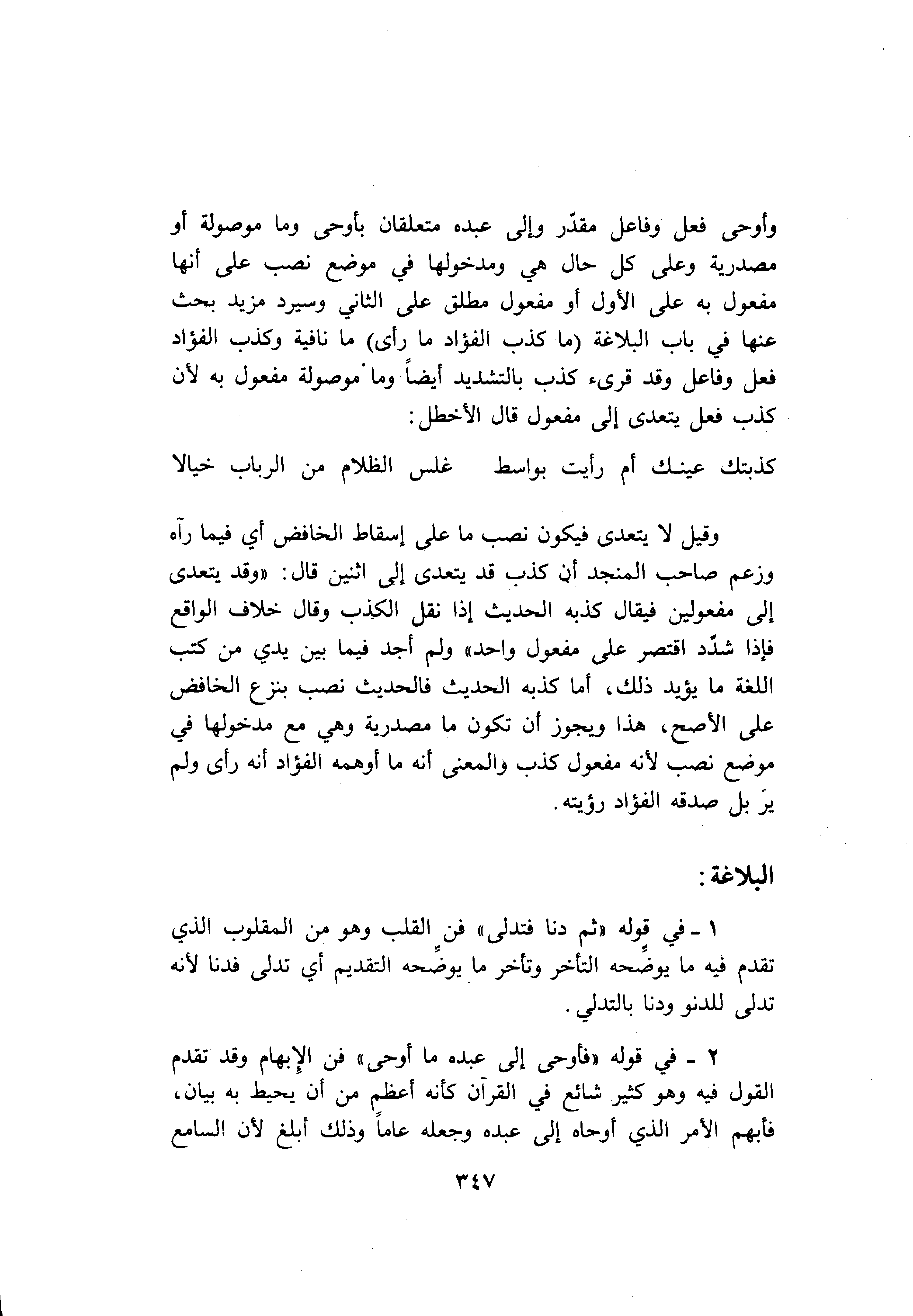 وأوحى فعل وفاعل مقدّر وإلى عبده متعلقان بأوحى وما موصولة أو مصدرية وعلى كل حال هي ومدخولها في موضع نصب على أنها مفعول به على الأول أو مفعول مطلق على الثاني وسيرد مزيد بحث عنها في باب البلاغة (ما كَذَبَ الْفُؤادُ ما رَأى) ما نافية وكذب الفؤاد فعل وفاعل وقد قرئ كذب بالتشديد أيضا وما موصولة مفعول به لأن كذب فعل يتعدى إلى مفعول قال الأخطل: