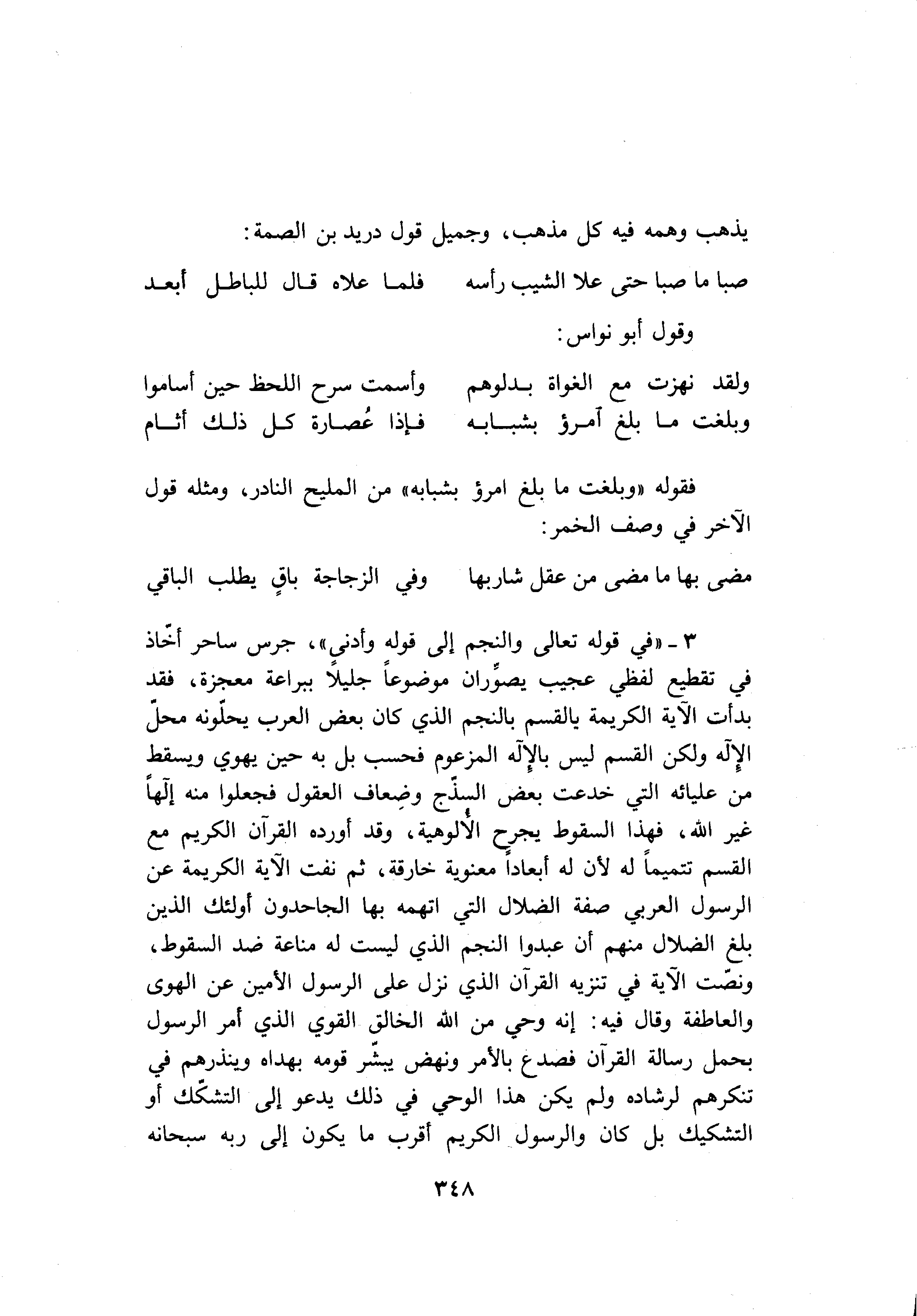3- «في قوله تعالى والنجم إلى قوله وأدنى» ، جرس ساحر أخّاذ في تقطيع لفظي عجيب يصوّران موضوعا جليلا ببراعة معجزة، فقد بدأت الآية الكريمة بالقسم بالنجم الذي كان بعض العرب يحلّونه محلّ الإله ولكن القسم ليس بالإله المزعوم فحسب بل به حين يهوي ويسقط من عليائه التي خدعت بعض السذّج وضعاف العقول فجعلوا منه إلها غير الله، فهذا السقوط يجرح الألوهية، وقد أورده القرآن الكريم مع القسم تتميما له لأن له أبعادا معنوية خارقة، ثم نفت الآية الكريمة عن الرسول العربي صفة الضلال التي اتهمه بها الجاحدون أولئك الذين بلغ الضلال منهم أن عبدوا النجم الذي ليست له مناعة ضد السقوط، ونصّت الآية في تنزيه القرآن الذي نزل على الرسول الأمين عن الهوى والعاطفة وقال فيه: إنه وحي من الله الخالق القوي الذي أمر الرسول بحمل رسالة القرآن فصدع بالأمر ونهض يبشّر قومه بهداه وينذرهم في تنكرهم لرشاده ولم يكن هذا الوحي في ذلك يدعو إلى التشكّك أو التشكيك بل كان والرسول الكريم أقرب ما يكون إلى ربه سبحانه