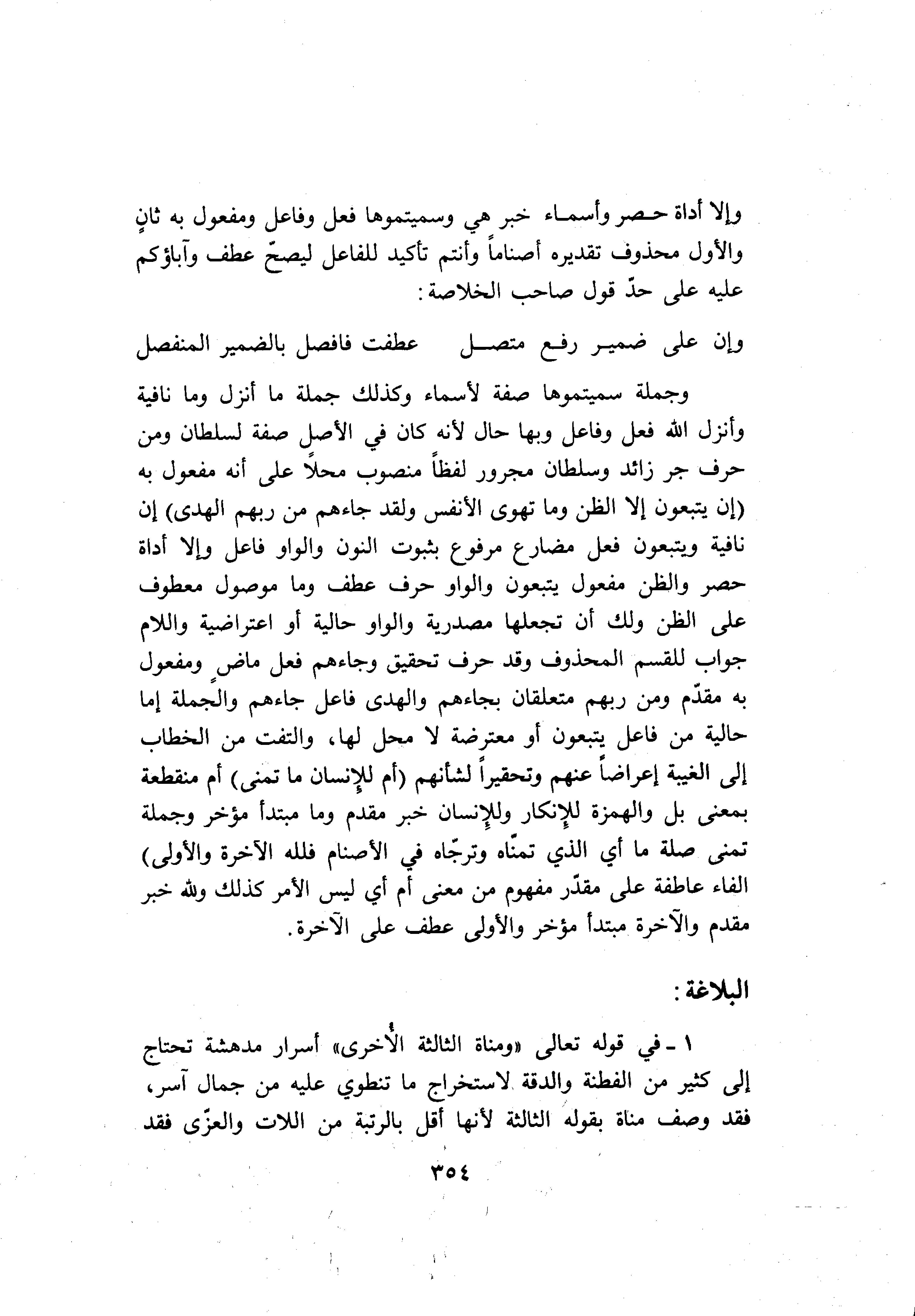 وجملة سميتموها صفة لأسماء وكذلك جملة ما أنزل وما نافية وأنزل الله فعل وفاعل وبها حال لأنه كان في الأصل صفة لسلطان ومن حرف جر زائد وسلطان مجرور لفظا منصوب محلا على أنه مفعول به (إِنْ يَتَّبِعُونَ إِلَّا الظَّنَّ وَما تَهْوَى الْأَنْفُسُ وَلَقَدْ جاءَهُمْ مِنْ رَبِّهِمُ الْهُدى) إن نافية ويتبعون فعل مضارع مرفوع بثبوت النون والواو فاعل وإلا أداة حصر والظن مفعول يتبعون والواو حرف عطف وما موصول معطوف على الظن ولك أن تجعلها مصدرية والواو حالية أو اعتراضية واللام جواب للقسم المحذوف وقد حرف تحقيق وجاءهم فعل ماض ومفعول به مقدّم ومن ربهم متعلقان بجاءهم والهدى فاعل جاءهم والجملة إما حالية من فاعل يتبعون أو معترضة لا محل لها، والتفت من الخطاب إلى الغيبة إعراضا عنهم وتحقيرا لشأنهم (أَمْ لِلْإِنْسانِ ما تَمَنَّى) أم منقطعة بمعنى بل والهمزة للإنكار وللإنسان خبر مقدم وما مبتدأ مؤخر وجملة تمنى صلة ما أي الذي تمنّاه وترجّاه في الأصنام (فَلِلَّهِ الْآخِرَةُ وَالْأُولى) الفاء عاطفة على مقدّر مفهوم من معنى أم أي ليس الأمر كذلك ولله خبر مقدم والآخرة مبتدأ مؤخر والأولى عطف على الآخرة.