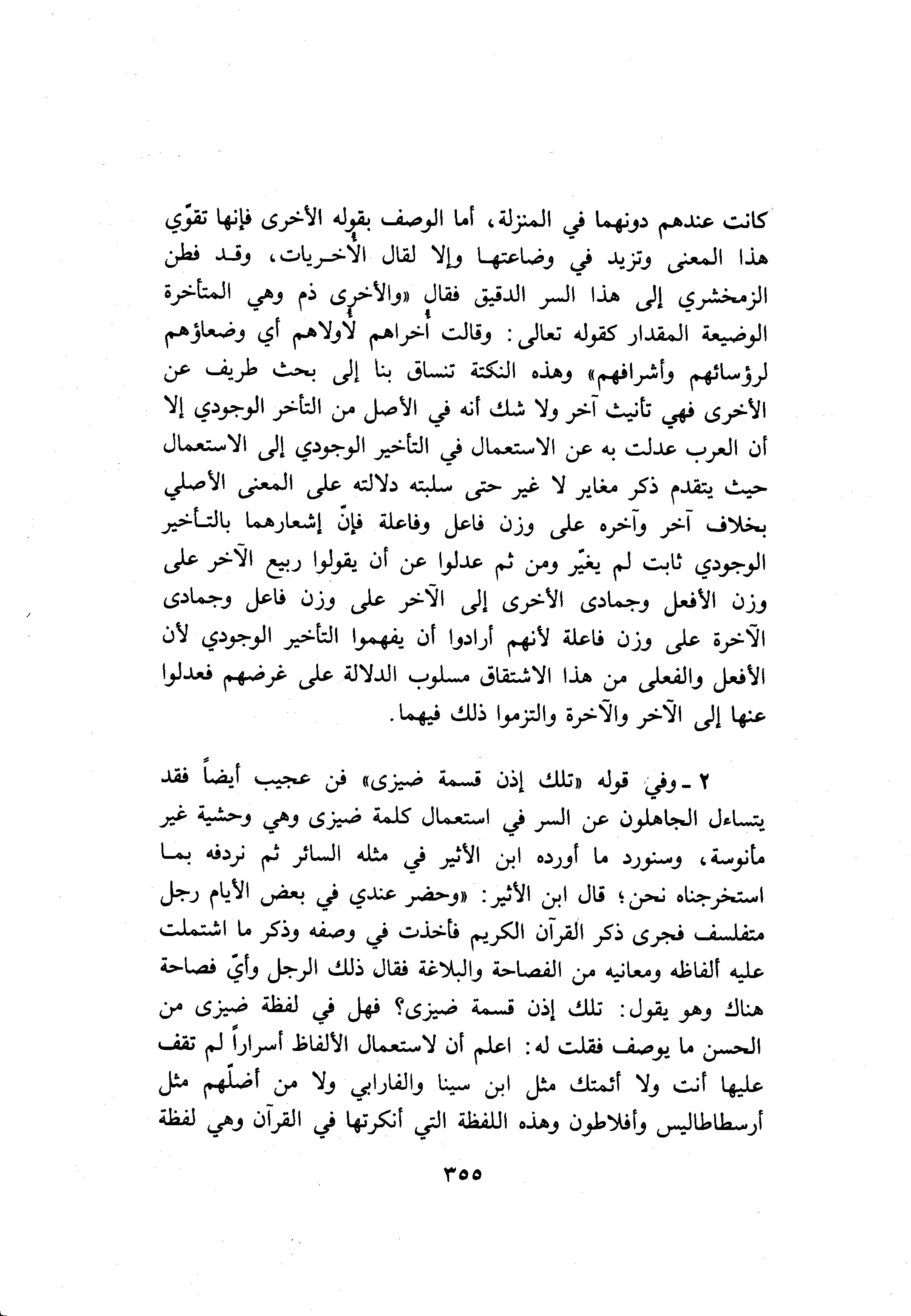 كانت عندهم دونهما في المنزلة، أما الوصف بقوله الأخرى فإنها تقوّي هذا المعنى وتزيد في وضاعتها وإلا لقال الأخريات، وقد فطن الزمخشري إلى هذا السر الدقيق فقال «والأخرى ذم وهي المتأخرة الوضيعة المقدار كقوله تعالى: وقالت أخراهم لأولاهم أي وضعاؤهم لرؤسائهم، وأشرافهم» وهذه النكتة تنساق بنا إلى بحث طريف عن الأخرى فهي تأنيث آخر ولا شك أنه في الأصل من التأخر الوجودي إلا أن العرب عدلت به عن الاستعمال في التأخير الوجودي إلى الاستعمال حيث يتقدم ذكر مغاير لا غير حتى سلبته دلالته على المعنى الأصلي بخلاف آخر وآخره على وزن فاعل وفاعلة فإنّ إشعارهما بالتأخير الوجودي ثابت لم يغيّر ومن ثم عدلوا عن أن يقولوا ربيع الآخر على وزن الأفعل وجمادى الأخرى إلى الآخر على وزن فاعل وجمادى الآخرة على وزن فاعلة لأنهم أرادوا أن يفهموا التأخير الوجودي لأن الأفعل والفعلى من هذا الاشتقاق مسلوب الدلالة على غرضهم فعدلوا عنها إلى الآخر والآخرة والتزموا ذلك فيهما.