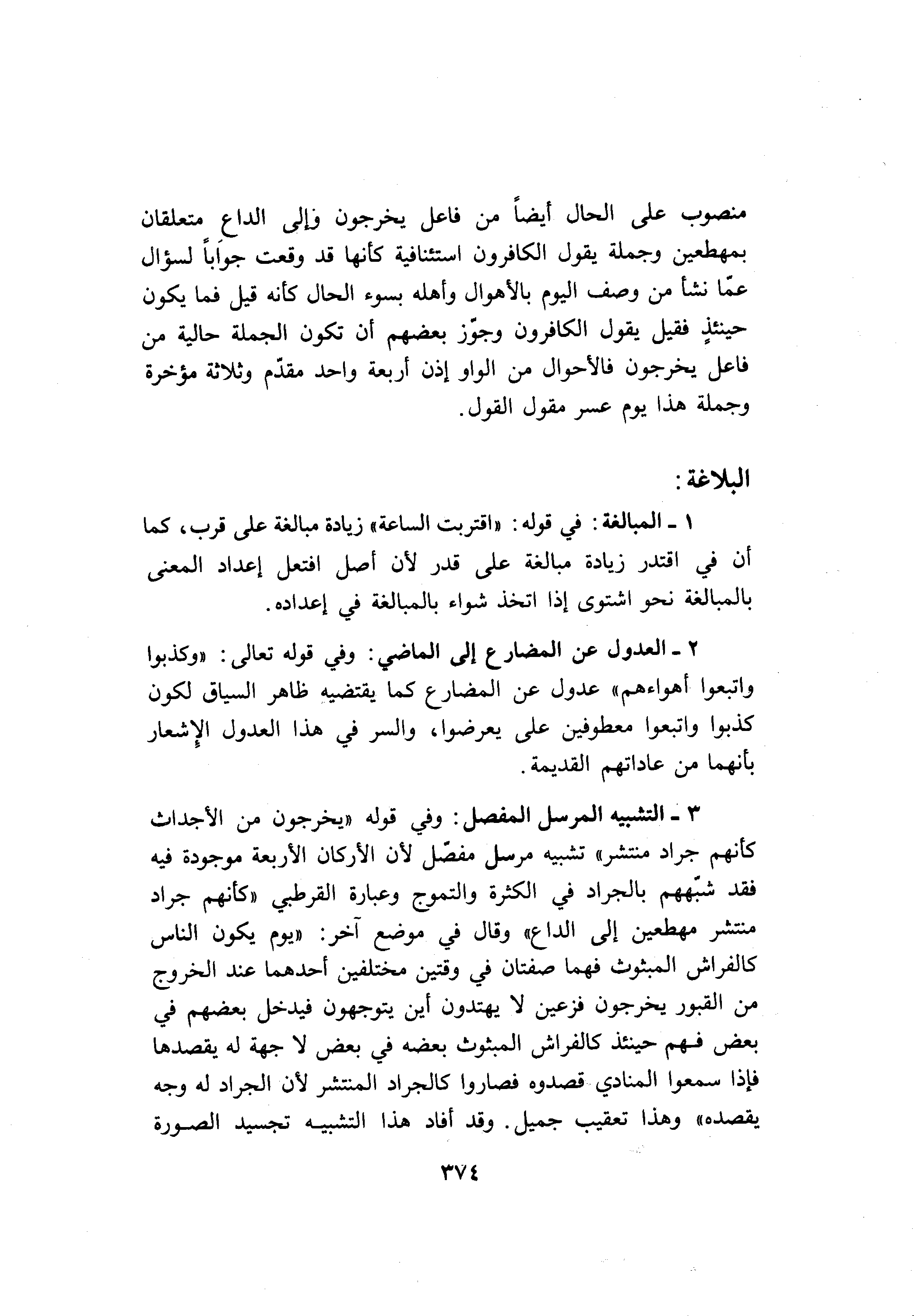 3- التشبيه المرسل المفصل: وفي قوله «يخرجون من الأجداث كأنهم جراد منتشر» تشبيه مرسل مفصّل لأن الأركان الأربعة موجودة فيه فقد شبّههم بالجراد في الكثرة والتموج وعبارة القرطبي «كأنهم جراد منتشر مهطعين إلى الداع» وقال في موضع آخر: «يوم يكون الناس كالفراش المبثوث فهما صفتان في وقتين مختلفين أحدهما عند الخروج من القبور يخرجون فزعين لا يهتدون أين يتوجهون فيدخل بعضهم في بعض فهم حينئذ كالفراش المبثوث بعضه في بعض لا جهة له يقصدها فإذا سمعوا المنادي قصدوه فصاروا كالجراد المنتشر لأن الجراد له وجه يقصده» وهذا تعقيب جميل. وقد أفاد هذا التشبيه تجسيد الصورة