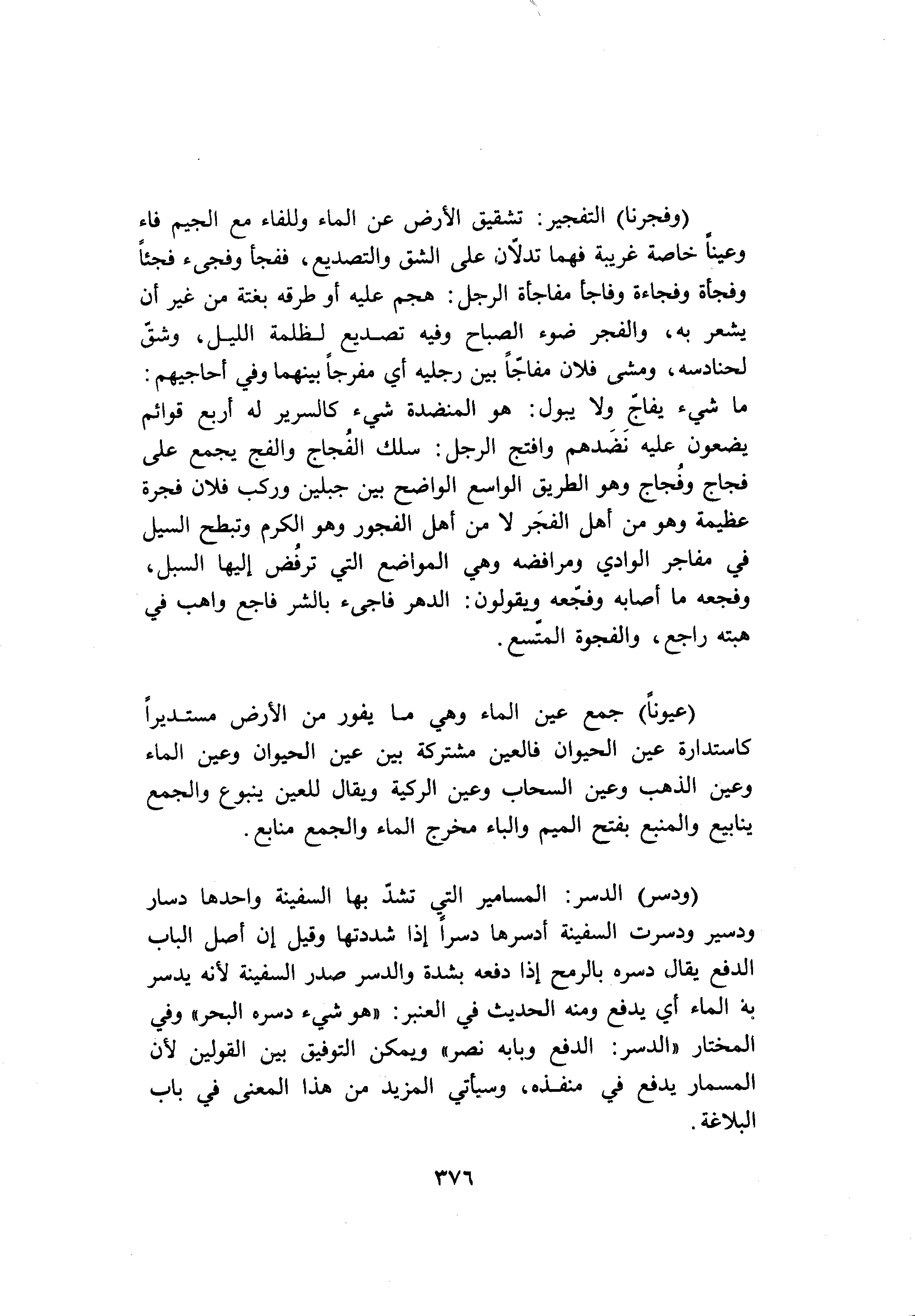 ما شيء يفاجّ ولا يبول: هو المنضدة شيء كالسرير له أربع قوائم يضعون عليه نضدهم وافتج الرجل: سلك الفجاج والفج يجمع على فجاج وفجاج وهو الطريق الواسع الواضح بين جبلين وركب فلان فجرة عظيمة وهو من أهل الفجر لا من أهل الفجور وهو الكرم وتبطح السيل في مفاجر الوادي ومرافضه وهي المواضع التي ترفض إليها السبل، وفجعه ما أصابه وفجّعه ويقولون: الدهر فاجئ بالشر فاجع واهب في هبته راجع، والفجوة المتّسع.