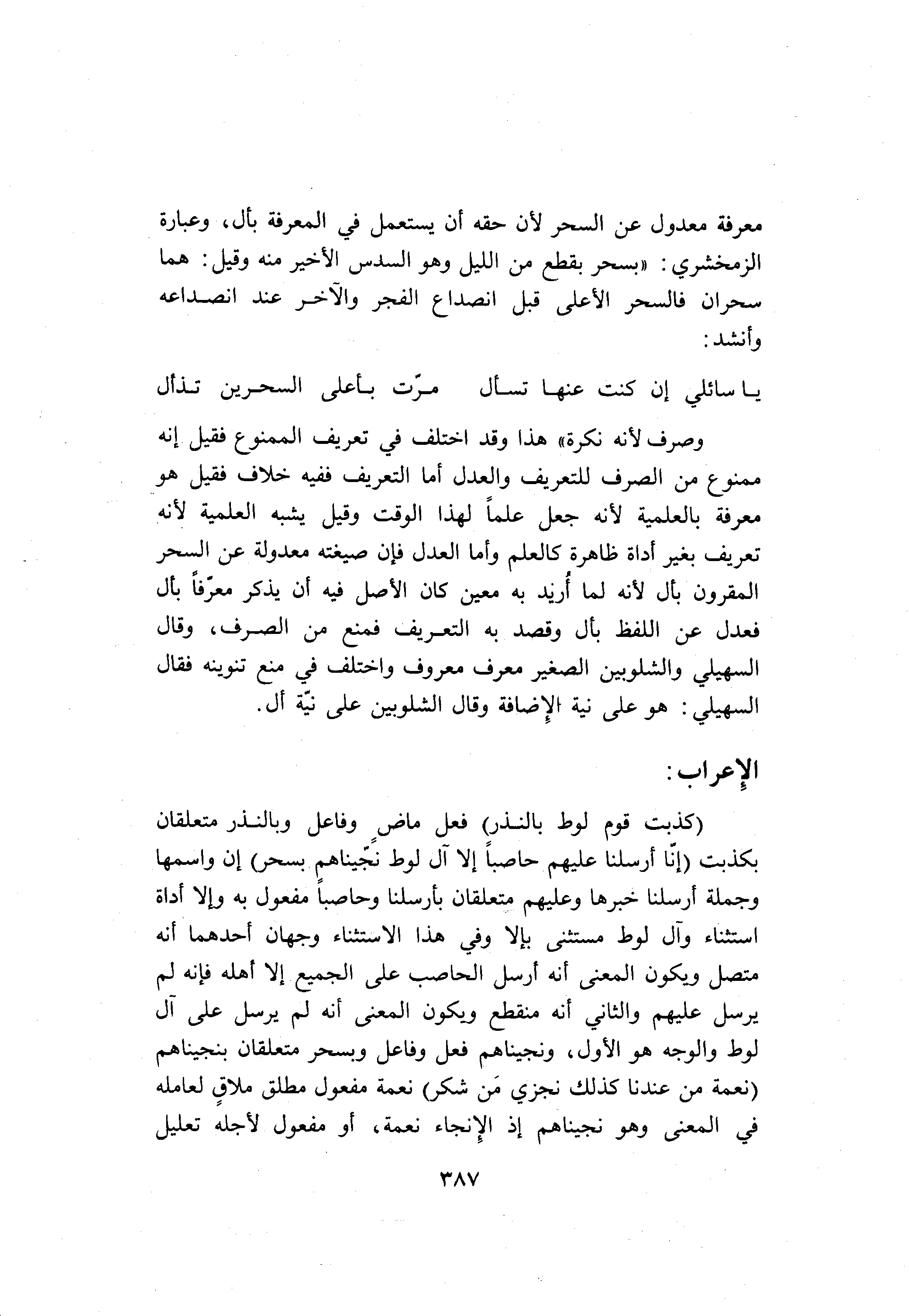 معرفة معدول عن السحر لأن حقه أن يستعمل في المعرفة بأل، وعبارة الزمخشري: «بسحر بقطع من الليل وهو السدس الأخير منه وقيل: هما سحران فالسحر الأعلى قبل انصداع الفجر والآخر عند انصداعه وأنشد: