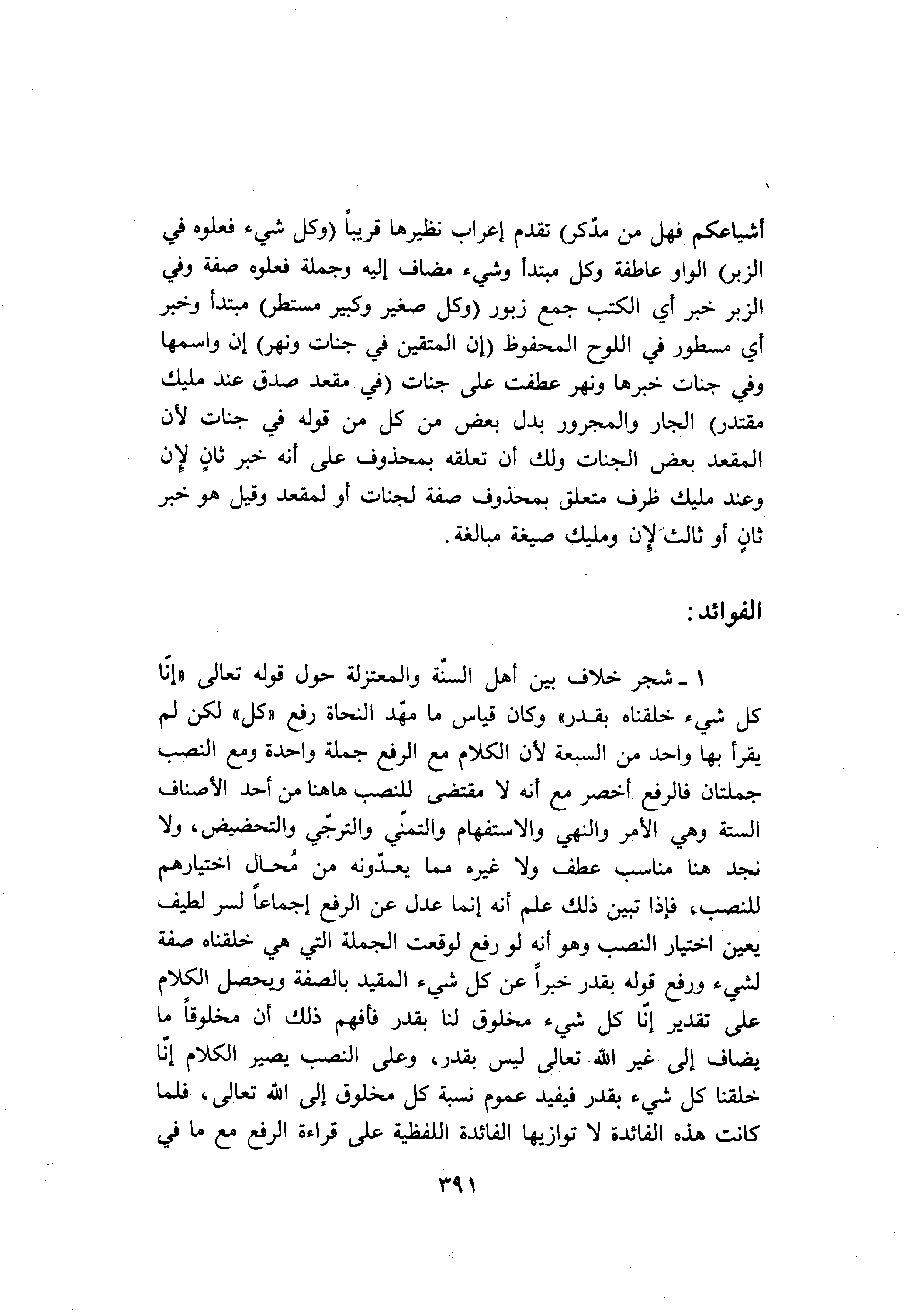 1- شجر خلاف بين أهل السنّة والمعتزلة حول قوله تعالى «إنّا كل شيء خلقناه بقدر» وكان قياس ما مهّد النحاة رفع «كل» لكن لم يقرأ بها واحد من السبعة لأن الكلام مع الرفع جملة واحدة ومع النصب جملتان فالرفع أخصر مع أنه لا مقتضى للنصب هاهنا من أحد الأصناف الستة وهي الأمر والنهي والاستفهام والتمنّي والترجّي والتحضيض، ولا نجد هنا مناسب عطف ولا غيره مما يعدّونه من محال اختيارهم للنصب، فإذا تبين ذلك علم أنه إنما عدل عن الرفع إجمالا لسر لطيف يعين اختيار النصب وهو أنه لو رفع لوقعت الجملة التي هي خلقناه صفة لشيء ورفع قوله بقدر خبرا عن كل شيء المقيد بالصفة ويحصل الكلام على تقدير إنّا كل شيء مخلوق لنا بقدر فأفهم ذلك أن مخلوقا ما يضاف إلى غير الله تعالى ليس بقدر، وعلى النصب يصير الكلام إنّا خلقنا كل شيء بقدر فيفيد عموم نسبة كل مخلوق إلى الله تعالى، فلما كانت هذه الفائدة لا توازيها الفائدة اللفظية على قراءة الرفع مع ما في