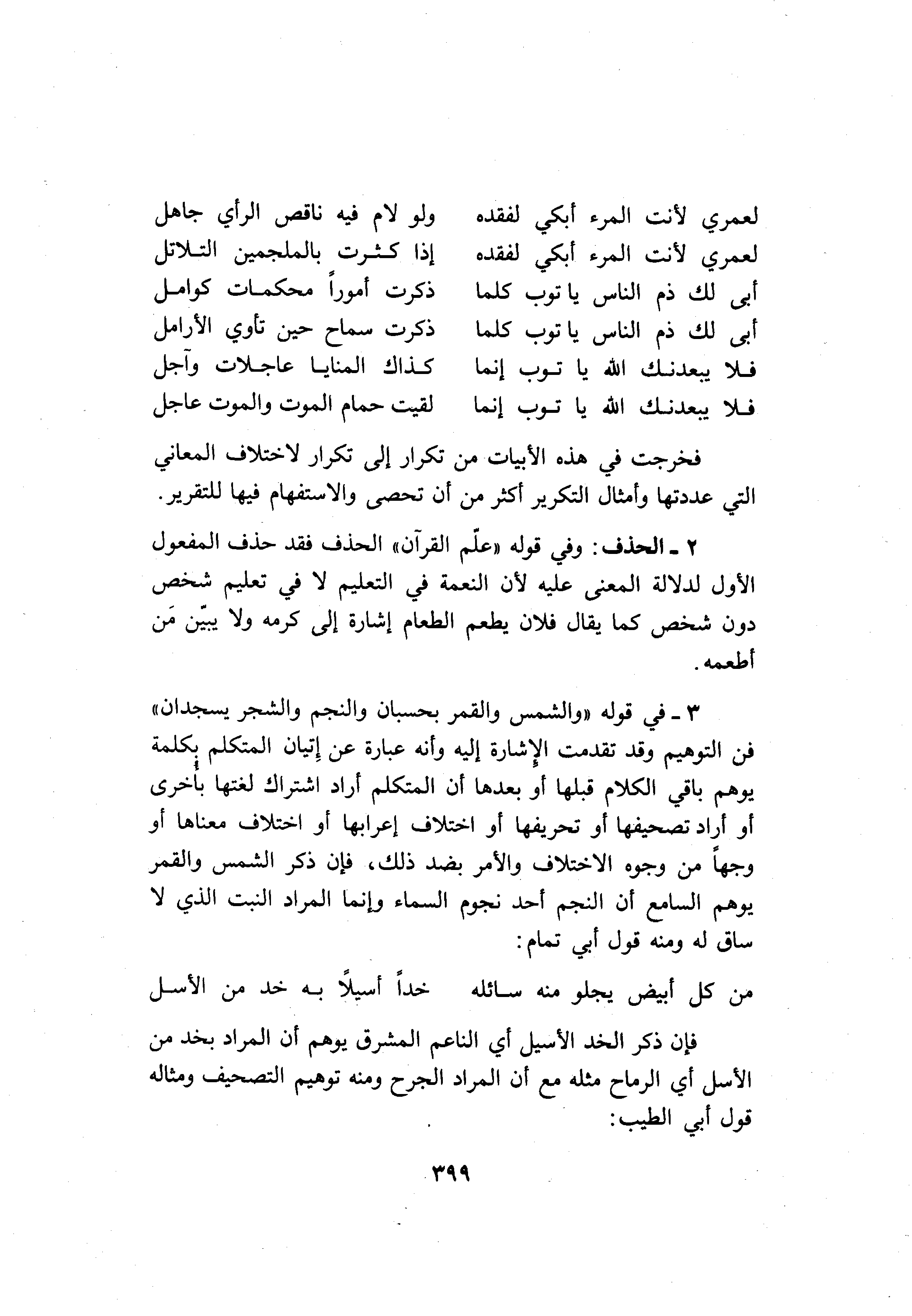 3- في قوله «والشمس والقمر بحسبان والنجم والشجر يسجدان» فن التوهيم وقد تقدمت الإشارة إليه وأنه عبارة عن إتيان المتكلم بكلمة يوهم باقي الكلام قبلها أو بعدها أن المتكلم أراد اشتراك لغتها بأخرى أو أراد تصحيفها أو تحريفها أو اختلاف إعرابها أو اختلاف معناها أو وجها من وجوه الاختلاف والأمر بضد ذلك، فإن ذكر الشمس والقمر يوهم السامع أن النجم أحد نجوم السماء وإنما المراد النبت الذي لا ساق له ومنه قول أبي تمام: