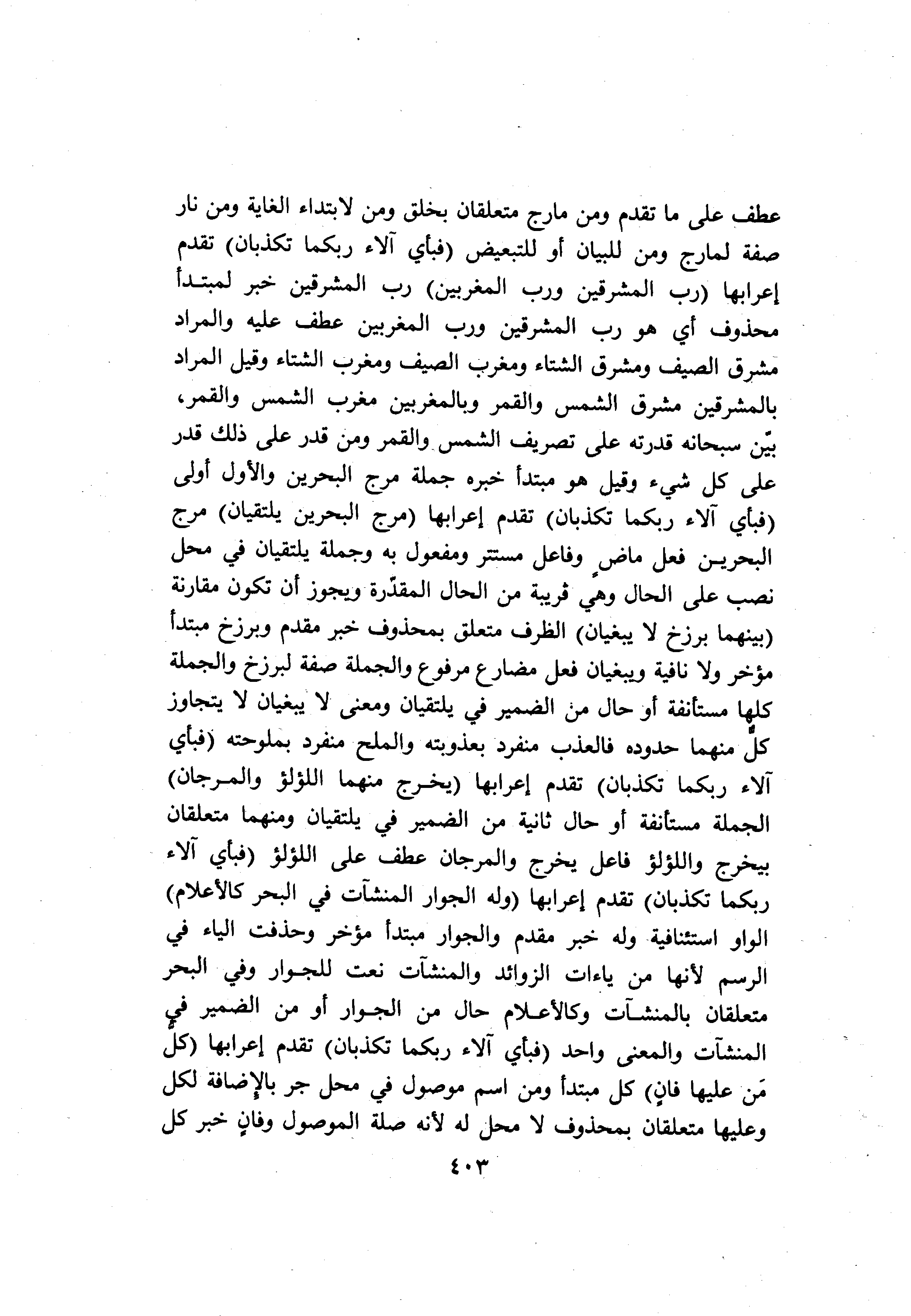عطف على ما تقدم ومن مارج متعلقان بخلق ومن لابتداء الغاية ومن نار صفة لمارج ومن للبيان أو للتبعيض (فَبِأَيِّ آلاءِ رَبِّكُما تُكَذِّبانِ) تقدم إعرابها (رَبُّ الْمَشْرِقَيْنِ وَرَبُّ الْمَغْرِبَيْنِ) رب المشرقين خبر لمبتدأ محذوف أي هو رب المشرقين ورب المغربين عطف عليه والمراد مشرق الصيف ومشرق الشتاء ومغرب الصيف ومغرب الشتاء وقيل المراد بالمشرقين مشرق الشمس والقمر وبالمغربين مغرب الشمس والقمر، بيّن سبحانه قدرته على تصريف الشمس والقمر ومن قدر على ذلك قدر على كل شيء وقيل هو مبتدأ خبره جملة مرج البحرين والأول أولى (فَبِأَيِّ آلاءِ رَبِّكُما تُكَذِّبانِ) تقدم إعرابها (مَرَجَ الْبَحْرَيْنِ يَلْتَقِيانِ) مرج البحرين فعل ماض وفاعل مستتر ومفعول به وجملة يلتقيان في محل نصب على الحال وهي قريبة من الحال المقدّرة ويجوز أن تكون مقارنة (بَيْنَهُما بَرْزَخٌ لا يَبْغِيانِ) الظرف متعلق بمحذوف خبر مقدم وبرزخ مبتدأ مؤخر ولا نافية ويبغيان فعل مضارع مرفوع والجملة صفة لبرزخ والجملة كلها مستأنفة أو حال من الضمير في يلتقيان ومعنى لا يبغيان لا يتجاوز كلّ منهما حدوده فالعذب منفرد بعذوبته والملح منفرد بملوحته (فَبِأَيِّ آلاءِ رَبِّكُما تُكَذِّبانِ) تقدم إعرابها (يَخْرُجُ مِنْهُمَا اللُّؤْلُؤُ وَالْمَرْجانُ) الجملة مستأنفة أو حال ثانية من الضمير في يلتقيان ومنهما متعلقان بيخرج واللؤلؤ فاعل يخرج والمرجان عطف على اللؤلؤ (فَبِأَيِّ آلاءِ رَبِّكُما تُكَذِّبانِ) تقدم إعرابها (وَلَهُ الْجَوارِ الْمُنْشَآتُ فِي الْبَحْرِ كَالْأَعْلامِ) الواو استئنافية وله خبر مقدم والجوار مبتدأ مؤخر وحذفت الياء في الرسم لأنها من ياءات الزوائد والمنشآت نعت للجوار وفي البحر متعلقان بالمنشئات وكالأعلام حال من الجوار أو من الضمير في المنشآت والمعنى واحد (فَبِأَيِّ آلاءِ رَبِّكُما تُكَذِّبانِ) تقدم إعرابها (كُلُّ مَنْ عَلَيْها فانٍ) كل مبتدأ ومن اسم موصول في محل جر بالإضافة لكل وعليها متعلقان بمحذوف لا محل له لأنه صلة الموصول وفان خبر كل