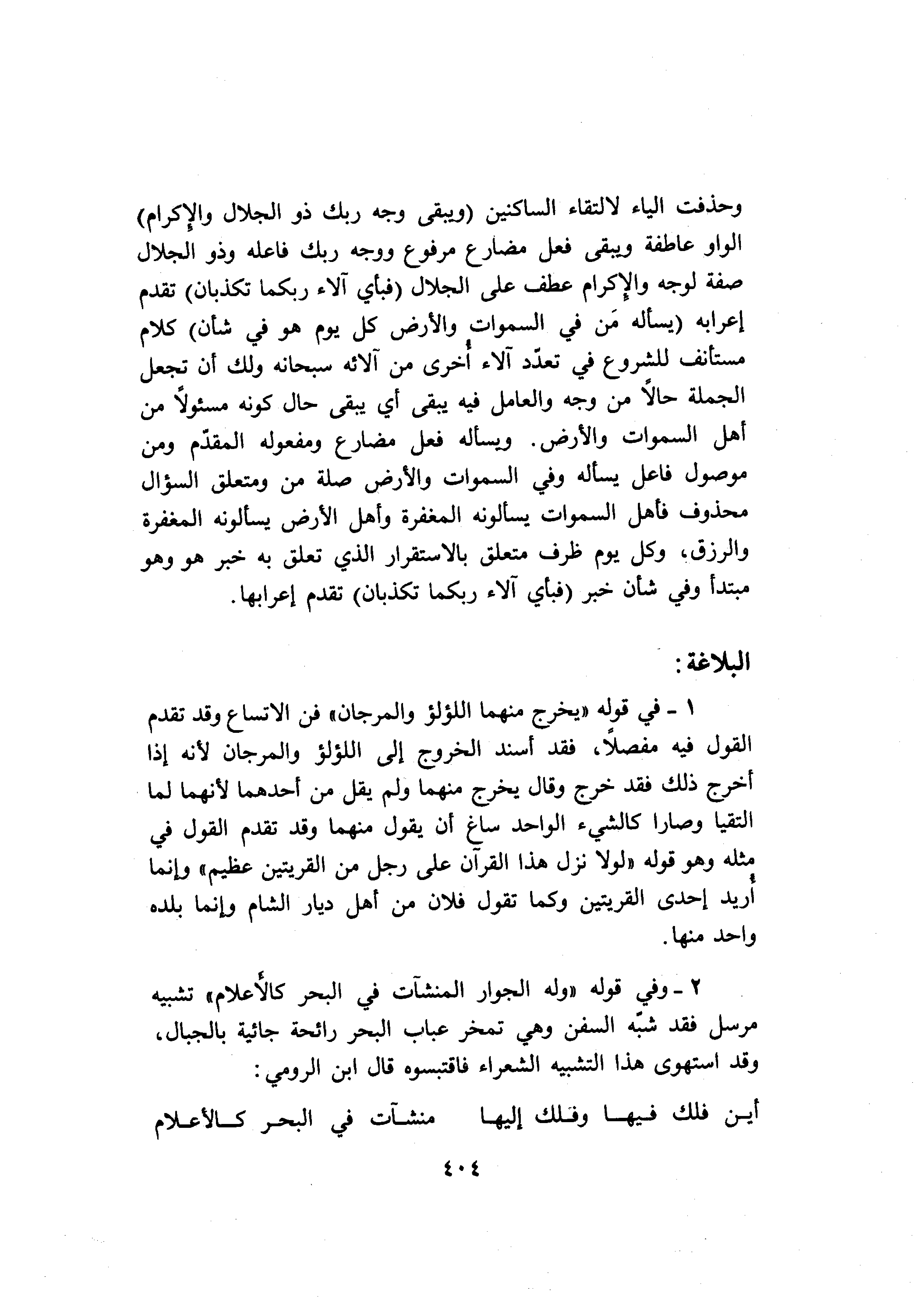 1- في قوله «يخرج منهما اللؤلؤ والمرجان» فن الاتساع وقد تقدم القول فيه مفصلا، فقد أسند الخروج إلى اللؤلؤ والمرجان لأنه إذا أخرج ذلك فقد خرج وقال يخرج منهما ولم يقل من أحدهما لأنهما لما التقيا وصارا كالشيء الواحد ساغ أن يقول منهما وقد تقدم القول في مثله وهو قوله «لولا نزل هذا القرآن على رجل من القريتين عظيم» وإنما أريد إحدى القريتين وكما تقول فلان من أهل ديار الشام وإنما بلده واحد منها.