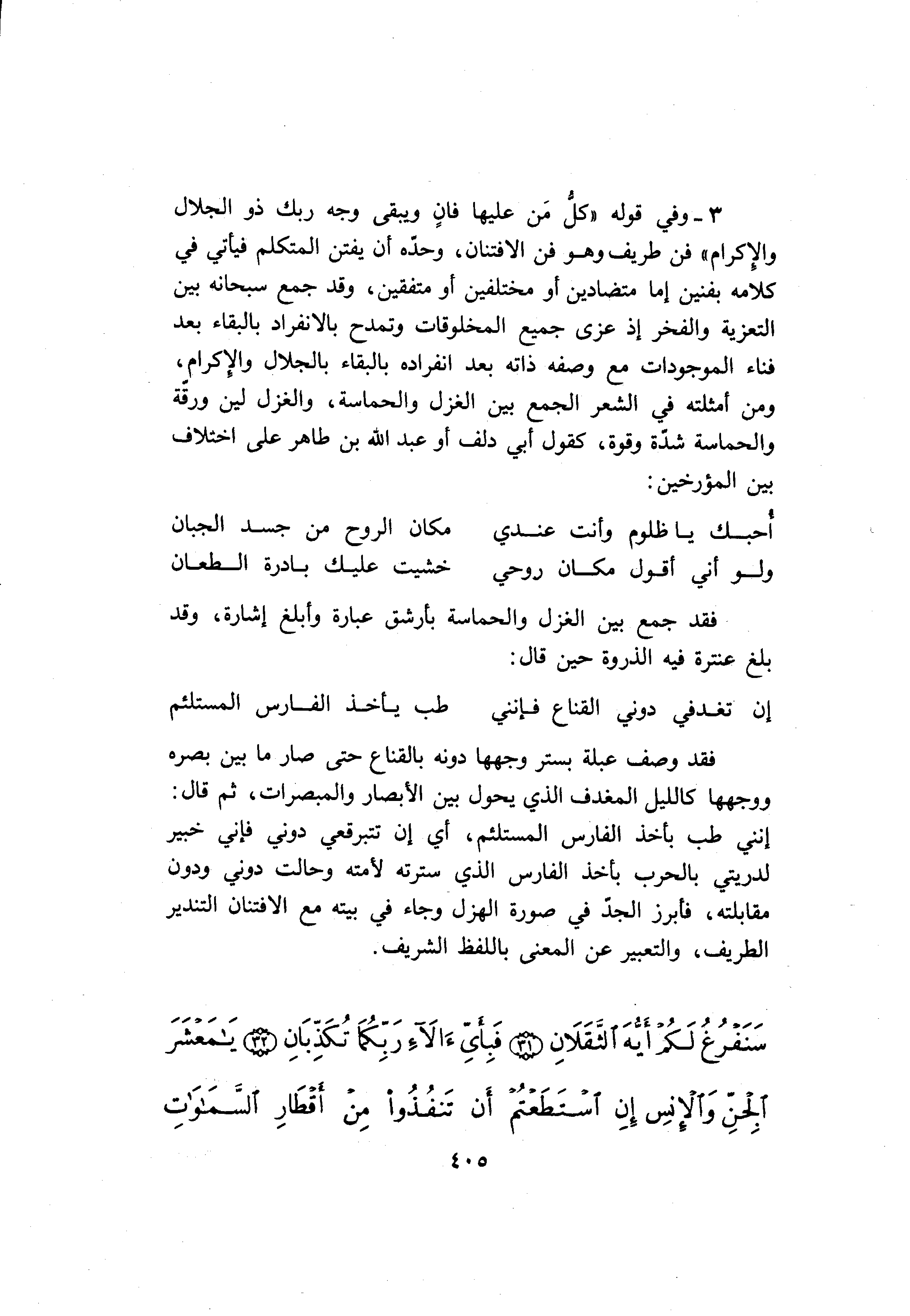 3- وفي قوله «كل من عليها فان ويبقى وجه ربك ذو الجلال والإكرام» فن طريف وهو فن الافتنان، وحدّه أن يفتن المتكلم فيأتي في كلامه بفنين إما متضادين أو مختلفين أو متفقين، وقد جمع سبحانه بين التعزية والفخر إذ عزى جميع المخلوقات وتمدح بالانفراد بالبقاء بعد فناء الموجودات مع وصفه ذاته بعد انفراده بالبقاء بالجلال والإكرام، ومن أمثلته في الشعر الجمع بين الغزل والحماسة، والغزل لين ورقّة والحماسة شدّة وقوة، كقول أبي دلف أو عبد الله بن طاهر على اختلاف بين المؤرخين: