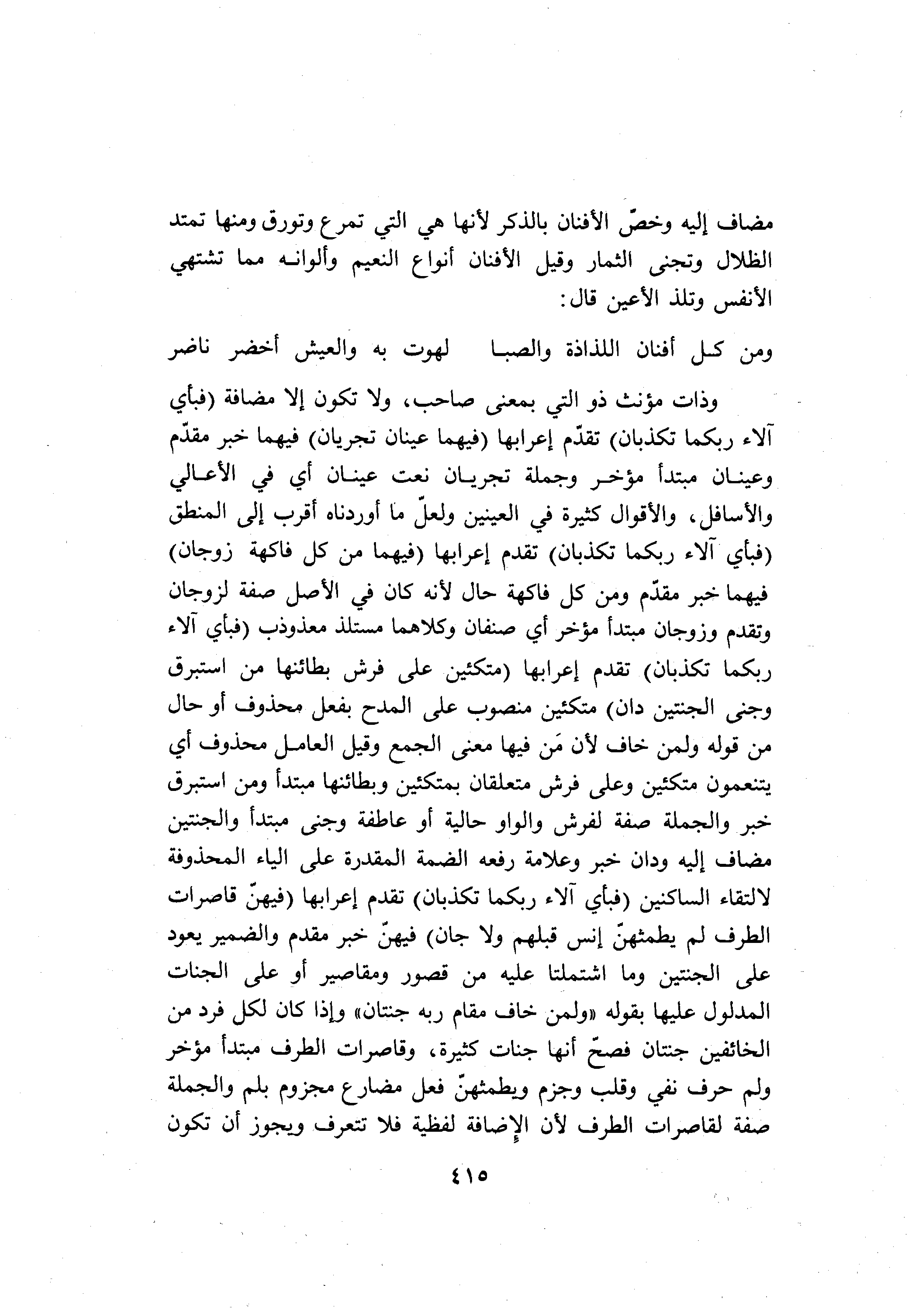 وذات مؤنث ذو التي بمعنى صاحب، ولا تكون إلا مضافة (فَبِأَيِّ آلاءِ رَبِّكُما تُكَذِّبانِ) تقدّم إعرابها (فِيهِما عَيْنانِ تَجْرِيانِ) فيهما خبر مقدّم وعينان مبتدأ مؤخر وجملة تجريان نعت عينان أي في الأعالي والأسافل، والأقوال كثيرة في العينين ولعلّ ما أوردناه أقرب إلى المنطق (فَبِأَيِّ آلاءِ رَبِّكُما تُكَذِّبانِ) تقدم إعرابها (فِيهِما مِنْ كُلِّ فاكِهَةٍ زَوْجانِ) فيهما خبر مقدّم ومن كل فاكهة حال لأنه كان في الأصل صفة لزوجان وتقدم وزوجان مبتدأ مؤخر أي صنفان وكلاهما مستلذ معذوذب (فَبِأَيِّ آلاءِ رَبِّكُما تُكَذِّبانِ) تقدم إعرابها (مُتَّكِئِينَ عَلى فُرُشٍ بَطائِنُها مِنْ إِسْتَبْرَقٍ وَجَنَى الْجَنَّتَيْنِ دانٍ) متكئين منصوب على المدح بفعل محذوف أو حال من قوله ولمن خاف لأن من فيها معنى الجمع وقيل العامل محذوف أي يتنعمون متكئين وعلى فرش متعلقان بمتكئين وبطائنها مبتدأ ومن إستبرق خبر والجملة صفة لفرش والواو حالية أو عاطفة وجنى مبتدأ والجنتين مضاف إليه ودان خبر وعلامة رفعه الضمة المقدرة على الياء المحذوفة لالتقاء الساكنين (فَبِأَيِّ آلاءِ رَبِّكُما تُكَذِّبانِ) تقدم إعرابها (فِيهِنَّ قاصِراتُ الطَّرْفِ لَمْ يَطْمِثْهُنَّ إِنْسٌ قَبْلَهُمْ وَلا جَانٌّ) فيهنّ خبر مقدّم والضمير يعود على الجنتين وما اشتملتا عليه من قصور ومقاصير أو على الجنات المدلول عليها بقوله «ولمن خاف مقام ربه جنتان» وإذا كان لكل فرد من الخائفين جنتان فصحّ أنها جنات كثيرة، وقاصرات الطرف مبتدأ مؤخر ولم حرف نفي وقلب وجزم ويطمثهنّ فعل مضارع مجزوم بلم والجملة صفة لقاصرات الطرف لأن الإضافة لفظية فلا تتعرف ويجوز أن تكون