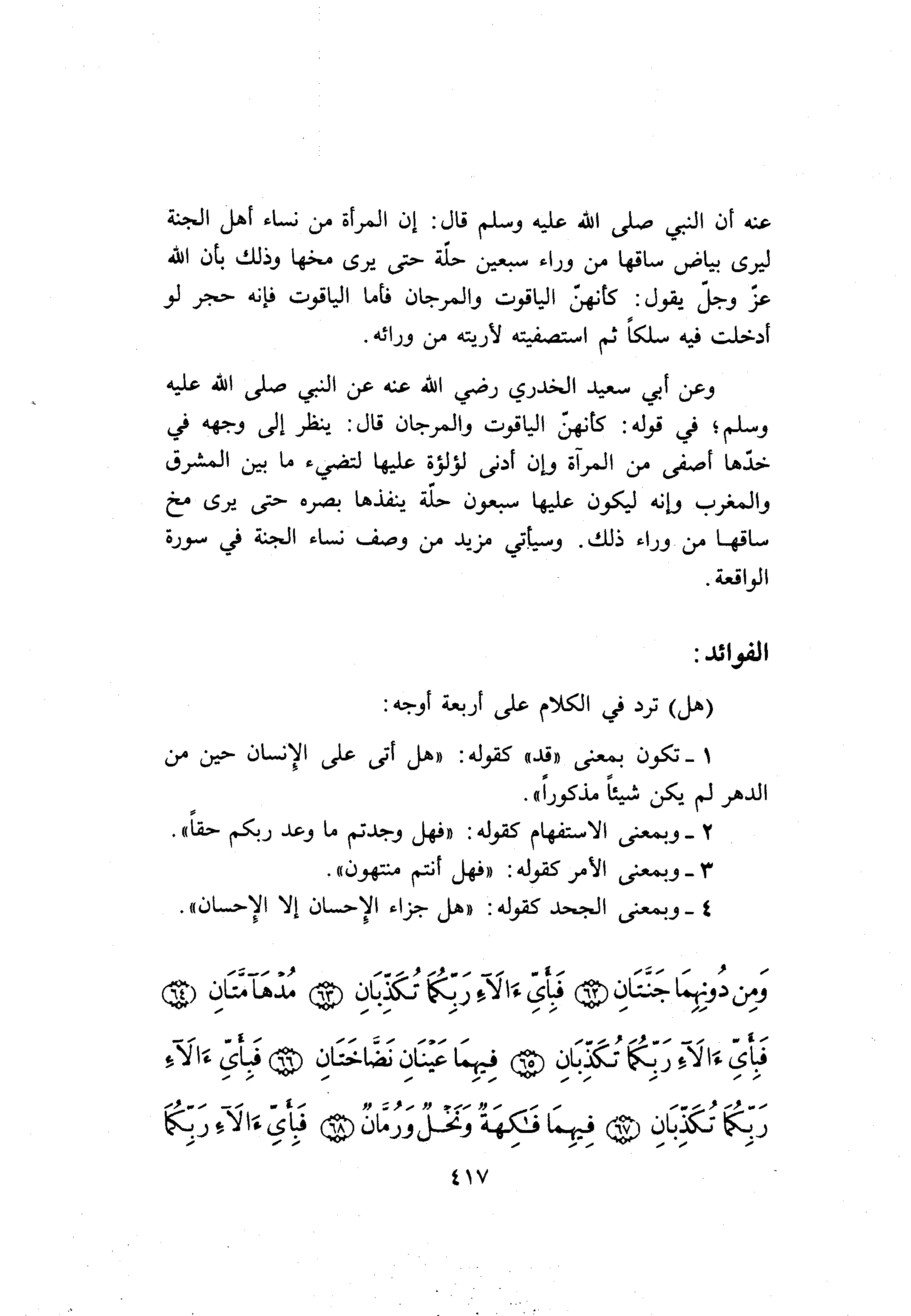 وعن أبي سعيد الخدري رضي الله عنه عن النبي صلى الله عليه وسلم في قوله: كأنهنّ الياقوت والمرجان قال: ينظر إلى وجهه في خدّها أصفى من المرآة وإن أدنى لؤلؤة عليها لتضيء ما بين المشرق والمغرب وإنه ليكون عليها سبعون حلّة ينفذها بصره حتى يرى مخ ساقها من وراء ذلك. وسيأتي مزيد من وصف نساء الجنة في سورة الواقعة.