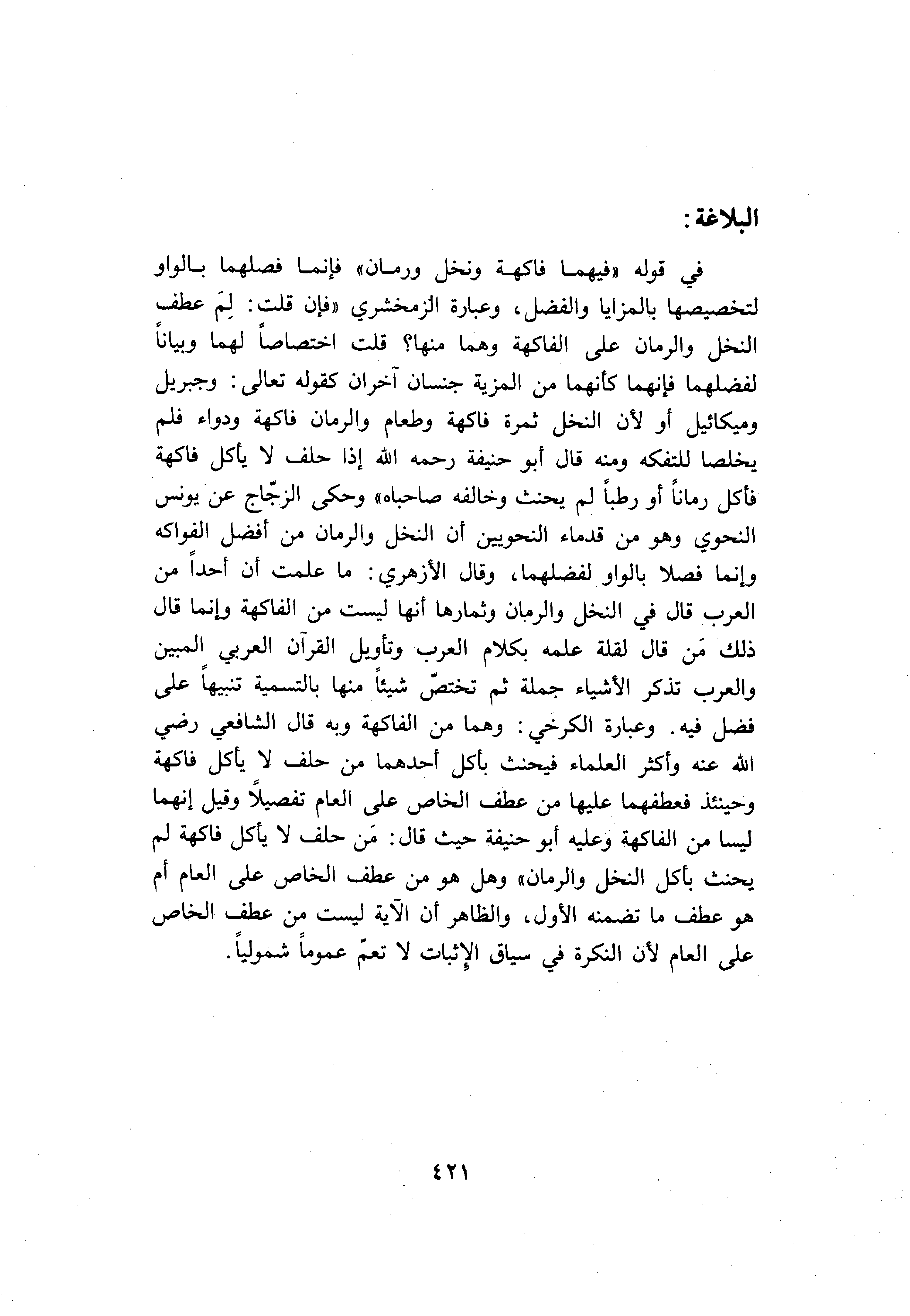 في قوله «فيهما فاكهة ونخل ورمان» فإنما فصلهما بالواو لتخصيصها بالمزايا والفضل، وعبارة الزمخشري «فإن قلت: لم عطف النخل والرمان على الفاكهة وهما منها؟ قلت اختصاصا لهما وبيانا لفضلهما فإنهما كأنهما من المزية جنسان آخران كقوله تعالى: وجبريل وميكائيل أو لأن النخل ثمرة فاكهة وطعام والرمان فاكهة ودواء فلم يخلصا للتفكه ومنه قال أبو حنيفة رحمة الله إذا حلف لا يأكل فاكهة فأكل رمانا أو رطبا لم يحنث وخالفه صاحباه» وحكى الزجّاج عن يونس النحوي وهو من قدماء النحويين أن النخل والرمان من أفضل الفواكه وإنما فصلا بالواو لفضلهما، وقال الأزهري: ما علمت أن أحدا من العرب قال في النخل والرمان وثمارها أنها ليست من الفاكهة وإنما قال ذلك من قال لقلة علمه بكلام العرب وتأويل القرآن العربي المبين والعرب تذكر الأشياء جملة ثم تختصّ شيئا منها بالتسمية تنبيها على فضل فيه. وعبارة الكرخي: وهما من الفاكهة وبه قال الشافعي رضي الله عنه وأكثر العلماء فيحنث بأكل أحدهما من حلف لا يأكل فاكهة وحينئذ فعطفهما عليها من عطف الخاص على العام تفصيلا وقيل إنهما ليسا من الفاكهة وعليه أبو حنيفة حيث قال: من حلف لا يأكل فاكهة لم يحنث بأكل النخل والرمان» وهل هو من عطف الخاص على العام أم هو عطف ما تضمنه الأول، والظاهر أن الآية ليست من عطف الخاص على العام لأن النكرة في سياق الإثبات لا تعمّ عموما شموليا.