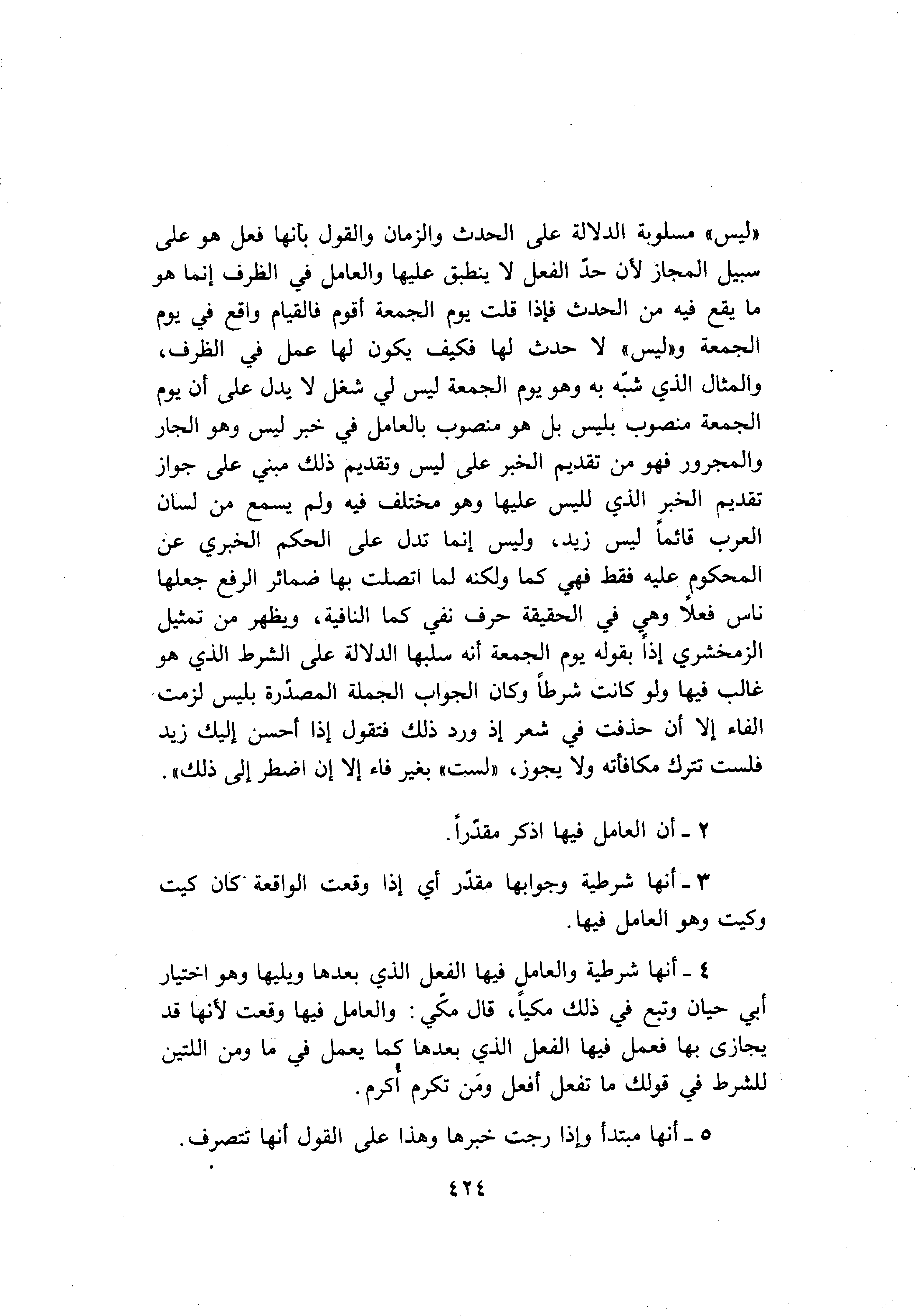 «ليس» مسلوبة الدلالة على الحدث والزمان والقول بأنها فعل هو على سبيل المجاز لأن حدّ الفعل لا ينطبق عليها والعامل في الظرف إنما هو ما يقع فيه من الحدث فإذا قلت يوم الجمعة أقوم فالقيام واقع في يوم الجمعة و «ليس» لا حدث لها فكيف يكون لها عمل في الظرف، والمثال الذي شبّه به وهو يوم الجمعة ليس لي شغل لا يدل على أن يوم الجمعة منصوب بليس بل هو منصوب بالعامل في خبر ليس وهو الجار والمجرور فهو من تقديم الخبر على ليس وتقديم ذلك مبني على جواز تقديم الخبر الذي لليس عليها وهو مختلف فيه ولم يسمع من لسان العرب قائما ليس زيد، وليس إنما تدل على الحكم الخبري عن المحكوم عليه فقط فهي كما ولكنه لما اتصلت بها ضمائر الرفع جعلها ناس فعلا وهي في الحقيقة حرف نفي كما النافية، ويظهر من تمثيل الزمخشري إذا بقوله يوم الجمعة أنه سلبها الدلالة على الشرط الذي هو غالب فيها ولو كانت شرطا وكان الجواب الجملة المصدّرة بليس لزمت الفاء إلا أن حذفت في شعر إذ ورد ذلك فتقول إذا أحسن إليك زيد فلست تترك مكافأته ولا يجوز، «لست» بغير فاء إلا إن اضطر إلى ذلك» .