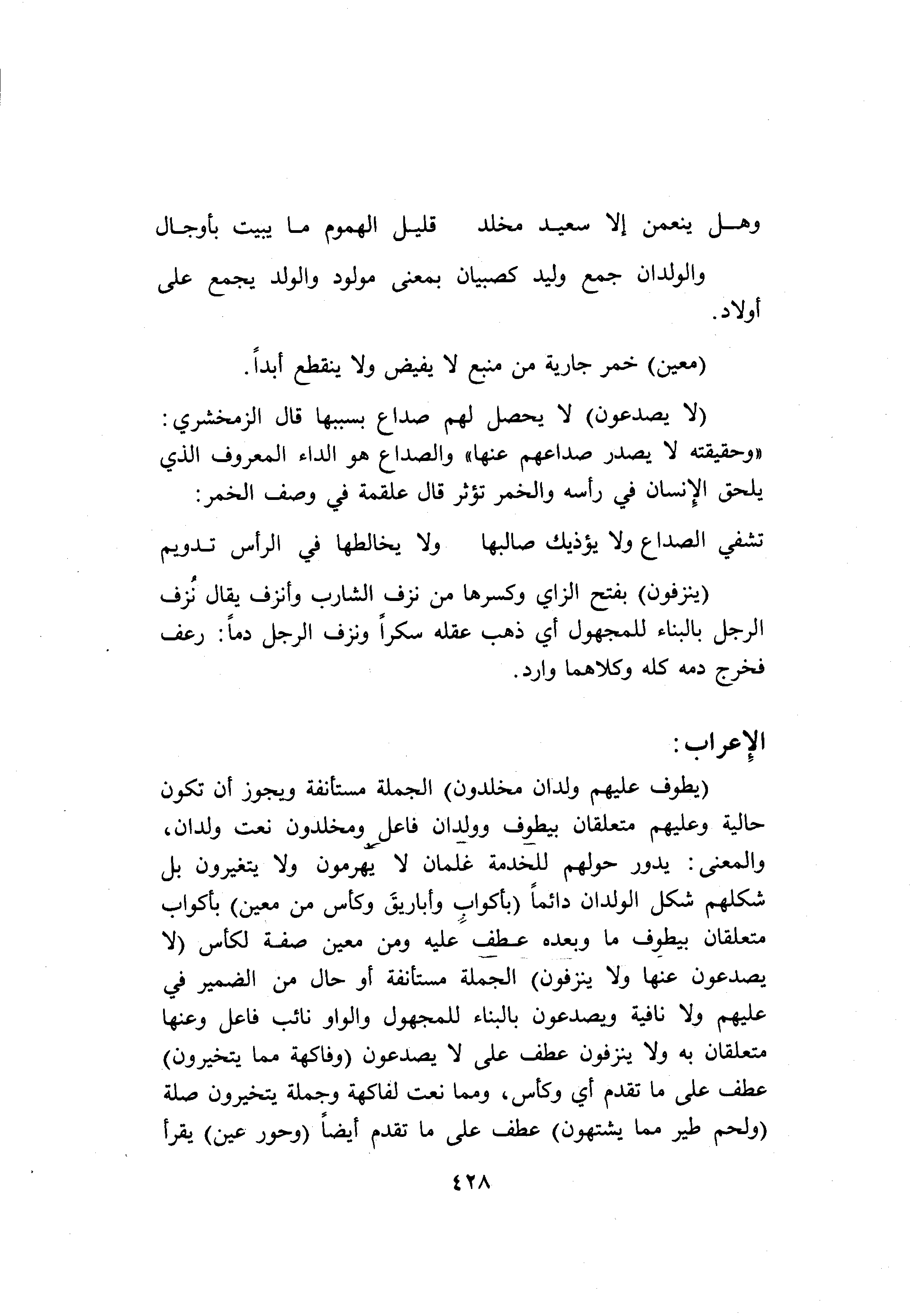 (يَطُوفُ عَلَيْهِمْ وِلْدانٌ مُخَلَّدُونَ) الجملة مستأنفة ويجوز أن تكون حالية وعليهم متعلقان بيطوف وولدان فاعل ومخلدون نعت ولدان، والمعنى: يدور حولهم للخدمة غلمان لا يهرمون ولا يتغيرون بل شكلهم شكل الولدان دائما (بِأَكْوابٍ وَأَبارِيقَ وَكَأْسٍ مِنْ مَعِينٍ) بأكواب متعلقان بيطوف ما وبعده عطف عليه ومن معين صفة لكأس (لا يُصَدَّعُونَ عَنْها وَلا يُنْزِفُونَ)