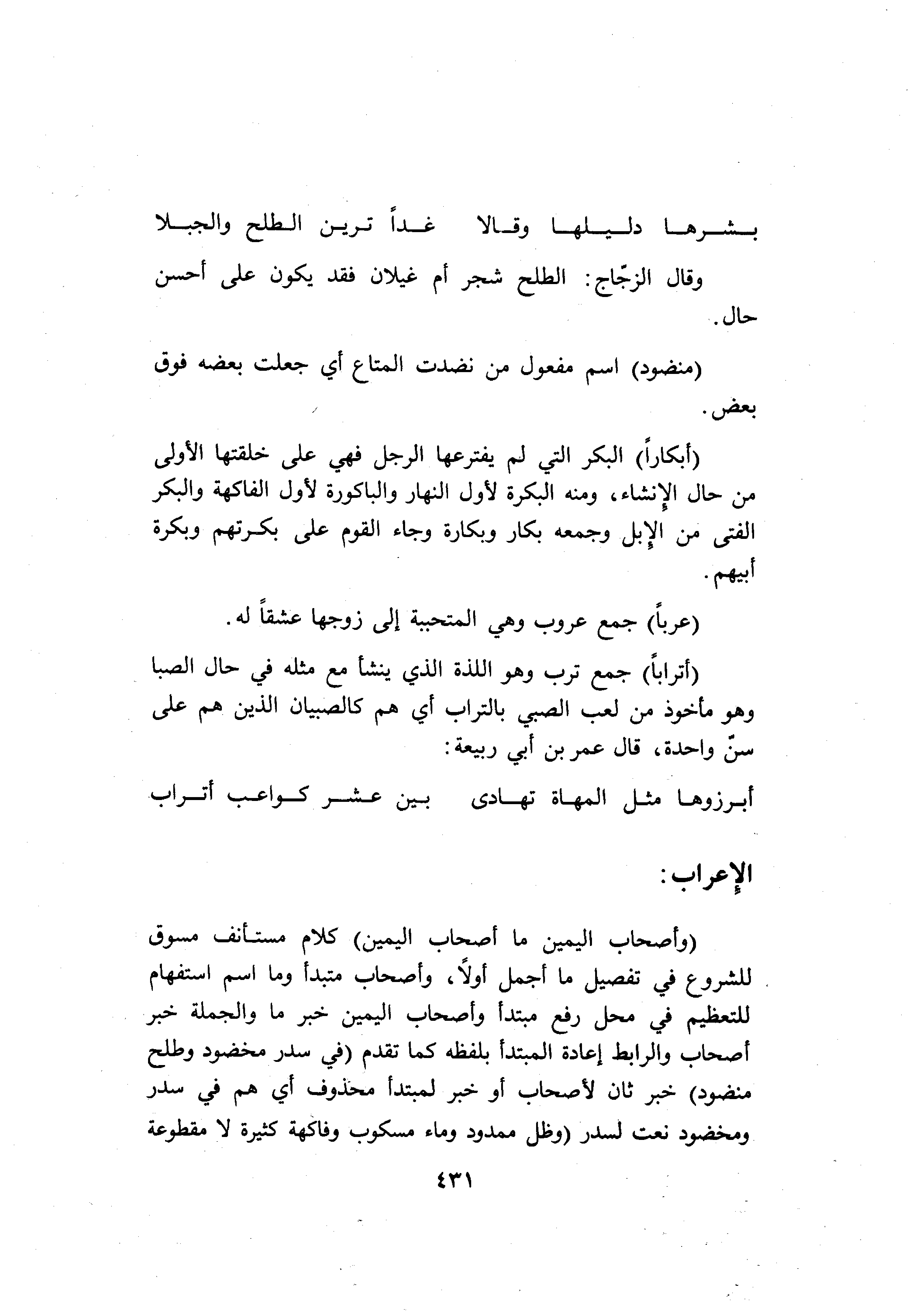 (وَأَصْحابُ الْيَمِينِ ما أَصْحابُ الْيَمِينِ) كلام مستأنف مسوق للشروع في تفصيل ما أجمل أولا، وأصحاب مبتدأ وما اسم استفهام للتعظيم في محل رفع مبتدأ وأصحاب اليمين خبر ما والجملة خبر أصحاب والرابط إعادة المبتدأ بلفظه كما تقدم (فِي سِدْرٍ مَخْضُودٍ وَطَلْحٍ مَنْضُودٍ) خبر ثان لأصحاب أو خبر لمبتدأ محذوف أي هم في سدر ومخضود نعت لسدر (وَظِلٍّ مَمْدُودٍ وَماءٍ مَسْكُوبٍ وَفاكِهَةٍ كَثِيرَةٍ لا مَقْطُوعَةٍ