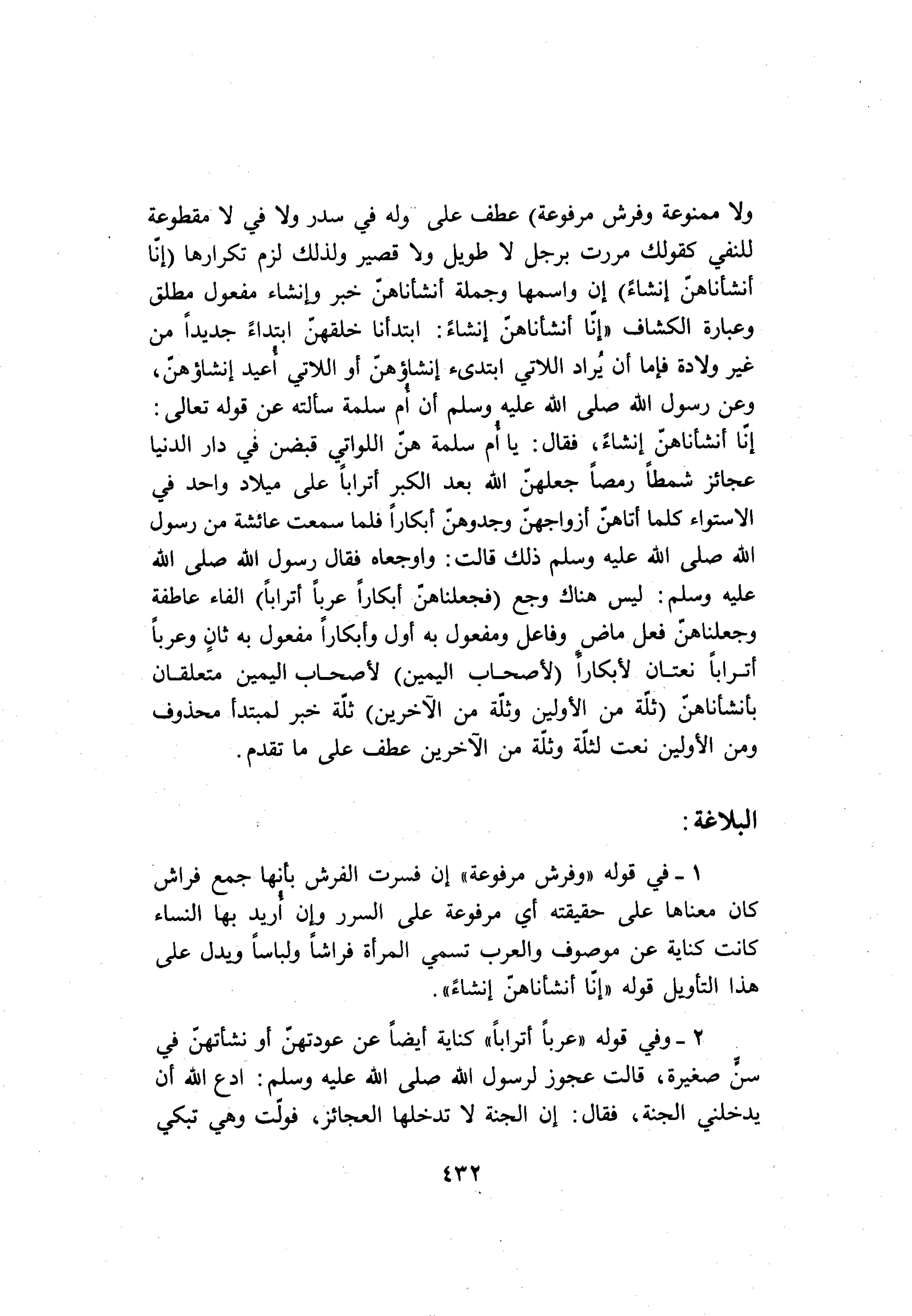 1- في قوله «وفرش مرفوعة» إن فسرت الفرش بأنها جمع فراش كان معناها على حقيقته أي مرفوعة على السرر وإن أريد بها النساء كانت كناية عن موصوف والعرب تسمي المرأة فراشا ولباسا ويدل على هذا التأويل قوله «إنّا أنشأناهنّ إنشاء» .