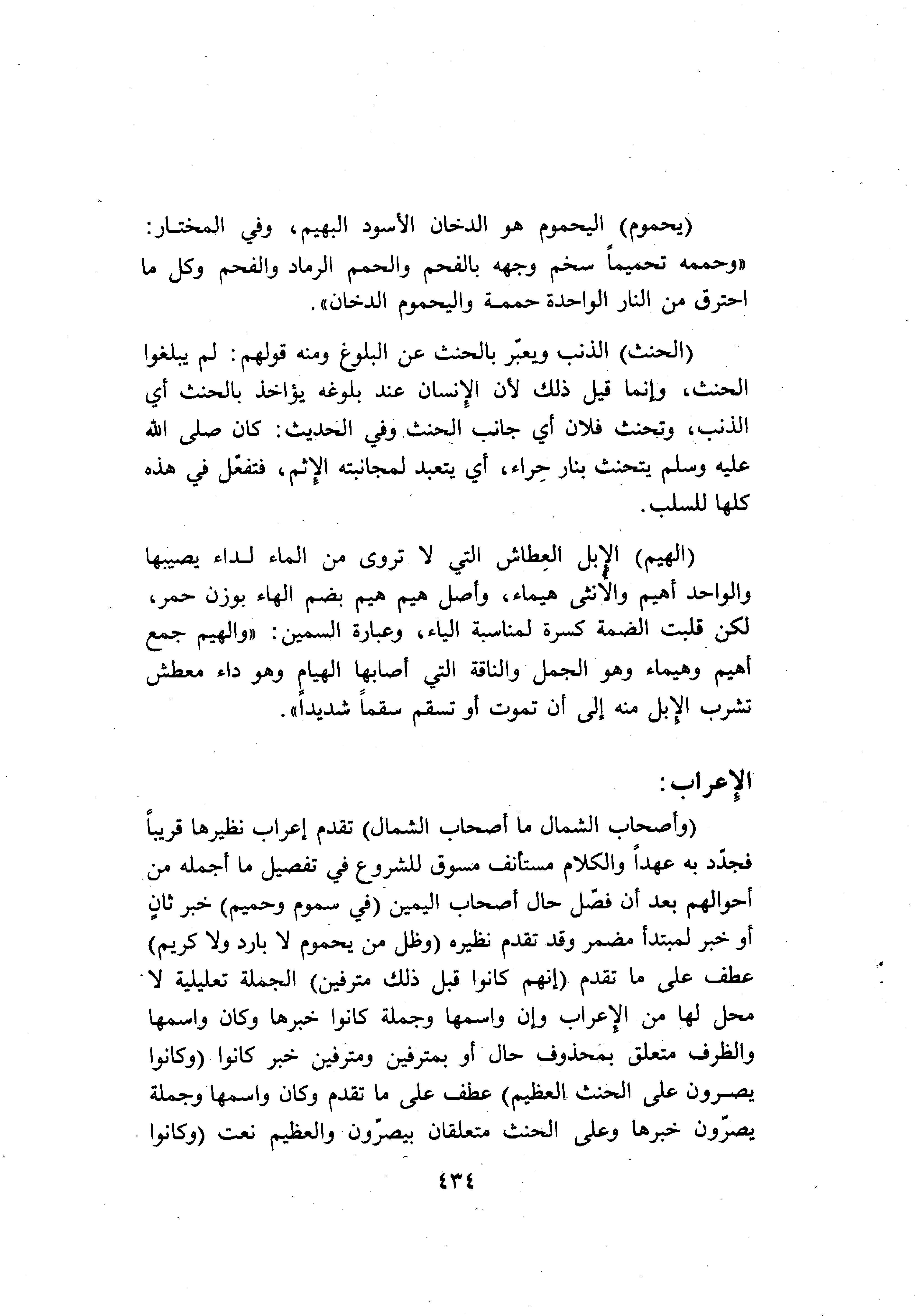 (الْحِنْثِ) الذنب ويعبّر بالحنث عن البلوغ ومنه قولهم: لم يبلغوا الحنث، وإنما قيل ذلك لأن الإنسان عند بلوغه يؤاخذ بالحنث أي الذنب، وتحنث فلان أي جانب الحنث وفي الحديث: كان صلى الله عليه وسلم يتحنث بنار حراء، أي يتعبد لمجانبته الإثم، فتفعّل في هذه كلها للسلب.