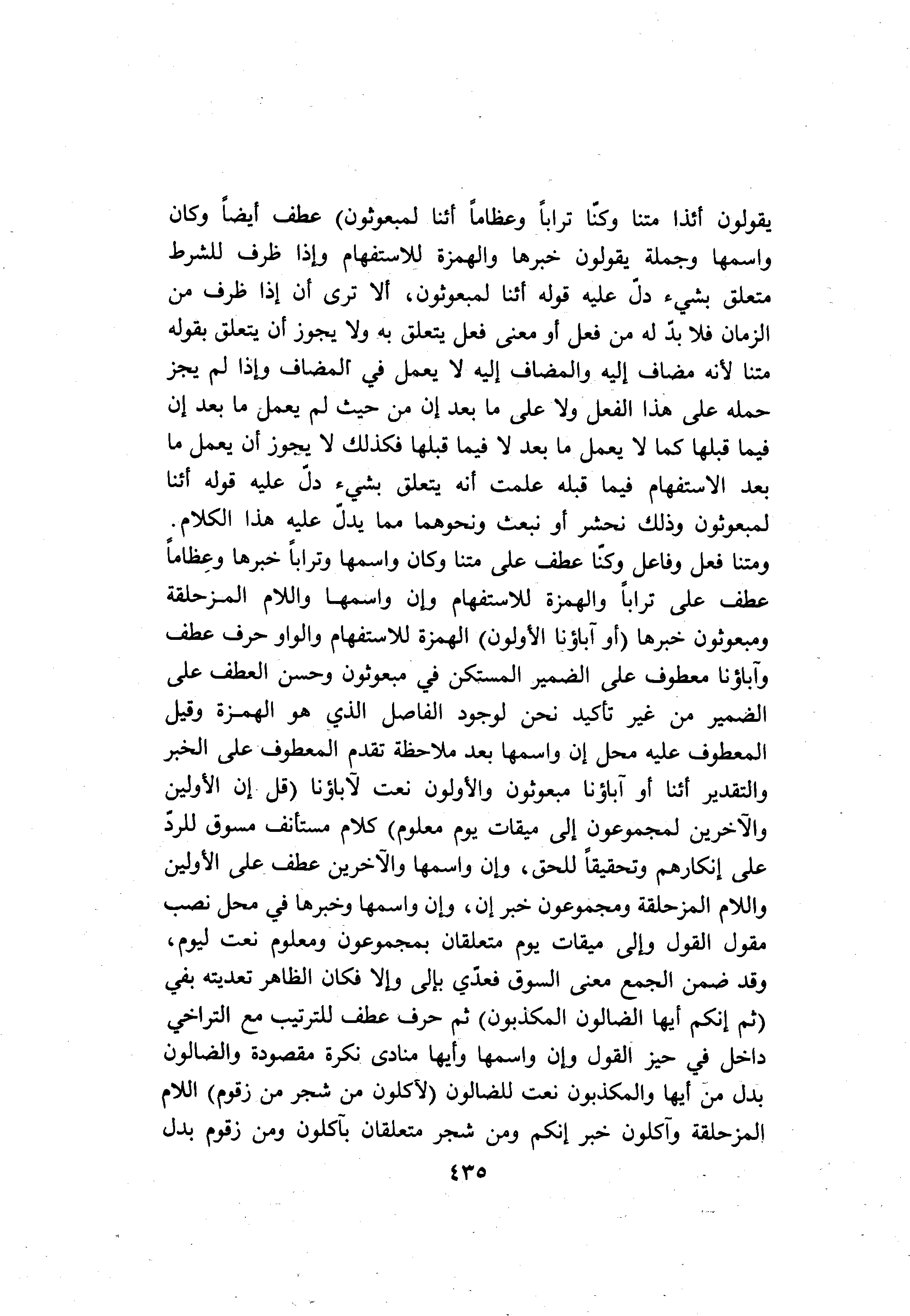 عطف أيضا وكان واسمها وجملة يقولون خبرها والهمزة للاستفهام وإذا ظرف للشرط متعلق بشيء دلّ عليه قوله أإنا لمبعوثون، ألا ترى أن إذا ظرف من الزمان فلا بدّ له من فعل أو معنى فعل يتعلق به ولا يجوز أن يتعلق بقوله متنا لأنه مضاف إليه والمضاف إليه لا يعمل في المضاف وإذا لم يجز حمله على هذا الفعل ولا على ما بعد إن من حيث لم يعمل ما بعد إن فيما قبلها كما لا يعمل ما بعد لا فيما قبلها فكذلك لا يجوز أن يعمل ما بعد الاستفهام فيما قبله علمت أنه يتعلق بشيء دلّ عليه قوله أإنا لمبعوثون وذلك نحشر أو نبعث ونحوهما مما يدلّ عليه هذا الكلام.