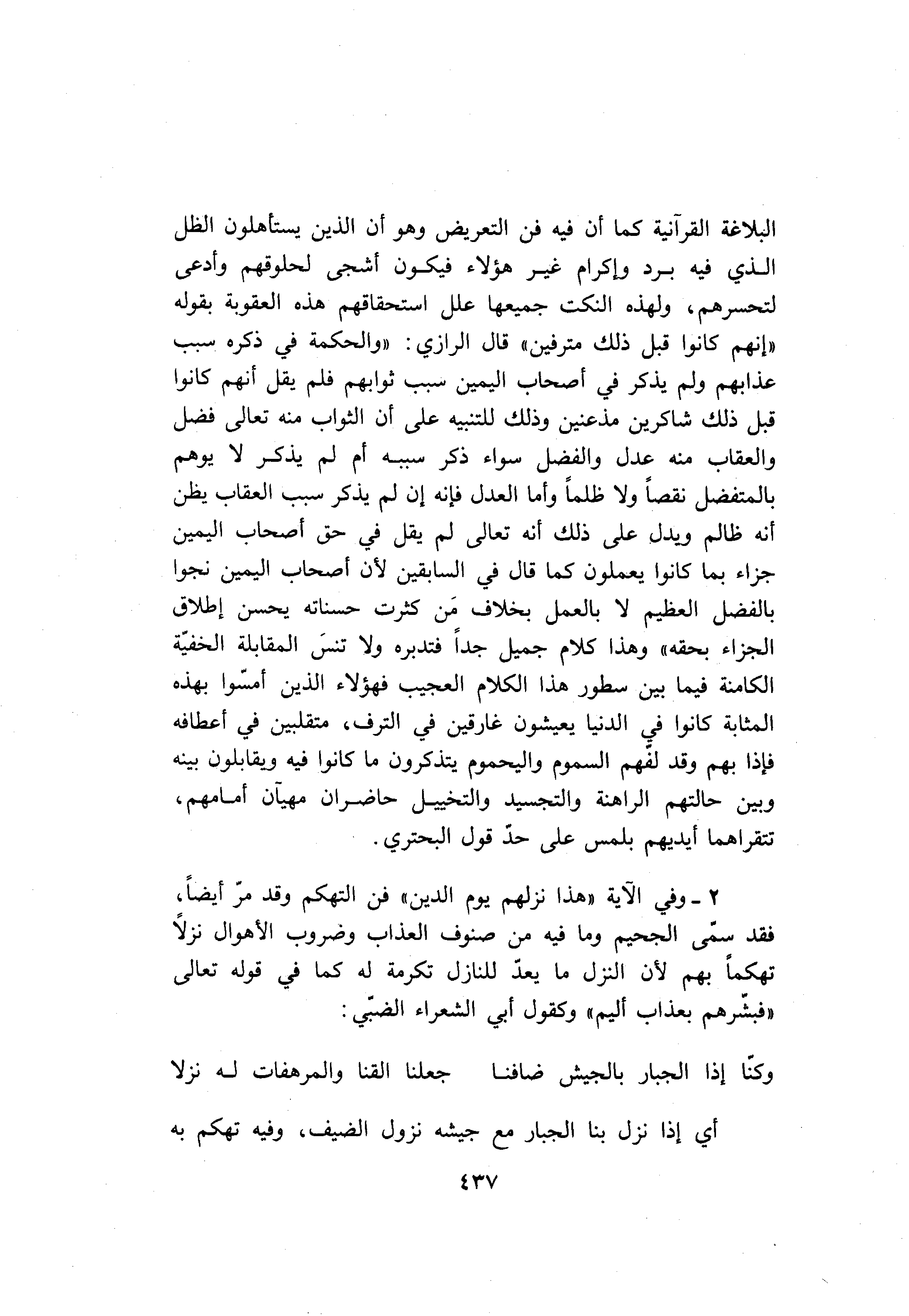 البلاغة القرآنية كما أن فيه فن التعريض وهو أن الذين يستأهلون الظل الذي فيه برد وإكرام غير هؤلاء فيكون أشجى لحلوقهم وأدعى لتحسرهم، ولهذه النكت جميعها علل استحقاقهم هذه العقوبة بقوله «إنهم كانوا قبل ذلك مترفين» قال الرازي: «والحكمة في ذكره سبب عذابهم ولم يذكر في أصحاب اليمين سبب ثوابهم فلم يقل أنهم كانوا قبل ذلك شاكرين مذعنين وذلك للتنبيه على أن الثواب منه تعالى فضل والعقاب منه عدل والفضل سواء ذكر سببه أم لم يذكر لا يوهم بالمتفضل نقصا ولا ظلما وأما العدل فإنه إن لم يذكر سبب العقاب يظن أنه ظالم ويدل على ذلك أنه تعالى لم يقل في حق أصحاب اليمين جزاء بما كانوا يعملون كما قال في السابقين لأن أصحاب اليمين نجوا بالفضل العظيم لا بالعمل بخلاف من كثرت حسناته يحسن إطلاق الجزاء بحقه» وهذا كلام جميل جدا فتدبره ولا تنس المقابلة الخفيّة الكامنة فيما بين سطور هذا الكلام العجيب فهؤلاء الذين أمسّوا بهذه المثابة كانوا في الدنيا يعيشون غارقين في الترف، متقلبين في أعطافه فإذا بهم وقد لفّهم السموم واليحموم يتذكرون ما كانوا فيه ويقابلون بينه وبين حالتهم الراهنة والتجسيد والتخييل حاضران مهيآن أمامهم، تتقراهما أيديهم بلمس على حدّ قول البحتري.