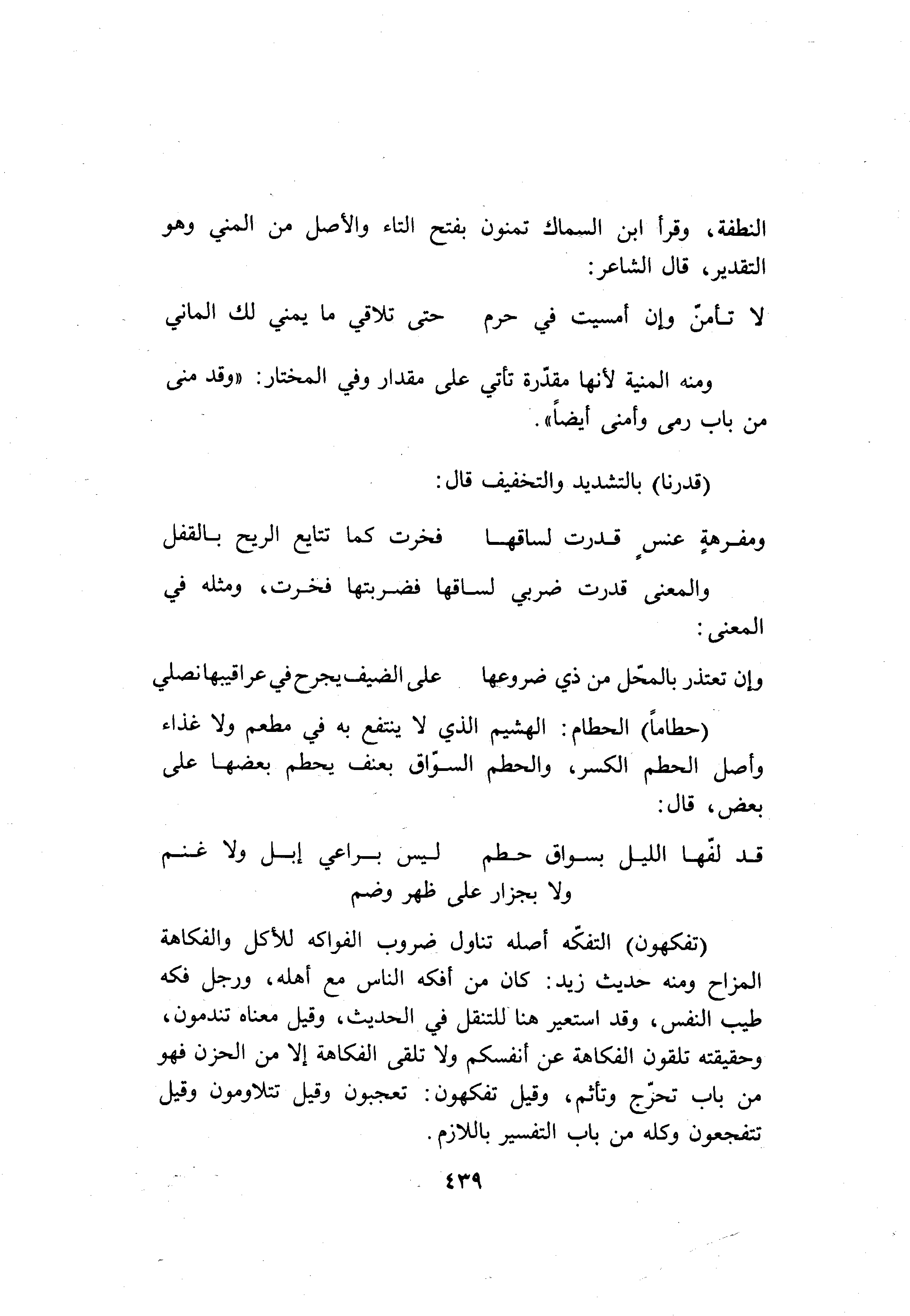 ولا بجزار على ظهر وضم (تَفَكَّهُونَ) التفكّه أصله تناول ضروب الفواكه للأكل والفكاهة المزاح ومنه حديث زيد: كان من أفكه الناس مع أهله، ورجل فكه طيب النفس، وقد استعير هنا للتنقل في الحديث، وقيل معناه تندمون، وحقيقته تلقون الفكاهة عن أنفسكم ولا تلقى الفكاهة إلا من الحزن فهو من باب تحرّج وتأثم، وقيل تفكهون: تعجبون وقيل تتلاومون وقيل تتفجعون وكله من باب التفسير باللازم.