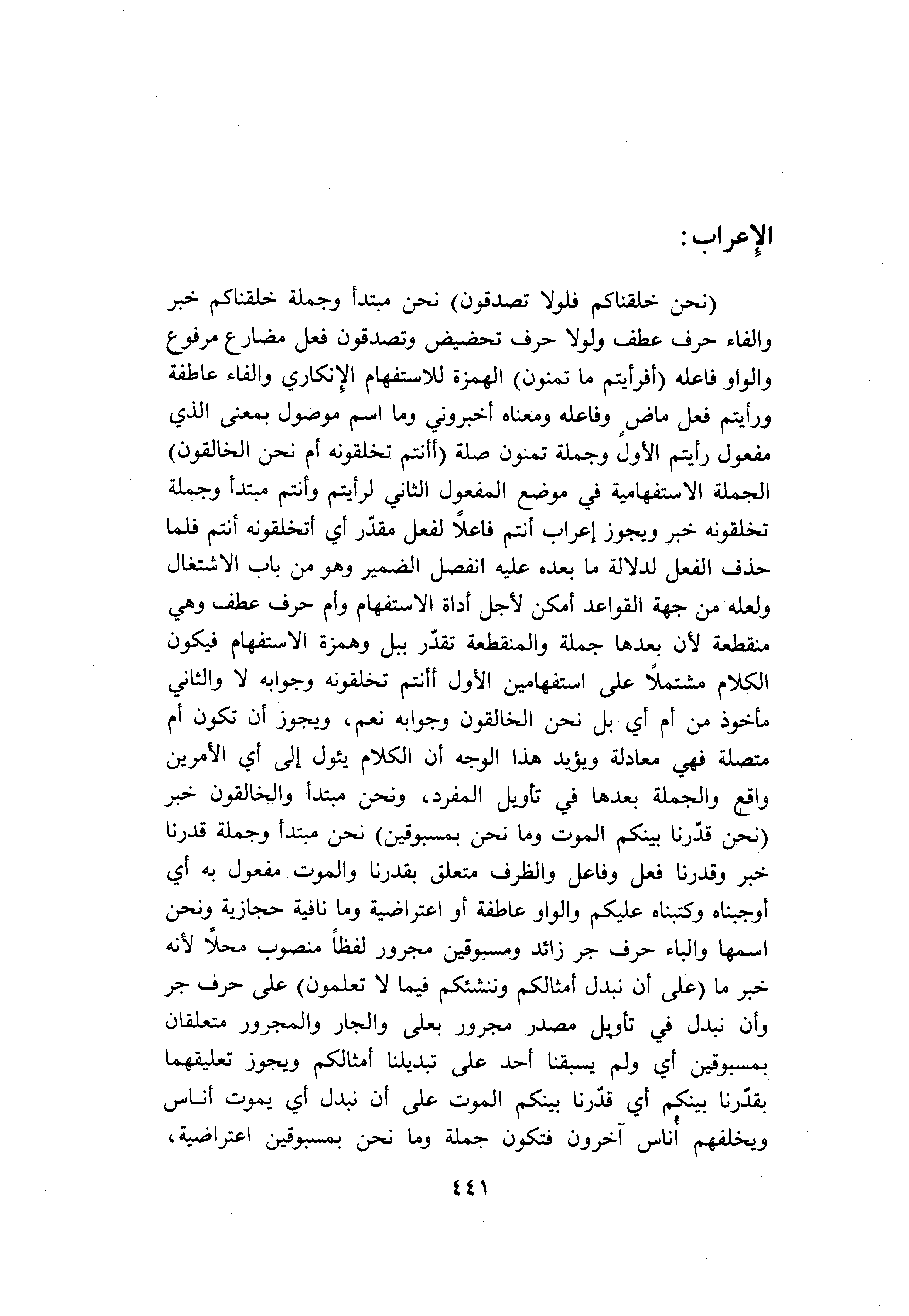 (نَحْنُ خَلَقْناكُمْ فَلَوْلا تُصَدِّقُونَ) نحن مبتدأ وجملة خلقناكم خبر والفاء حرف عطف ولولا حرف تحضيض وتصدقون فعل مضارع مرفوع والواو فاعله (أَفَرَأَيْتُمْ ما تُمْنُونَ) الهمزة للاستفهام الإنكاري والفاء عاطفة ورأيتم فعل ماض وفاعله ومعناه أخبروني وما اسم موصول بمعنى الذي مفعول رأيتم الأول وجملة تمنون صلة (أَأَنْتُمْ تَخْلُقُونَهُ أَمْ نَحْنُ الْخالِقُونَ) الجملة الاستفهامية في موضع المفعول الثاني لرأيتم وأنتم مبتدأ وجملة تخلقونه خبر ويجوز إعراب أنتم فاعلا لفعل مقدّر أي أتخلقونه أنتم فلما حذف الفعل لدلالة ما بعده عليه انفصل الضمير وهو من باب الاشتغال ولعله من جهة القواعد أمكن لأجل أداة الاستفهام وأم حرف عطف وهي منقطعة لأن بعدها جملة والمنقطعة تقدّر ببل وهمزة الاستفهام فيكون الكلام مشتملا على استفهامين الأول أأنتم تخلقونه وجوابه لا والثاني مأخوذ من أم أي بل نحن الخالقون وجوابه نعم، ويجوز أن تكون أم متصلة فهي معادلة ويؤيد هذا الوجه أن الكلام يئول إلى أي الأمرين واقع والجملة بعدها في تأويل المفرد، ونحن مبتدأ والخالقون خبر (نَحْنُ قَدَّرْنا بَيْنَكُمُ الْمَوْتَ وَما نَحْنُ بِمَسْبُوقِينَ)
