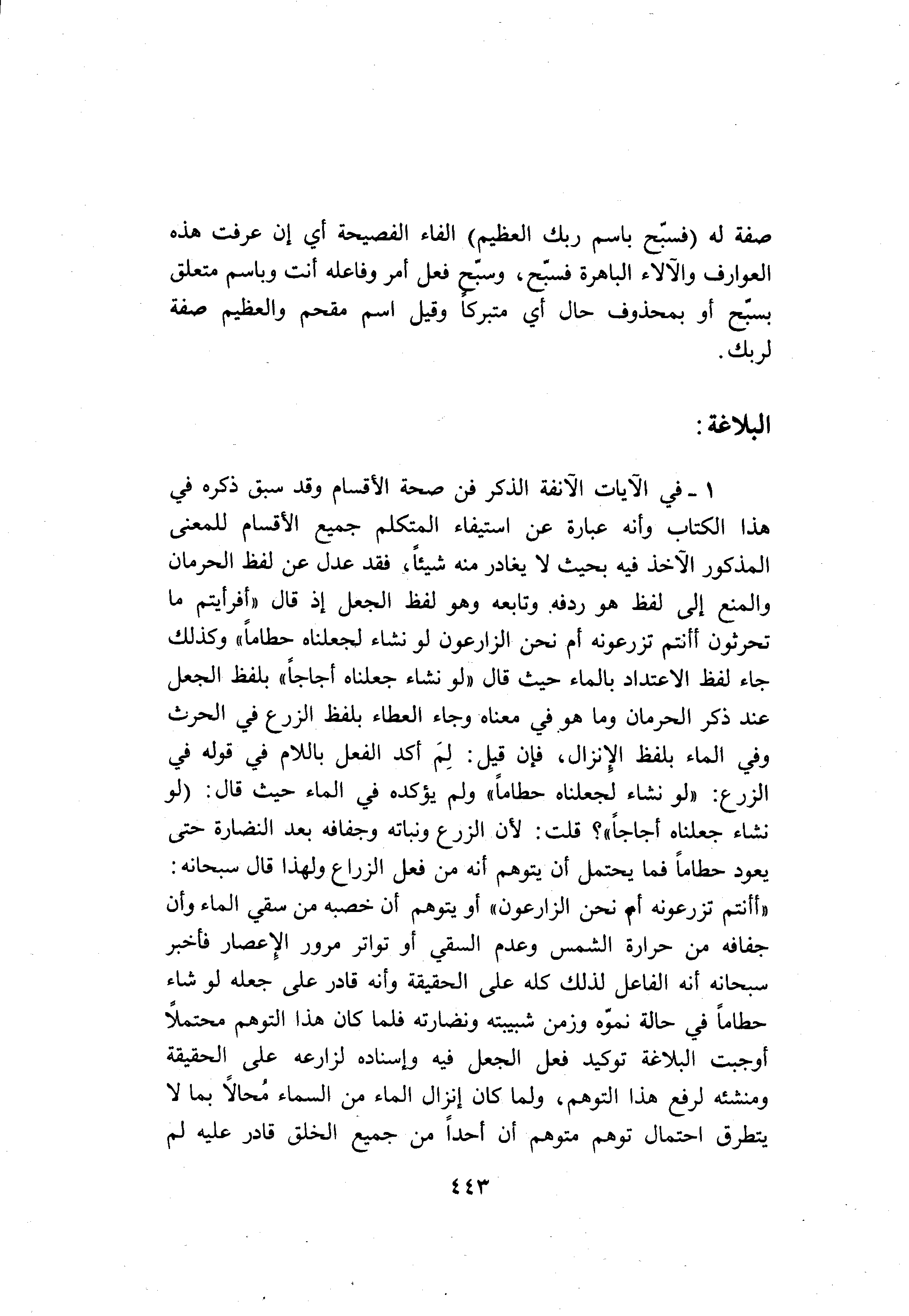 1- في الآيات الآنفة الذكر فن صحة الأقسام وقد سبق ذكره في هذا الكتاب وأنه عبارة عن استيفاء المتكلم جميع الأقسام للمعنى المذكور الآخذ فيه بحيث لا يغادر منه شيئا، فقد عدل عن لفظ الحرمان والمنع إلى لفظ هو ردفه وتابعه وهو لفظ الجعل إذ قال «أفرأيتم ما تحرثون أأنتم تزرعونه أم نحن الزارعون لو نشاء لجعلناه حطاما» وكذلك جاء لفظ الاعتداد بالماء حيث قال «لو نشاء جعلناه أجاجا» بلفظ الجعل عند ذكر الحرمان وما هو في معناه وجاء العطاء بلفظ الزرع في الحرث وفي الماء بلفظ الإنزال، فإن قيل: لم أكد الفعل باللام في قوله في الزرع: «لو نشاء لجعلناه حطاما» ولم يؤكده في الماء حيث قال: (لَوْ نَشاءُ جَعَلْناهُ أُجاجاً) ؟ قلت: لأن الزرع ونباته وجفافه بعد النضارة حتى يعود حطاما فما يحتمل أن يتوهم أنه من فعل الزراع ولهذا قال سبحانه: