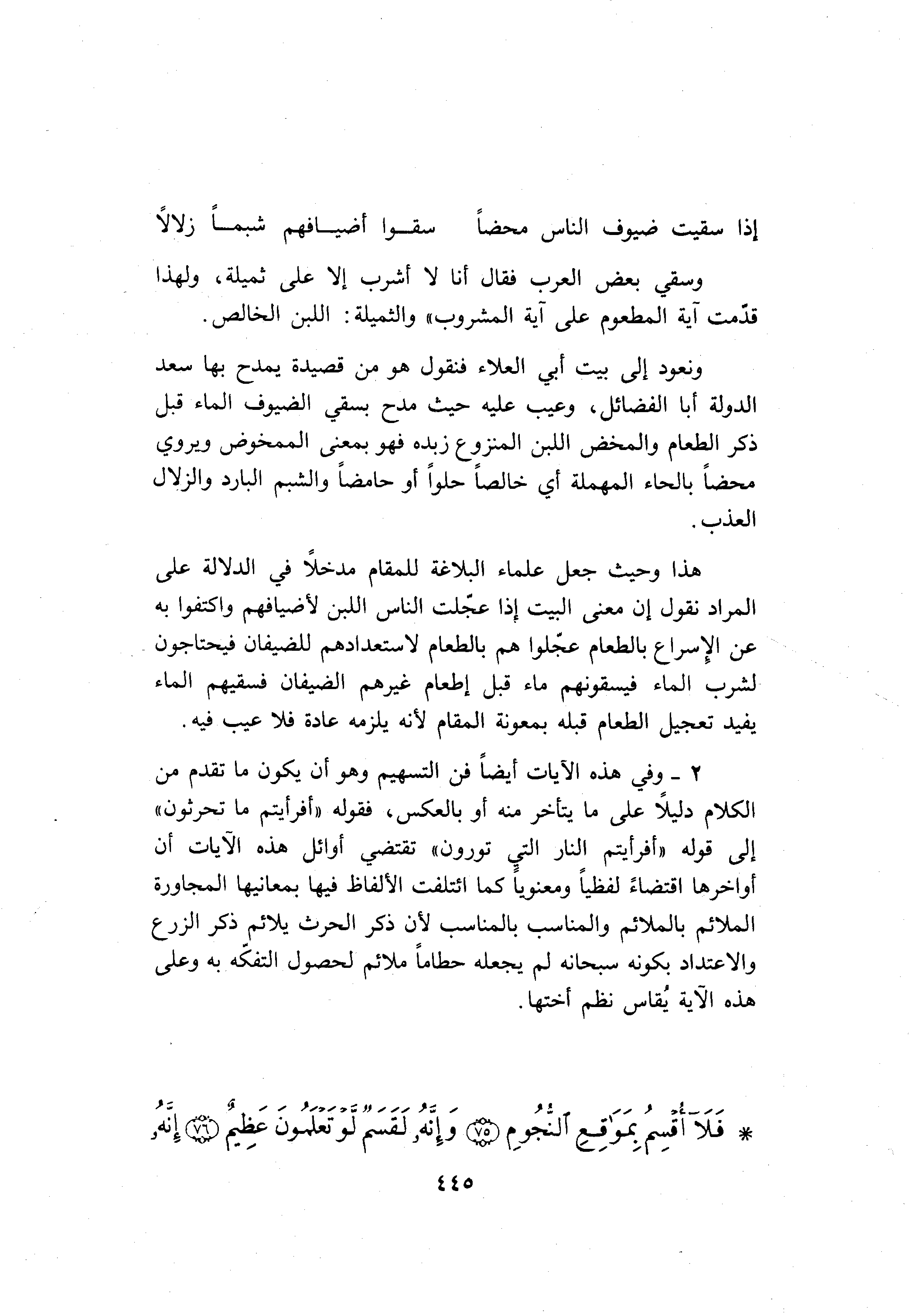 هذا وحيث جعل علماء البلاغة للمقام مدخلا في الدلالة على المراد نقول إن معنى البيت إذا عجّلت الناس اللبن لأضيافهم واكتفوا به عن الإسراع بالطعام عجّلوا هم بالطعام لاستعدادهم للضيفان فيحتاجون لشرب الماء فيسقونهم ماء قبل إطعام غيرهم الضيفان فسقيهم الماء يفيد تعجيل الطعام قبله بمعونة المقام لأنه يلزمه عادة فلا عيب فيه.