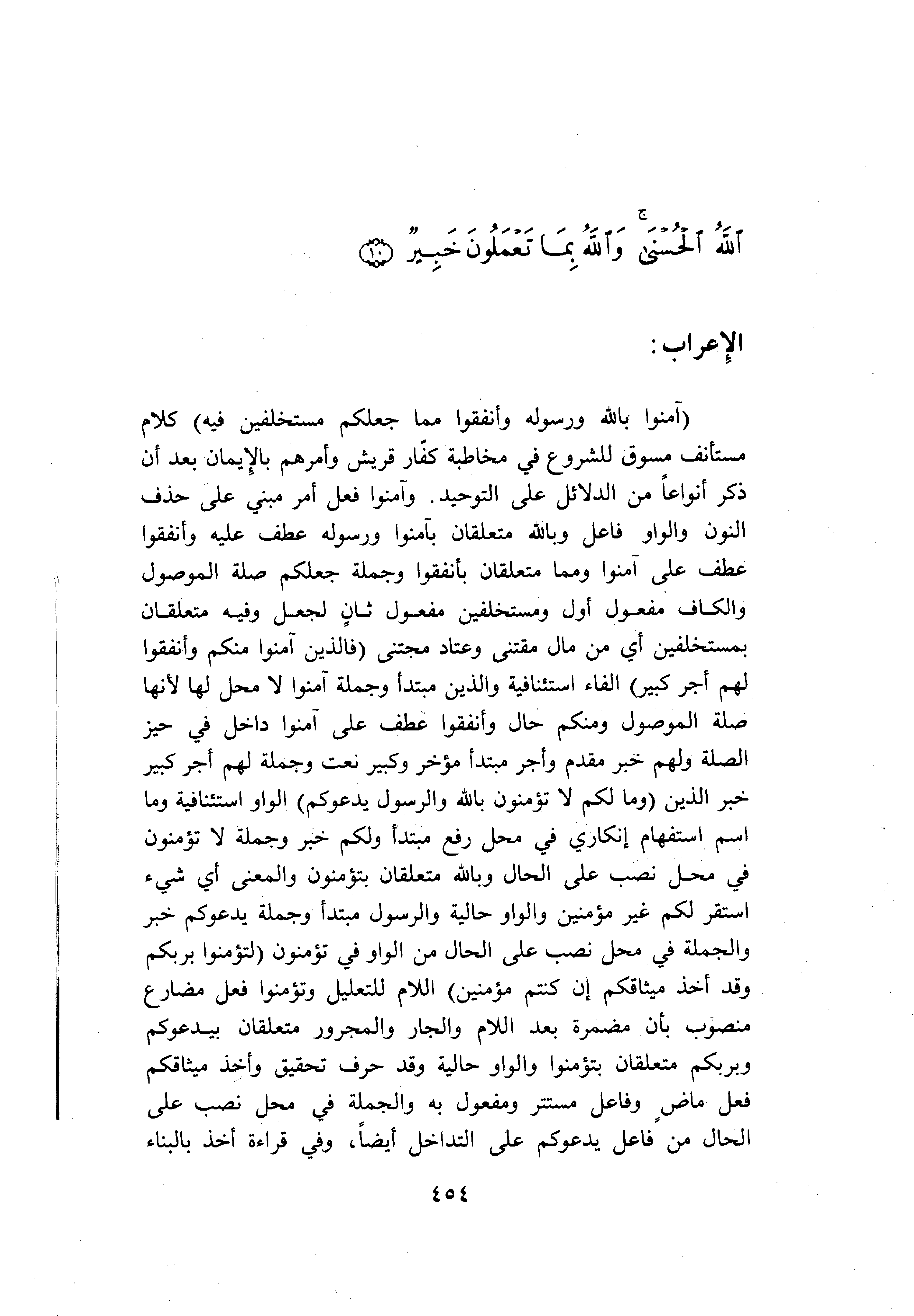 (آمِنُوا بِاللَّهِ وَرَسُولِهِ وَأَنْفِقُوا مِمَّا جَعَلَكُمْ مُسْتَخْلَفِينَ فِيهِ) كلام مستأنف مسوق للشروع في مخاطبة كفّار قريش وأمرهم بالإيمان بعد أن ذكر أنواعا من الدلائل على التوحيد. وآمنوا فعل أمر مبني على حذف النون والواو فاعل وبالله متعلقان بآمنوا ورسوله عطف عليه وأنفقوا عطف على آمنوا ومما متعلقان بأنفقوا وجملة جعلكم صلة الموصول والكاف مفعول أول ومستخلفين مفعول ثان لجعل وفيه متعلقان بمستخلفين أي من مال مقتنى وعتاد مجتنى (فَالَّذِينَ آمَنُوا مِنْكُمْ وَأَنْفَقُوا لَهُمْ أَجْرٌ كَبِيرٌ) الفاء استئنافية والذين مبتدأ وجملة آمنوا لا محل لها لأنها صلة الموصول ومنكم حال وأنفقوا عطف على آمنوا داخل في حيز الصلة ولهم خبر مقدم وأجر مبتدأ مؤخر وكبير نعت وجملة لهم أجر كبير خبر الذين (وَما لَكُمْ لا تُؤْمِنُونَ بِاللَّهِ وَالرَّسُولُ يَدْعُوكُمْ) الواو استئنافية وما اسم استفهام إنكاري في محل رفع مبتدأ ولكم خبر وجملة لا تؤمنون في محل نصب على الحال وبالله متعلقان بتؤمنون والمعنى أي شيء استقر لكم غير مؤمنين والواو حالية والرسول مبتدأ وجملة يدعوكم خبر والجملة في محل نصب على الحال من الواو في تؤمنون (لِتُؤْمِنُوا بِرَبِّكُمْ وَقَدْ أَخَذَ مِيثاقَكُمْ إِنْ كُنْتُمْ مُؤْمِنِينَ) اللام للتعليل وتؤمنوا فعل مضارع منصوب بأن مضمرة بعد اللام والجار والمجرور متعلقان بيدعوكم وبربكم متعلقان بتؤمنوا والواو حالية وقد حرف تحقيق وأخذ ميثاقكم فعل ماض وفاعل مستتر ومفعول به والجملة في محل نصب على الحال من فاعل يدعوكم على التداخل أيضا، وفي قراءة أخذ بالبناء