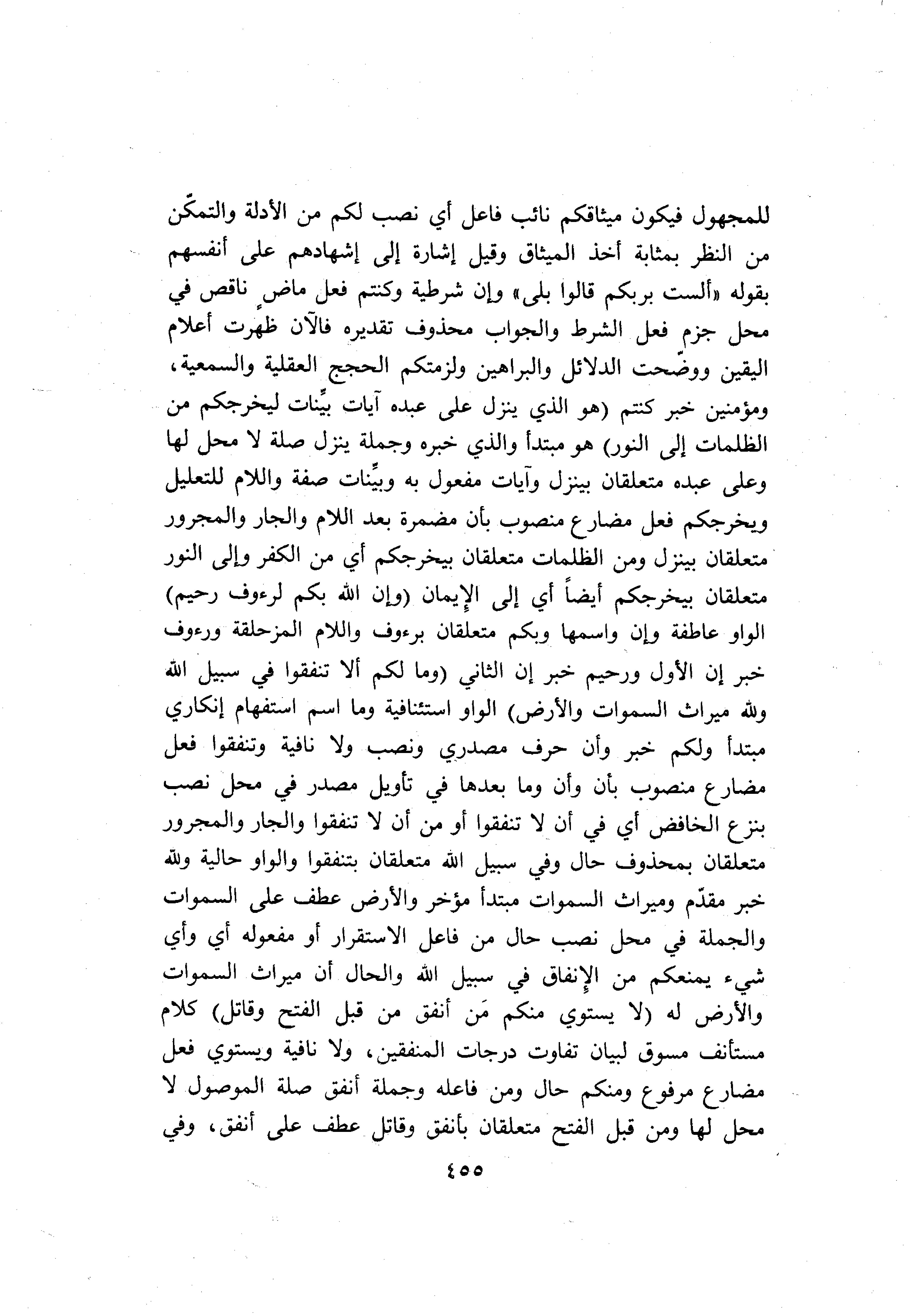 للمجهول فيكون ميثاقكم نائب فاعل أي نصب لكم من الأدلة والتمكّن من النظر بمثابة أخذ الميثاق وقيل إشارة إلى إشهادهم على أنفسهم بقوله «ألست بربكم قالوا بلى» وإن شرطية وكنتم فعل ماض ناقص في محل جزم فعل الشرط والجواب محذوف تقديره فالآن ظهرت أعلام اليقين ووضّحت الدلائل والبراهين ولزمتكم الحجج العقلية والسمعية، ومؤمنين خبر كنتم (هُوَ الَّذِي يُنَزِّلُ عَلى عَبْدِهِ آياتٍ بَيِّناتٍ لِيُخْرِجَكُمْ مِنَ الظُّلُماتِ إِلَى النُّورِ) هو مبتدأ والذي خبره وجملة ينزل صلة لا محل لها وعلى عبده متعلقان بينزل وآيات مفعول به وبيّنات صفة واللام للتعليل ويخرجكم فعل مضارع منصوب بأن مضمرة بعد اللام والجار والمجرور متعلقان بينزل ومن الظلمات متعلقان بيخرجكم أي من الكفر وإلى النور متعلقان بيخرجكم أيضا أي إلى الإيمان (وَإِنَّ اللَّهَ بِكُمْ لَرَؤُفٌ رَحِيمٌ) الواو عاطفة وإن واسمها وبكم متعلقان برءوف واللام المزحلقة ورءوف خبر إن الأول ورحيم خبر إن الثاني (وَما لَكُمْ أَلَّا تُنْفِقُوا فِي سَبِيلِ اللَّهِ وَلِلَّهِ مِيراثُ السَّماواتِ وَالْأَرْضِ) الواو استئنافية وما اسم استفهام إنكاري مبتدأ ولكم خبر وأن حرف مصدري ونصب ولا نافية وتنفقوا فعل مضارع منصوب بأن وأن وما بعدها في تأويل مصدر في محل نصب بنزع الخافض أي في أن لا تنفقوا أو من أن لا تنفقوا والجار والمجرور متعلقان بمحذوف حال وفي سبيل الله متعلقان بتنفقوا والواو حالية ولله خبر مقدّم وميراث السموات مبتدأ مؤخر والأرض عطف على السموات والجملة في محل نصب حال من فاعل الاستقرار أو مفعوله أي وأي شيء يمنعكم من الإنفاق في سبيل الله والحال أن ميراث السموات والأرض له (لا يَسْتَوِي مِنْكُمْ مَنْ أَنْفَقَ مِنْ قَبْلِ الْفَتْحِ وَقاتَلَ) كلام مستأنف مسوق لبيان تفاوت درجات المنفقين، ولا نافية ويستوي فعل مضارع مرفوع ومنكم حال ومن فاعله وجملة أنفق صلة الموصول لا محل لها ومن قبل الفتح متعلقان بأنفق وقاتل عطف على أنفق، وفي