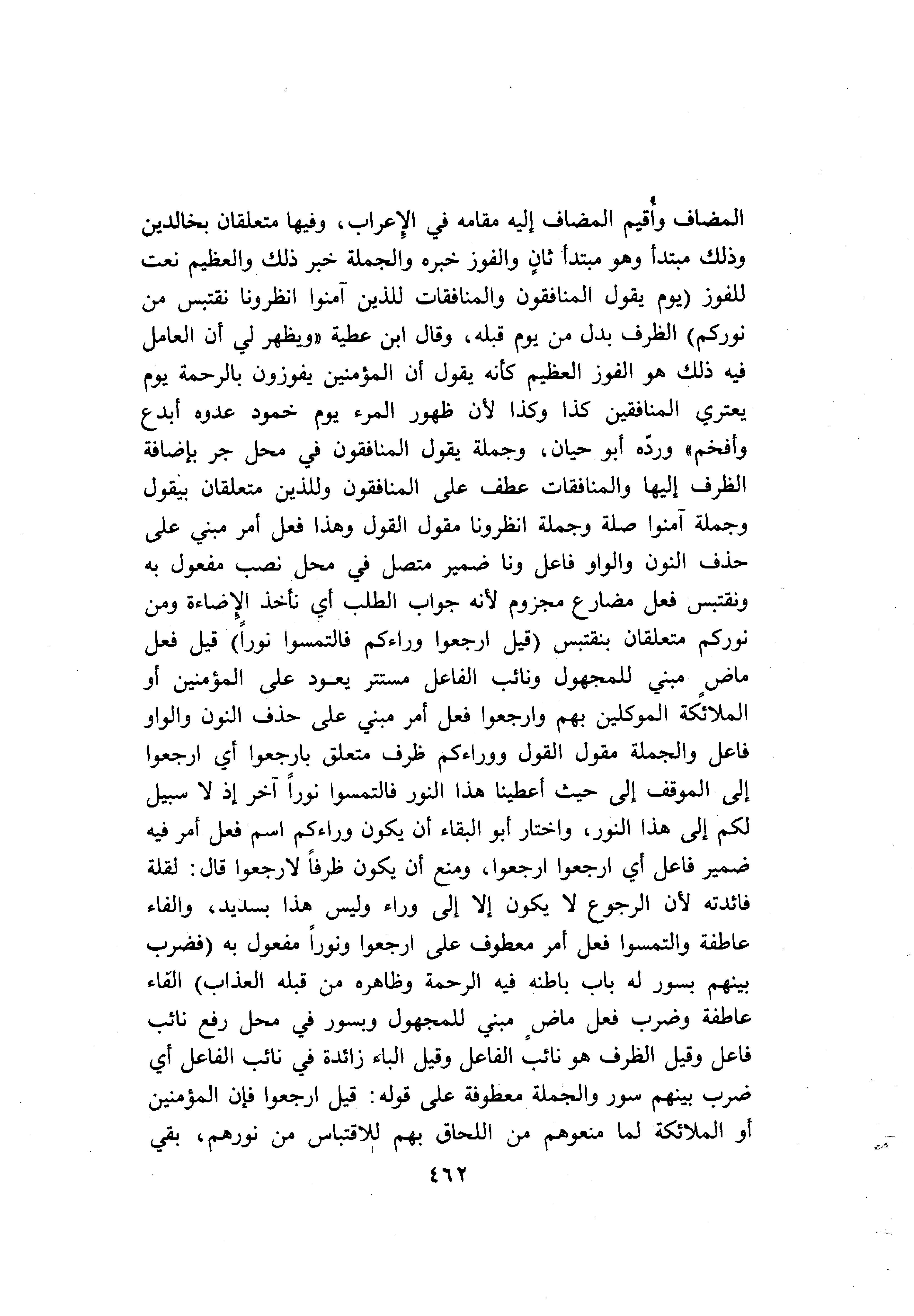 المضاف وأقيم المضاف إليه مقامه في الإعراب، وفيها متعلقان بخالدين وذلك مبتدأ وهو مبتدأ ثان والفوز خبره والجملة خبر ذلك والعظيم نعت للفوز (يَوْمَ يَقُولُ الْمُنافِقُونَ وَالْمُنافِقاتُ لِلَّذِينَ آمَنُوا انْظُرُونا نَقْتَبِسْ مِنْ نُورِكُمْ) الظرف بدل من يوم قبله، وقال ابن عطية «ويظهر لي أن العامل فيه ذلك هو الفوز العظيم كأنه يقول أن المؤمنين يفوزون بالرحمة يوم يعتري المنافقين كذا وكذا لأن ظهور المرء يوم خمود عدوه أبدع وأفخم» وردّه أبو حيان، وجملة يقول المنافقون في محل جر بإضافة الظرف إليها والمنافقات عطف على المنافقون وللذين متعلقان بيقول وجملة آمنوا صلة وجملة انظرونا مقول القول وهذا فعل أمر مبني على حذف النون والواو فاعل ونا ضمير متصل في محل نصب مفعول به ونقتبس فعل مضارع مجزوم لأنه جواب الطلب أي نأخذ الإضاءة ومن نوركم متعلقان بنقتبس (قِيلَ ارْجِعُوا وَراءَكُمْ فَالْتَمِسُوا نُوراً) قيل فعل ماض مبني للمجهول ونائب الفاعل مستتر يعود على المؤمنين أو الملائكة الموكلين بهم وارجعوا فعل أمر مبني على حذف النون والواو فاعل والجملة مقول القول ووراءكم ظرف متعلق بارجعوا أي ارجعوا إلى الموقف إلى حيث أعطينا هذا النور فالتمسوا نورا آخر إذ لا سبيل لكم إلى هذا النور، واختار أبو البقاء أن يكون وراءكم اسم فعل أمر فيه ضمير فاعل أي ارجعوا ارجعوا، ومنع