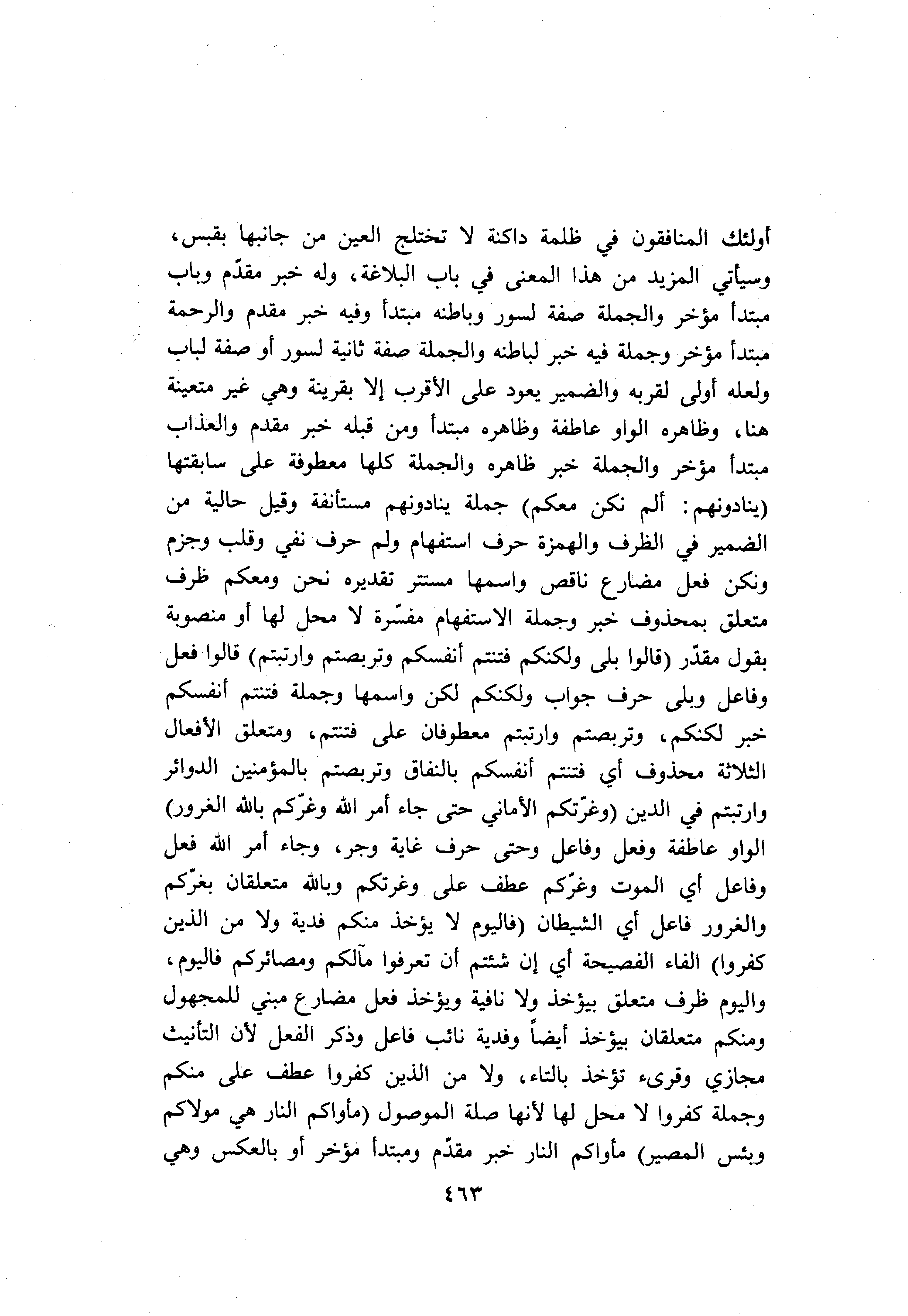 أولئك المنافقون في ظلمة داكنة لا تختلج العين من جانبها بقبس، وسيأتي المزيد من هذا المعنى في باب البلاغة، وله خبر مقدّم وباب مبتدأ مؤخر والجملة صفة لسور وباطنه مبتدأ وفيه خبر مقدم والرحمة مبتدأ مؤخر وجملة فيه خبر لباطنه والجملة صفة ثانية لسور أو صفة لباب ولعله أولى لقربه والضمير يعود على الأقرب إلا بقرينة وهي غير متعينة هنا، وظاهره الواو عاطفة وظاهره مبتدأ ومن قبله خبر مقدم والعذاب مبتدأ مؤخر والجملة خبر ظاهره والجملة كلها معطوفة على سابقتها (يُنادُونَهُمْ: أَلَمْ نَكُنْ مَعَكُمْ) جملة ينادونهم مستأنفة وقيل حالية من الضمير في الظرف والهمزة حرف استفهام ولم حرف نفي وقلب وجزم ونكن فعل مضارع ناقص واسمها مستتر تقديره نحن ومعكم ظرف متعلق بمحذوف خبر وجملة الاستفهام مفسّرة لا محل لها أو منصوبة بقول مقدّر (قالُوا بَلى وَلكِنَّكُمْ فَتَنْتُمْ أَنْفُسَكُمْ وَتَرَبَّصْتُمْ وَارْتَبْتُمْ) قالوا فعل وفاعل وبلى حرف جواب ولكنكم لكن واسمها وجملة فتنتم أنفسكم خبر لكنكم، وتربصتم وارتبتم معطوفان على فتنتم، ومتعلق الأفعال الثلاثة محذوف أي فتنتم أنفسكم بالنفاق وتربصتم بالمؤمنين الدوائر وارتبتم في الدين (وَغَرَّتْكُمُ الْأَمانِيُّ حَتَّى جاءَ أَمْرُ اللَّهِ وَغَرَّكُمْ بِاللَّهِ الْغَرُورُ) الواو عاطفة وفعل وفاعل وحتى حرف غاية وجر، وجاء أمر الله فعل وفاعل أي الموت وغرّكم عطف على وغرتكم وبالله متعلقان بغرّكم والغرور فاعل أي الشيطان (فَالْيَوْمَ لا يُؤْخَذُ مِنْكُمْ فِدْيَةٌ وَلا مِنَ الَّذِينَ كَفَرُوا) الفاء الفصيحة أي إن شئتم أن تعرفوا مآلكم ومصائركم فاليوم، واليوم ظرف متعلق بيؤخذ ولا نافية ويؤخذ فعل مضارع مبني للمجهول ومنكم متعلقان بيؤخذ أيضا وفدية نائب فاعل وذكر الفعل لأن التأنيث مجازي وقرئ تؤخذ بالتاء، ولا من الذين كفروا عطف على منكم وجملة كفروا لا محل لها لأنها صلة الموصول (مَأْواكُمُ النَّارُ هِيَ مَوْلاكُمْ وَبِئْسَ الْمَصِيرُ) مأواكم النار خبر مقدّم ومبتدأ مؤخر أو بالعكس وهي
