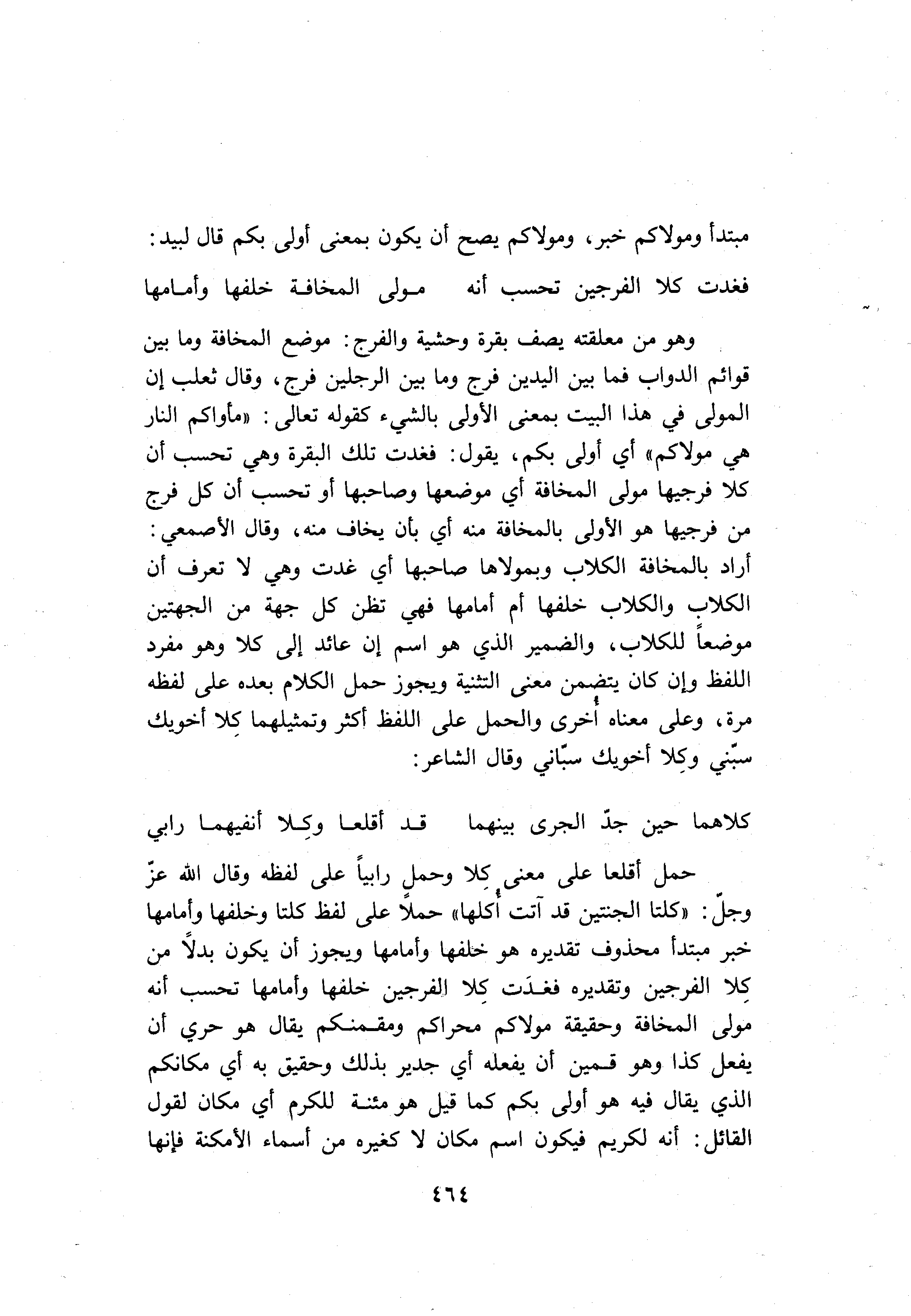 حمل أقلعا على معنى كلا وحمل رابيا على لفظه وقال الله عزّ وجلّ: «كلتا الجنتين قد آتت أكلها» حملا على لفظ كلتا وخلفها وأمامها خبر مبتدأ محذوف تقديره هو خلفها وأمامها ويجوز أن يكون بدلا من كلا الفرجين وتقديره فغدت كلا الفرجين خلفها وأمامها تحسب أنه مولى المخافة وحقيقة مولاكم محراكم ومقمنكم يقال هو حري أن يفعل كذا وهو قمين أن يفعله أي جدير بذلك وحقيق به أي مكانكم الذي يقال فيه هو أولى بكم كما قيل هو مئنة للكرم أي مكان لقول القائل: أنه لكريم فيكون اسم مكان لا كغيره من أسماء الأمكنة فإنها