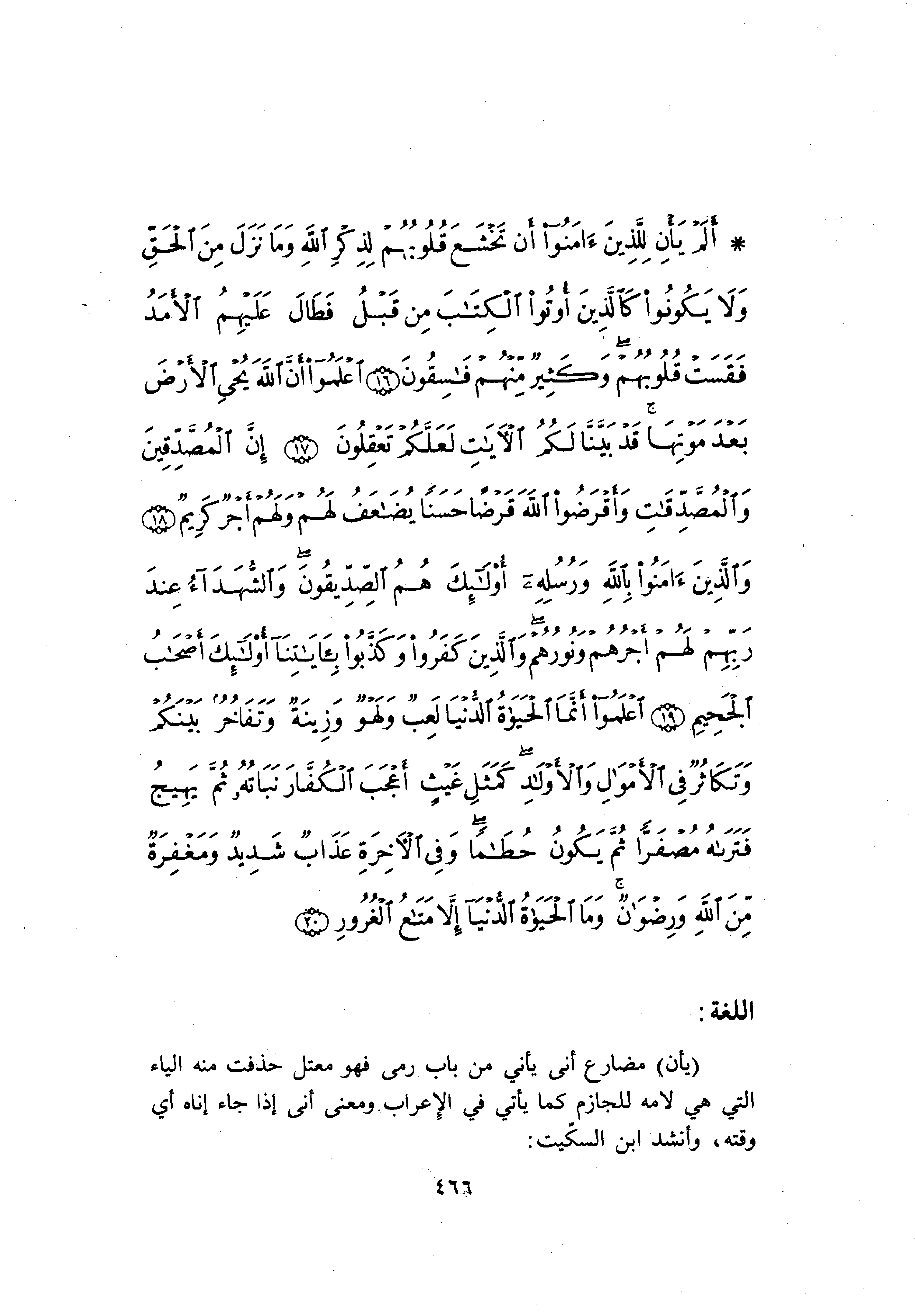 أَلَمْ يَأْنِ لِلَّذِينَ آمَنُوا أَنْ تَخْشَعَ قُلُوبُهُمْ لِذِكْرِ اللَّهِ وَما نَزَلَ مِنَ الْحَقِّ وَلا يَكُونُوا كَالَّذِينَ أُوتُوا الْكِتابَ مِنْ قَبْلُ فَطالَ عَلَيْهِمُ الْأَمَدُ فَقَسَتْ قُلُوبُهُمْ وَكَثِيرٌ مِنْهُمْ فاسِقُونَ (16) اعْلَمُوا أَنَّ اللَّهَ يُحْيِ الْأَرْضَ بَعْدَ مَوْتِها قَدْ بَيَّنَّا لَكُمُ الْآياتِ لَعَلَّكُمْ تَعْقِلُونَ (17) إِنَّ الْمُصَّدِّقِينَ وَالْمُصَّدِّقاتِ وَأَقْرَضُوا اللَّهَ قَرْضاً حَسَناً يُضاعَفُ لَهُمْ وَلَهُمْ أَجْرٌ كَرِيمٌ (18) وَالَّذِينَ آمَنُوا بِاللَّهِ وَرُسُلِهِ أُولئِكَ هُمُ الصِّدِّيقُونَ وَالشُّهَداءُ عِنْدَ رَبِّهِمْ لَهُمْ أَجْرُهُمْ وَنُورُهُمْ وَالَّذِينَ كَفَرُوا وَكَذَّبُوا بِآياتِنا أُولئِكَ أَصْحابُ الْجَحِيمِ (19) اعْلَمُوا أَنَّمَا الْحَياةُ الدُّنْيا لَعِبٌ وَلَهْوٌ وَزِينَةٌ وَتَفاخُرٌ بَيْنَكُمْ وَتَكاثُرٌ فِي الْأَمْوالِ وَالْأَوْلادِ كَمَثَلِ غَيْثٍ أَعْجَبَ الْكُفَّارَ نَباتُهُ ثُمَّ يَهِيجُ فَتَراهُ مُصْفَرًّا ثُمَّ يَكُونُ حُطاماً وَفِي الْآخِرَةِ عَذابٌ شَدِيدٌ وَمَغْفِرَةٌ مِنَ اللَّهِ وَرِضْوانٌ وَمَا الْحَياةُ الدُّنْيا إِلاَّ مَتاعُ الْغُرُورِ (20)
