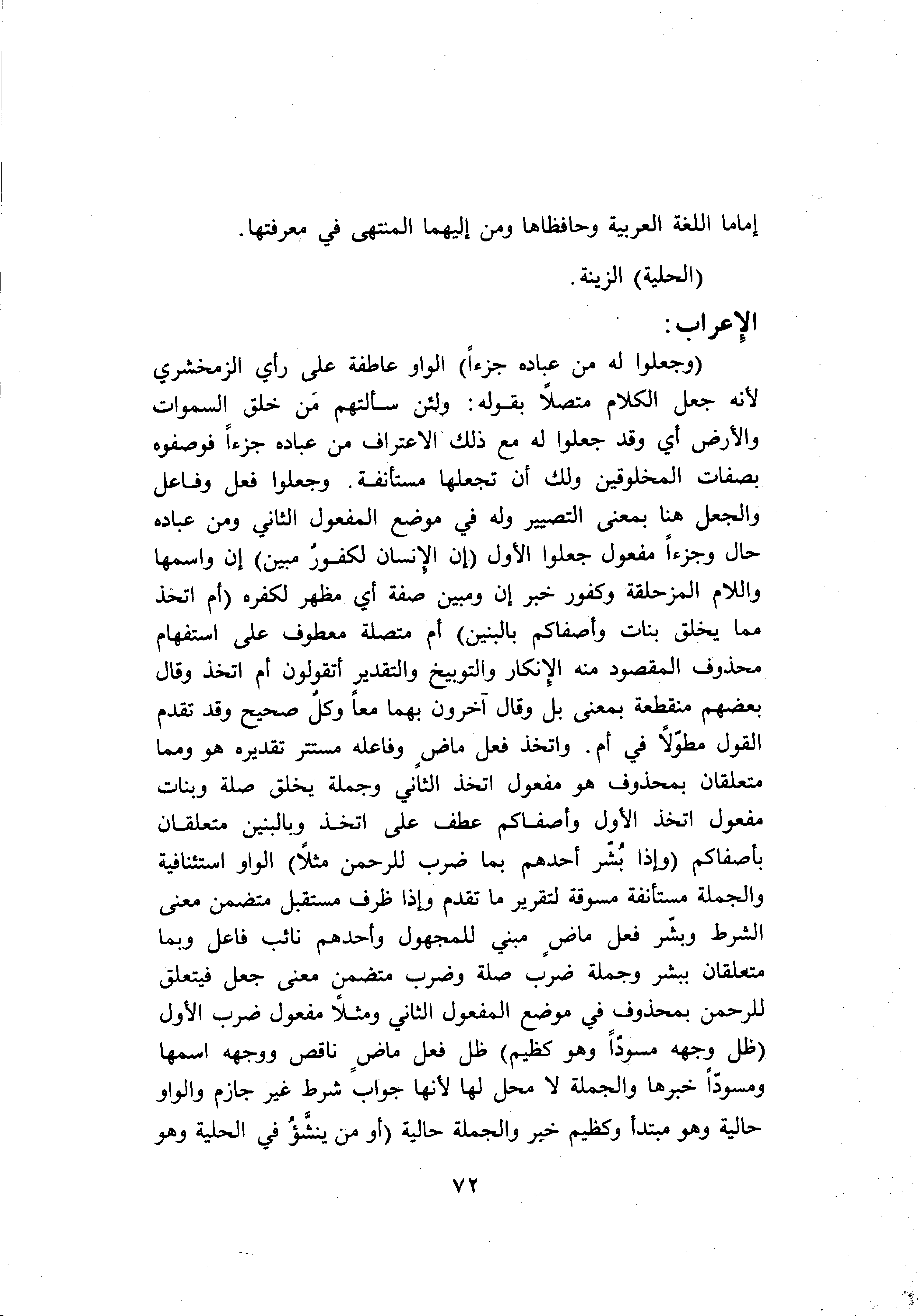 (وَجَعَلُوا لَهُ مِنْ عِبادِهِ جُزْءاً) الواو عاطفة على رأي الزمخشري لأنه جعل الكلام متصلا بقوله: ولئن سألتهم من خلق السموات والأرض أي وقد جعلوا له مع ذلك الاعتراف من عباده جزءا فوصفوه بصفات المخلوقين ولك أن تجعلها مستأنفة. وجعلوا فعل وفاعل والجعل هنا بمعنى التصيير وله في موضع المفعول الثاني ومن عباده حال وجزءا مفعول جعلوا الأول (إِنَّ الْإِنْسانَ لَكَفُورٌ مُبِينٌ) إن واسمها واللام المزحلقة وكفور خبر إن ومبين صفة أي مظهر لكفره (أَمِ اتَّخَذَ مِمَّا يَخْلُقُ بَناتٍ وَأَصْفاكُمْ بِالْبَنِينَ) أم متصلة معطوف على استفهام محذوف المقصود منه الإنكار والتوبيخ والتقدير أتقولون أم اتخذ وقال بعضهم منقطعة بمعنى بل وقال آخرون بهما معا وكل صحيح وقد تقدم القول مطولا في أم. واتخذ فعل ماض وفاعله مستتر تقديره هو ومما متعلقان بمحذوف هو مفعول اتخذ الثاني وجملة يخلق صلة وبنات مفعول اتخذ الأول وأصفاكم عطف على اتخذ وبالبنين متعلقان بأصفاكم (وَإِذا بُشِّرَ أَحَدُهُمْ بِما ضَرَبَ لِلرَّحْمنِ مَثَلًا) الواو استئنافية والجملة مستأنفة مسوقة لتقرير ما تقدم وإذا ظرف مستقبل متضمن معنى الشرط وبشّر فعل ماض مبني للمجهول وأحدهم نائب فاعل وبما متعلقان ببشر وجملة ضرب صلة وضرب متضمن معنى جعل فيتعلق للرحمن بمحذوف في موضع المفعول الثاني ومثلا مفعول ضرب الأول (ظَلَّ وَجْهُهُ مُسْوَدًّا وَهُوَ كَظِيمٌ) ظل فعل ماض ناقص ووجهه اسمها ومسودّا خبرها والجملة لا محل لها لأنها جواب شرط غير جازم والواو حالية وهو مبتدأ وكظيم خبر والجملة حالية (أَوَمَنْ يُنَشَّؤُا فِي الْحِلْيَةِ وَهُوَ فِي الْخِصامِ غَيْرُ مُبِينٍ)