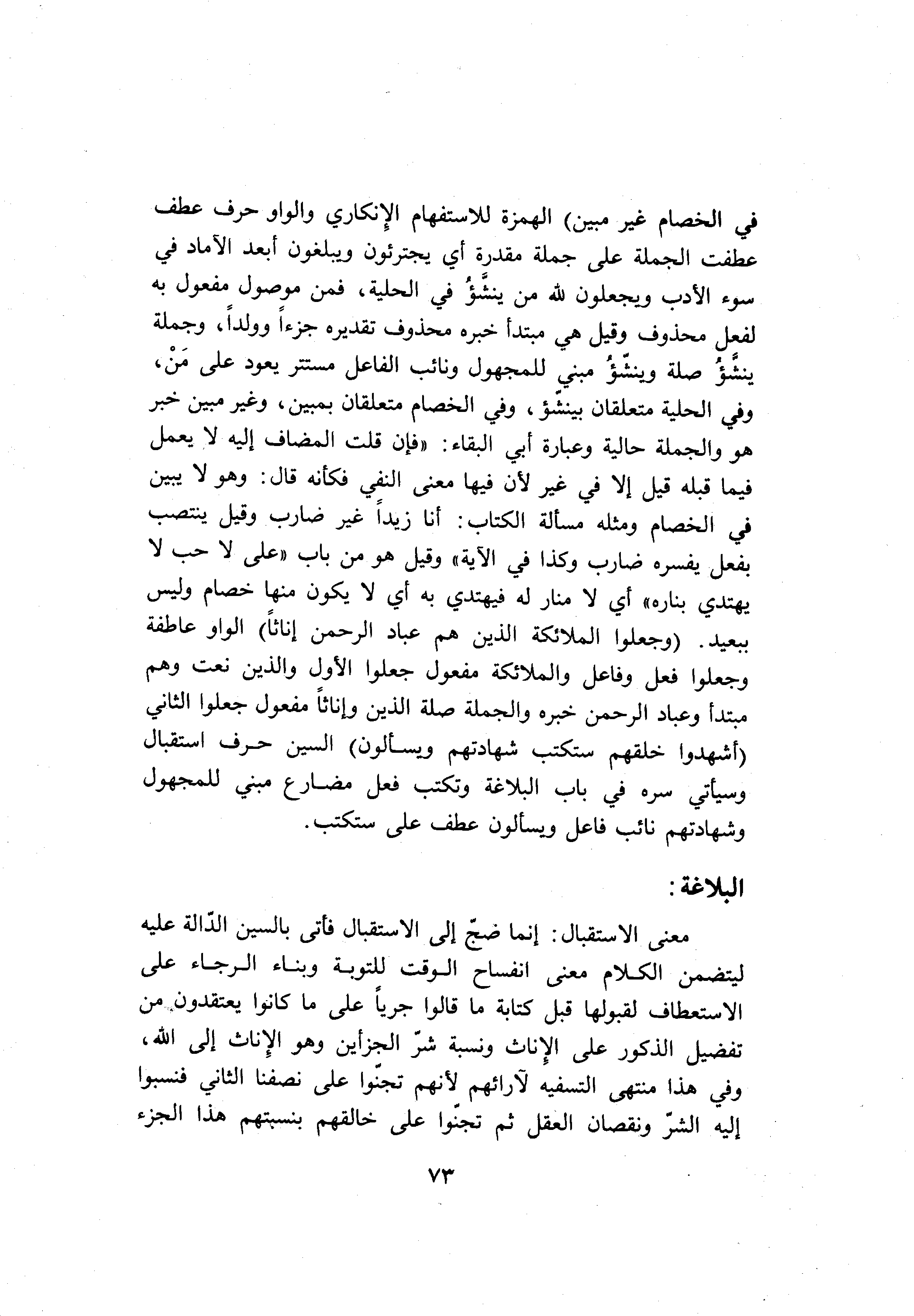 الهمزة للاستفهام الإنكاري والواو حرف عطف عطفت الجملة على جملة مقدرة أي يجترئون ويبلغون أبعد الآماد في سوء الأدب ويجعلون لله من ينشّؤ في الحلية، فمن موصول مفعول به لفعل محذوف وقيل هي مبتدأ خبره محذوف تقديره جزءا وولدا، وجملة ينشّؤ صلة وينشّؤ مبني للمجهول ونائب الفاعل مستتر يعود على من، وفي الحلية متعلقان بينشّؤ، وفي الخصام متعلقان بمبين، وغير مبين خبر هو والجملة حالية وعبارة أبي البقاء: «فإن قلت المضاف إليه لا يعمل فيما قبله قيل إلا في غير لأن فيها معنى النفي فكأنه قال: وهو لا يبين في الخصام ومثله مسألة الكتاب: أنا زيدا غير ضارب وقيل ينتصب بفعل يفسره ضارب وكذا في الآية» وقيل هو من باب «على لا حب لا يهتدي بناره» أي لا منار له فيهتدي به أي لا يكون منها خصام وليس ببعيد. (وَجَعَلُوا الْمَلائِكَةَ الَّذِينَ هُمْ عِبادُ الرَّحْمنِ إِناثاً) الواو عاطفة وجعلوا فعل وفاعل والملائكة مفعول جعلوا الأول والذين نعت وهم مبتدأ وعباد الرحمن خبره والجملة صلة الذين وإناثا مفعول جعلوا الثاني (أَشَهِدُوا خَلْقَهُمْ سَتُكْتَبُ شَهادَتُهُمْ وَيُسْئَلُونَ) السين حرف استقبال وسيأتي سره في باب البلاغة وتكتب فعل مضارع مبني للمجهول وشهادتهم نائب فاعل ويسألون عطف على ستكتب.