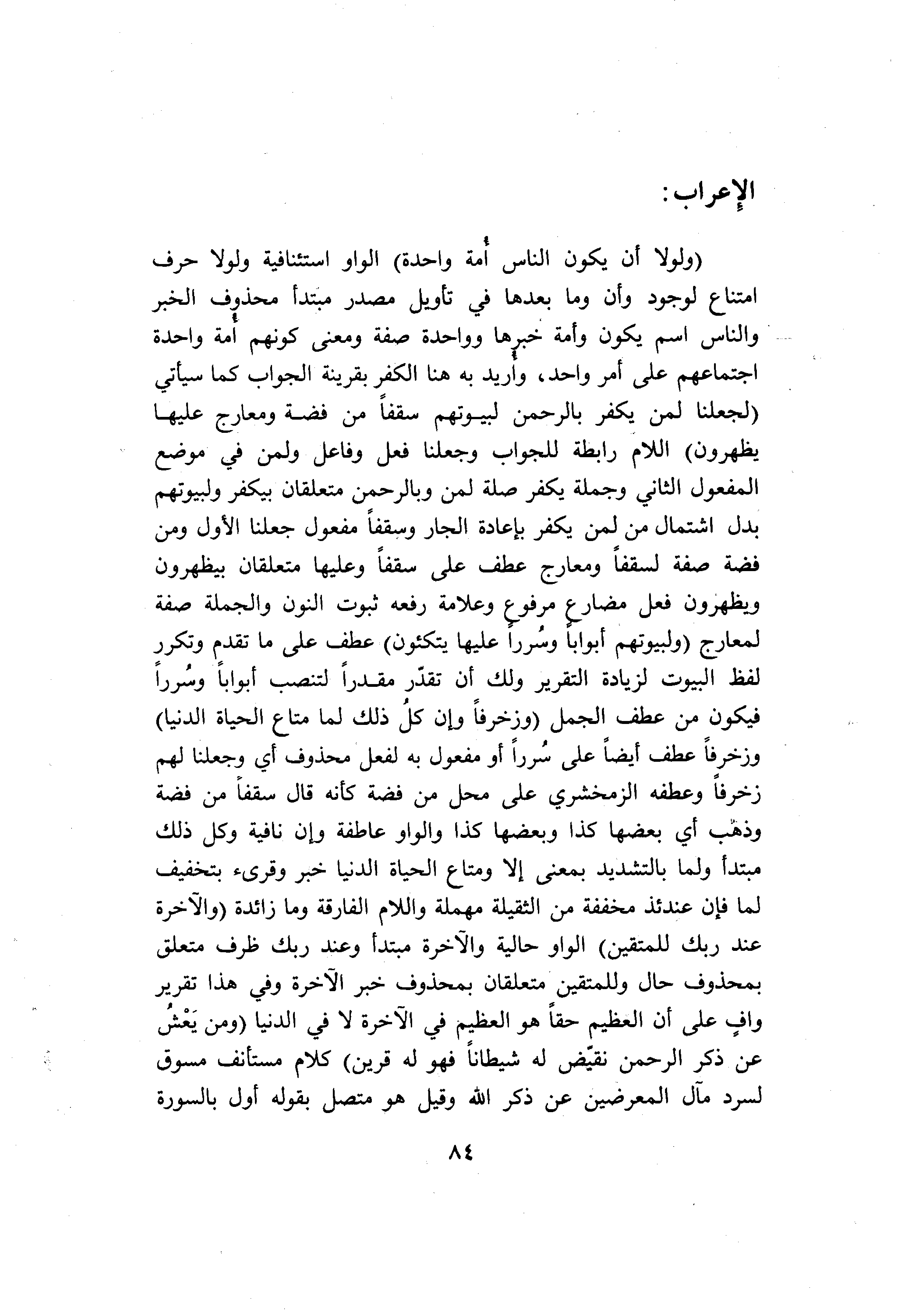 (وَلَوْلا أَنْ يَكُونَ النَّاسُ أُمَّةً واحِدَةً) الواو استئنافية ولولا حرف امتناع لوجود وأن وما بعدها في تأويل مصدر مبتدأ محذوف الخبر والناس اسم يكون وأمة خبرها وواحدة صفة ومعنى كونهم أمة واحدة اجتماعهم على أمر واحد، وأريد به هنا الكفر بقرينة الجواب كما سيأتي (لَجَعَلْنا لِمَنْ يَكْفُرُ بِالرَّحْمنِ لِبُيُوتِهِمْ سُقُفاً مِنْ فِضَّةٍ وَمَعارِجَ عَلَيْها يَظْهَرُونَ) اللام رابطة للجواب وجعلنا فعل وفاعل ولمن في موضع المفعول الثاني وجملة يكفر صلة لمن وبالرحمن متعلقان بيكفر ولبيوتهم بدل اشتمال من لمن يكفر بإعادة الجار وسقفا مفعول جعلنا الأول ومن فضة صفة لسقفا ومعارج عطف على سقفا وعليها متعلقان بيظهرون ويظهرون فعل مضارع مرفوع وعلامة رفعه ثبوت النون والجملة صفة لمعارج (وَلِبُيُوتِهِمْ أَبْواباً وَسُرُراً عَلَيْها يَتَّكِؤُنَ) عطف على ما تقدم وتكرر لفظ البيوت لزيادة التقرير ولك أن تقدّر مقدرا لتنصب أبوابا وسررا فيكون من عطف الجمل (وَزُخْرُفاً وَإِنْ كُلُّ ذلِكَ لَمَّا مَتاعُ الْحَياةِ الدُّنْيا) وزخرفا عطف أيضا على سررا أو مفعول به لفعل محذوف أي وجعلنا لهم زخرفا وعطفه الزمخشري على محل من فضة كأنه قال سقفا من فضة وذهب أي بعضها كذا وبعضها كذا والواو عاطفة وإن نافية وكل ذلك مبتدأ ولما بالتشديد بمعنى إلا ومتاع الحياة الدنيا خبر وقرىء بتخفيف لما فإن عندئذ مخففة من الثقيلة مهملة واللام الفارقة وما زائدة (وَالْآخِرَةُ عِنْدَ رَبِّكَ لِلْمُتَّقِينَ) الواو حالية والآخرة مبتدأ وعند ربك ظرف متعلق بمحذوف حال وللمتقين متعلقان بمحذوف خبر الآخرة وفي هذا تقرير واف على أن العظيم حقا هو العظيم في الآخرة لا في الدنيا (وَمَنْ يَعْشُ عَنْ ذِكْرِ الرَّحْمنِ نُقَيِّضْ لَهُ شَيْطاناً فَهُوَ لَهُ قَرِينٌ) كلام مستأنف مسوق لسرد مآل المعرضين عن ذكر الله وقيل هو متصل بقوله أول بالسورة