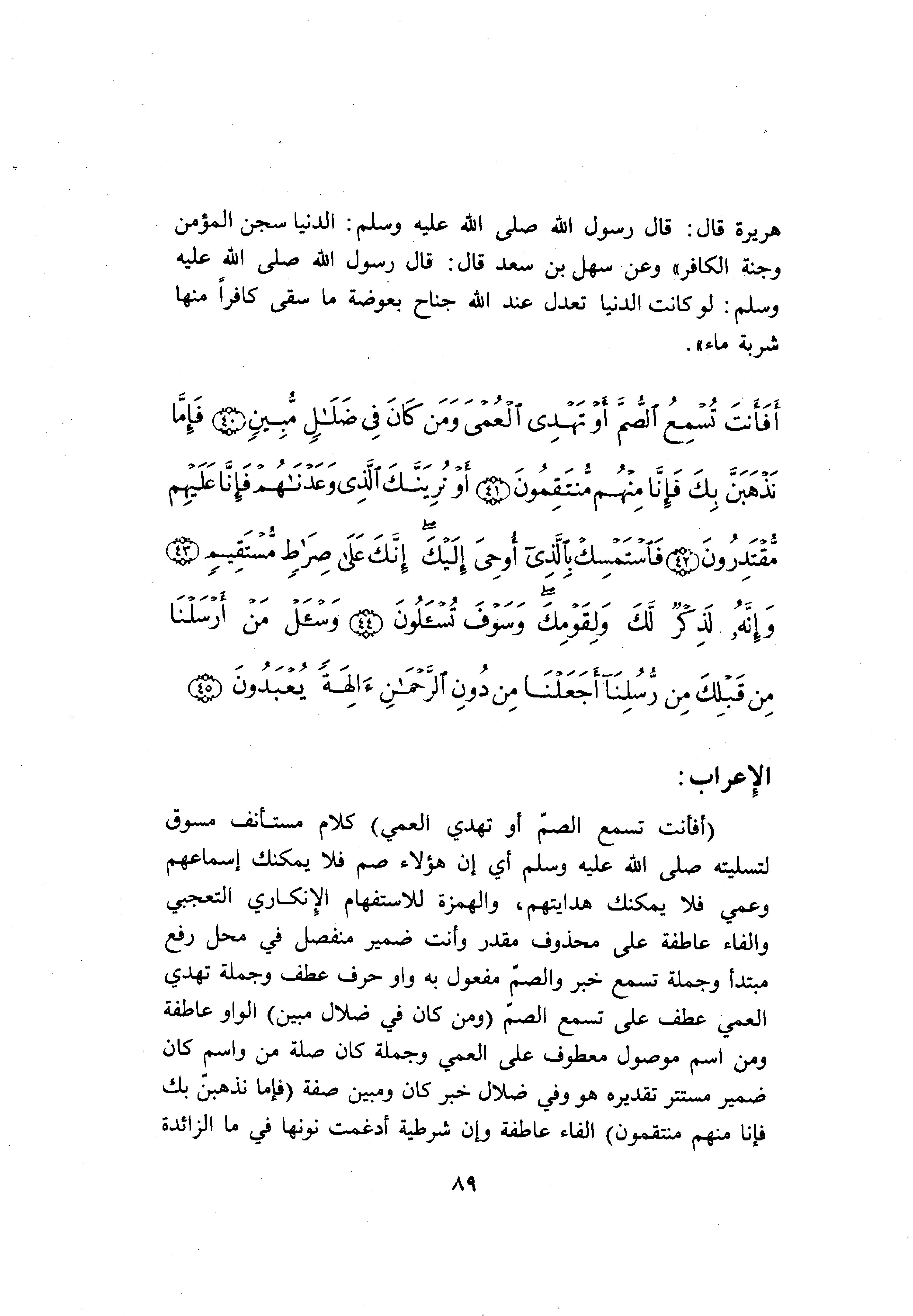 (أَفَأَنْتَ تُسْمِعُ الصُّمَّ أَوْ تَهْدِي الْعُمْيَ) كلام مستأنف مسوق لتسليته صلى الله عليه وسلم أي إن هؤلاء صم فلا يمكنك إسماعهم وعمي فلا يمكنك هدايتهم، والهمزة للاستفهام الإنكاري التعجبي والفاء عاطفة على محذوف مقدر وأنت ضمير منفصل في محل رفع مبتدأ وجملة تسمع خبر والصمّ مفعول به واو حرف عطف وجملة تهدي العمي عطف على تسمع الصمّ (وَمَنْ كانَ فِي ضَلالٍ مُبِينٍ) الواو عاطفة ومن اسم موصول معطوف على العمي وجملة كان صلة من واسم كان ضمير مستتر تقديره هو وفي ضلال خبر كان ومبين صفة (فَإِمَّا نَذْهَبَنَّ بِكَ فَإِنَّا مِنْهُمْ مُنْتَقِمُونَ) الفاء عاطفة وإن شرطية أدغمت نونها في ما الزائدة
