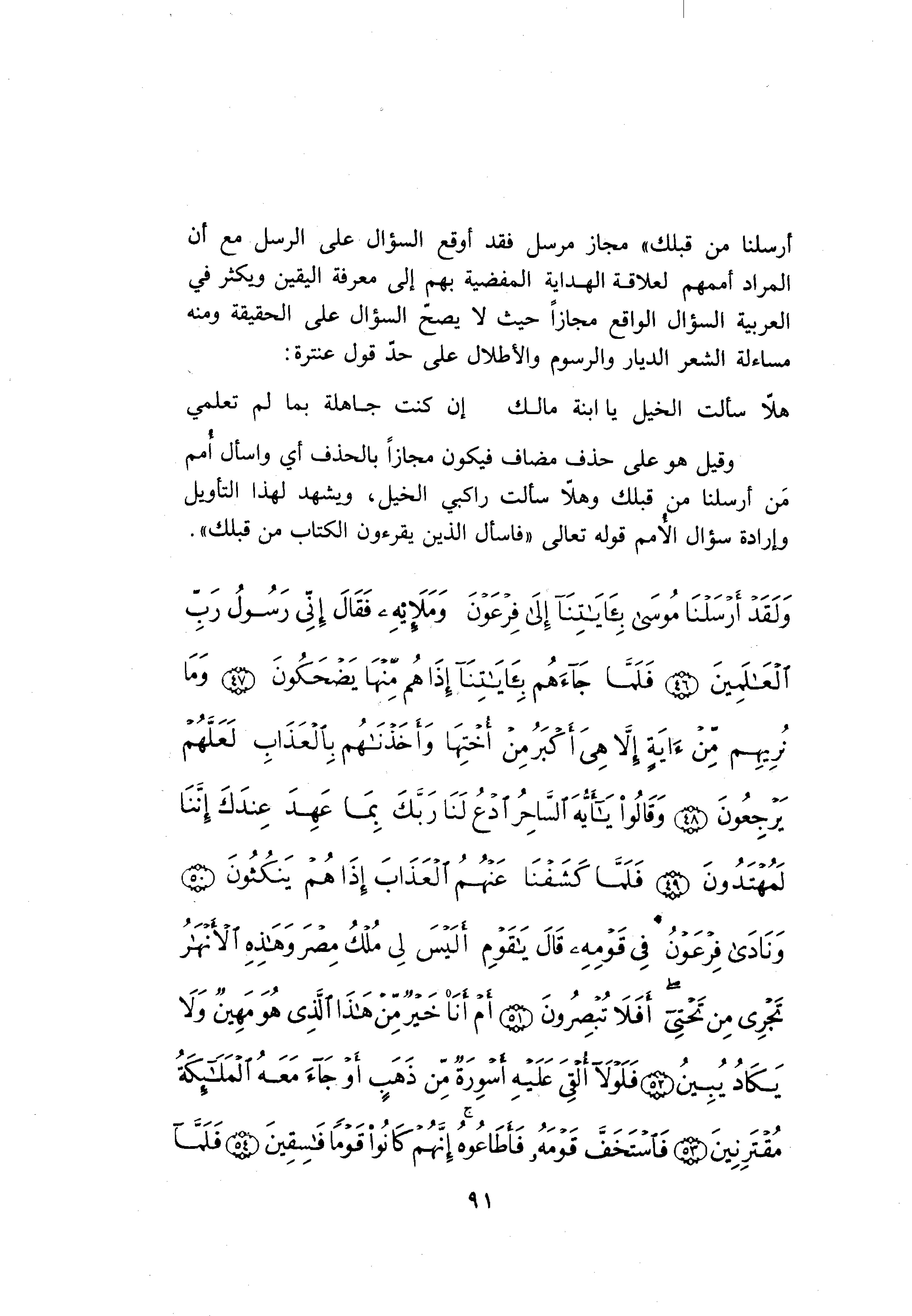 أرسلنا من قبلك» مجاز مرسل فقد أوقع السؤال على الرسل مع أن المراد أممهم لعلاقة الهداية المفضية بهم إلى معرفة اليقين ويكثر في العربية السؤال الواقع مجازا حيث لا يصحّ السؤال على الحقيقة ومنه مساءلة الشعر الديار والرسوم والأطلال على حدّ قول عنترة: