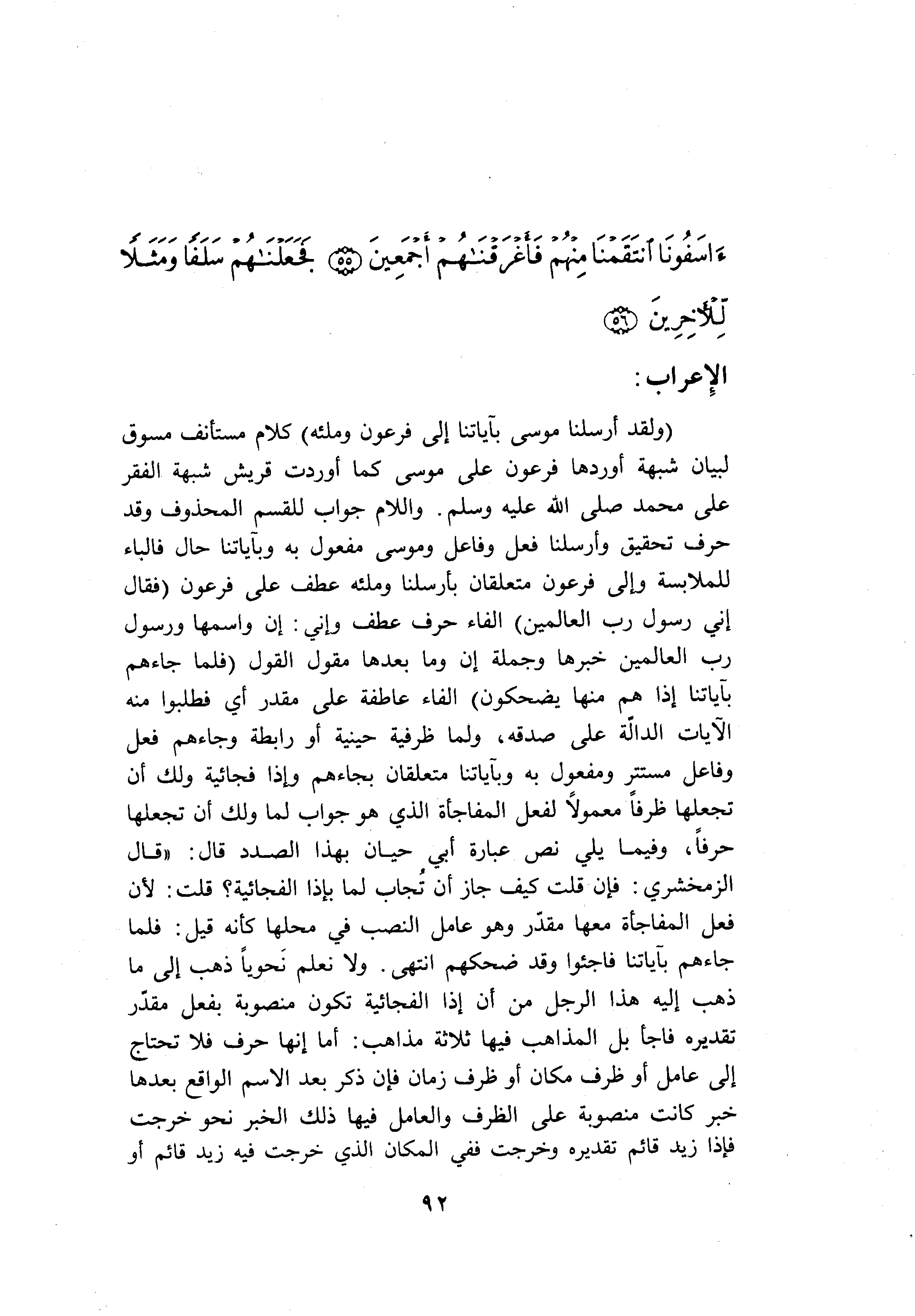 (وَلَقَدْ أَرْسَلْنا مُوسى بِآياتِنا إِلى فِرْعَوْنَ وَمَلَائِهِ) كلام مستأنف مسوق لبيان شبهة أوردها فرعون على موسى كما أوردت قريش شبهة الفقر على محمد صلى الله عليه وسلم. واللام جواب للقسم المحذوف وقد حرف تحقيق وأرسلنا فعل وفاعل وموسى مفعول به وبآياتنا حال فالباء للملابسة وإلى فرعون متعلقان بأرسلنا وملئه عطف على فرعون (فَقالَ إِنِّي رَسُولُ رَبِّ الْعالَمِينَ) الفاء حرف عطف وإني: إن واسمها ورسول رب العالمين خبرها وجملة إن وما بعدها مقول القول (فَلَمَّا جاءَهُمْ بِآياتِنا إِذا هُمْ مِنْها يَضْحَكُونَ) الفاء عاطفة على مقدر أي فطلبوا منه الآيات الدالّة على صدقه، ولما ظرفية حينية أو رابطة وجاءهم فعل وفاعل مستتر ومفعول به وبآياتنا متعلقان بجاءهم وإذا فجائية ولك أن تجعلها ظرفا معمولا لفعل المفاجأة الذي هو جواب لما ولك أن تجعلها حرفا، وفيما يلي نص عبارة أبي حيان بهذا الصدد قال: «قال الزمخشري: فإن قلت كيف جاز أن تجاب لما بإذا الفجائية؟ قلت: لأن فعل المفاجأة معها مقدّر وهو عامل النصب في محلها كأنه قيل: فلما جاءهم بآياتنا فاجئوا وقد ضحكهم انتهى. ولا نعلم نحويا ذهب إلى ما ذهب إليه هذا الرجل من أن إذا الفجائية تكون منصوبة بفعل مقدّر تقديره فاجأ بل المذاهب فيها ثلاثة مذاهب: أما إنها حرف فلا تحتاج إلى عامل أو ظرف مكان أو ظرف زمان فإن ذكر بعد الاسم الواقع بعدها خبر كانت منصوبة على الظرف والعامل فيها ذلك الخبر نحو خرجت فإذا زيد قائم تقديره وخرجت ففي المكان الذي خرجت فيه زيد قائم أو