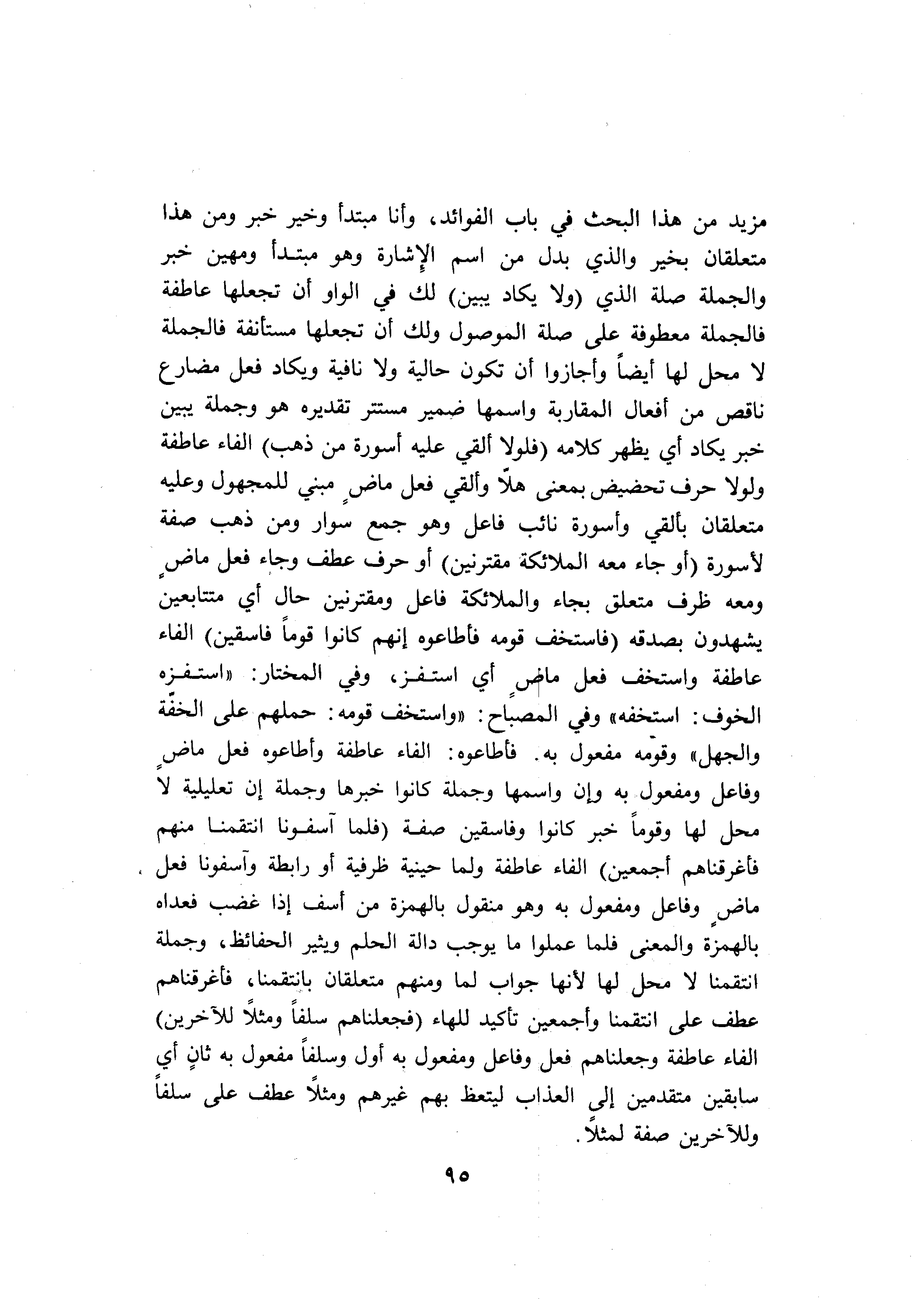 مزيد من هذا البحث في باب الفوائد، وأنا مبتدأ وخير خبر ومن هذا متعلقان بخير والذي بدل من اسم الإشارة وهو مبتدأ ومهين خبر والجملة صلة الذي (وَلا يَكادُ يُبِينُ) لك في الواو أن تجعلها عاطفة فالجملة معطوفة على صلة الموصول ولك أن تجعلها مستأنفة فالجملة لا محل لها أيضا وأجازوا أن تكون حالية ولا نافية ويكاد فعل مضارع ناقص من أفعال المقاربة واسمها ضمير مستتر تقديره هو وجملة يبين خبر يكاد أي يظهر كلامه (فَلَوْلا أُلْقِيَ عَلَيْهِ أَسْوِرَةٌ مِنْ ذَهَبٍ) الفاء عاطفة ولولا حرف تحضيض بمعنى هلّا وألقي فعل ماض مبني للمجهول وعليه متعلقان بألقي وأسورة نائب فاعل وهو جمع سوار ومن ذهب صفة لأسورة (أَوْ جاءَ مَعَهُ الْمَلائِكَةُ مُقْتَرِنِينَ)