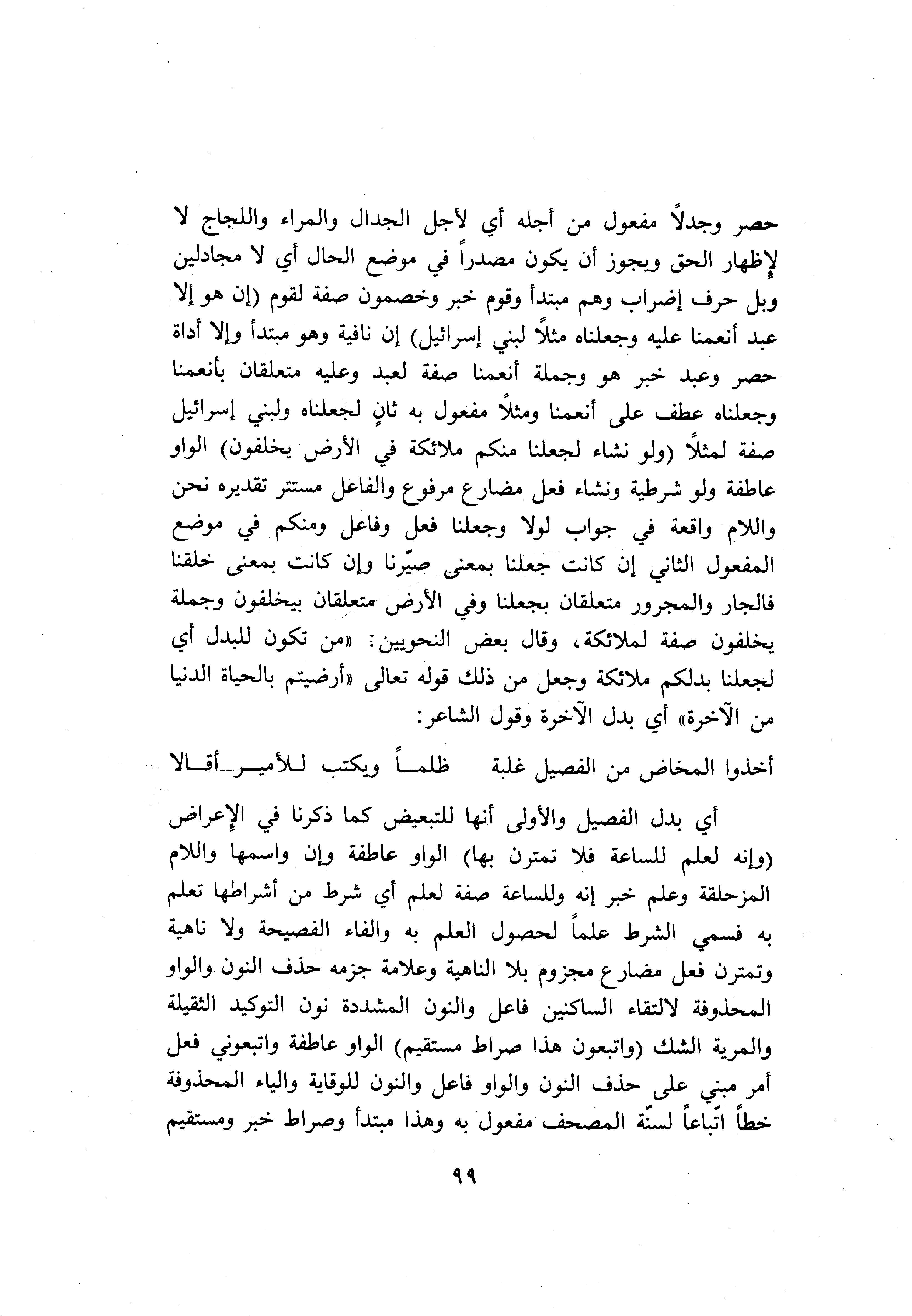 حصر وجدلا مفعول من أجله أي لأجل الجدال والمراء واللجاج لا لإظهار الحق ويجوز أن يكون مصدرا في موضع الحال أي لا مجادلين وبل حرف إضراب وهم مبتدأ وقوم خبر وخصمون صفة لقوم (إِنْ هُوَ إِلَّا عَبْدٌ أَنْعَمْنا عَلَيْهِ وَجَعَلْناهُ مَثَلًا لِبَنِي إِسْرائِيلَ) إن نافية وهو مبتدأ وإلا أداة حصر وعبد خبر هو وجملة أنعمنا صفة لعبد وعليه متعلقان بأنعمنا وجعلناه عطف على أنعمنا ومثلا مفعول به ثان لجعلناه ولبني إسرائيل صفة لمثلا (وَلَوْ نَشاءُ لَجَعَلْنا مِنْكُمْ مَلائِكَةً فِي الْأَرْضِ يَخْلُفُونَ) الواو عاطفة ولو شرطية ونشاء فعل مضارع مرفوع والفاعل مستتر تقديره نحن واللام واقعة في جواب لولا وجعلنا فعل وفاعل ومنكم في موضع المفعول الثاني إن كانت جعلنا بمعنى صيّرنا وإن كانت بمعنى خلقنا فالجار والمجرور متعلقان بجعلنا وفي الأرض متعلقان بيخلفون وجملة يخلفون صفة لملائكة، وقال بعض النحويين: «من تكون للبدل أي لجعلنا بدلكم ملائكة وجعل من ذلك قوله تعالى «أرضيتم بالحياة الدنيا من الآخرة» أي بدل الآخرة وقول الشاعر:
