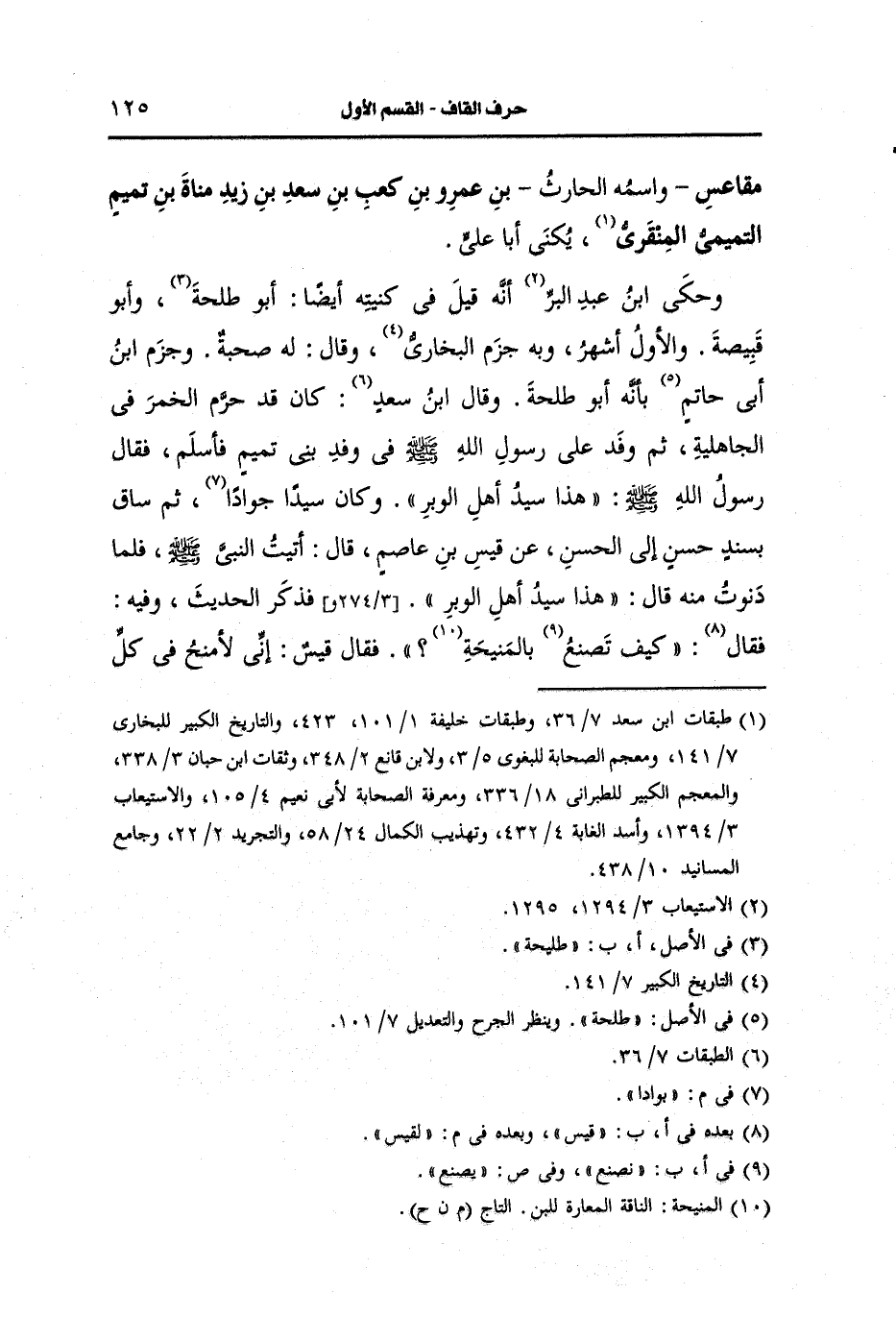 وجزم بن أبي حاتم بأنه أَبو طلحة قال ابن سَعد: كان قد حرم الخمر في الجاهلية ثم وفد على رسول الله صَلى الله عَلَيه وسَلم في وفد بني تميم فأسلم فقال رسول الله صَلى الله عَلَيه وسَلم هذا سيد أهل الوبر، وكان سيدا بوادا ثم ساق بسند حسن إلى الحسن، عَن قيس بن عاصم، قال: أَتيتُ النَّبيّ صَلى الله عَلَيه وسَلم فلما دنوت منه قال هذا سيد أهل الوبر فذكر الحديث.