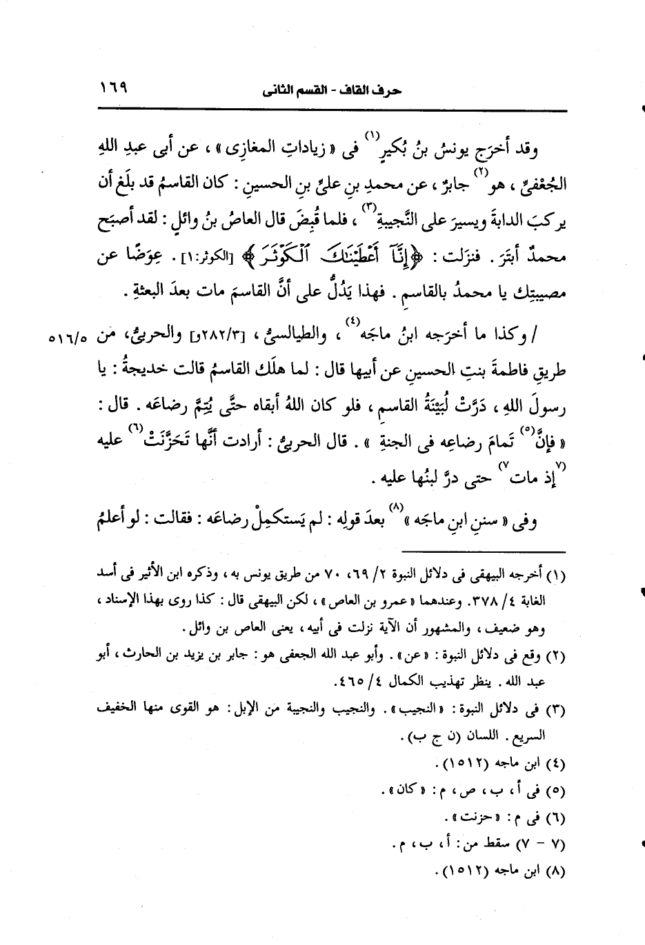 وقد أخرج يونس بن بكير في زيادات المغازي، عَن أبي عَبد الله الجعفي هو جابر، عَن محمد بن علي بن الحسين كان القاسم قد بلغ ان يركب الدابة ويسير على النجيبة فلما قبض قال العاص بن وائل لقد أصبح محمد ابتر فنزلت انا أعطيناك الكوثر عوضا، عَن مصيبتك يا محمد بالقاسم فهذا يدل على ان القاسم مات بعد البعثة.