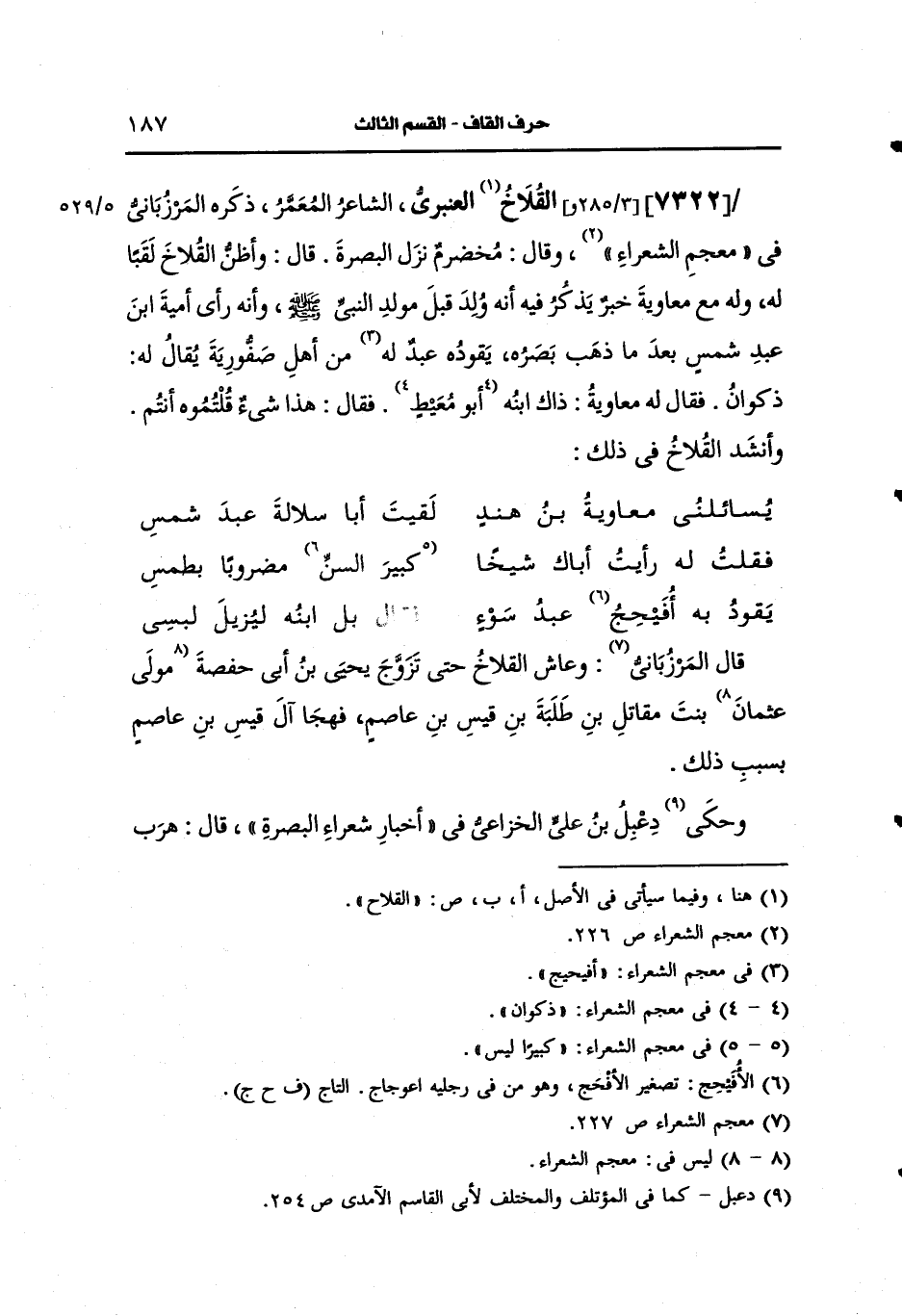 ذكره المرزباني في معجم الشعراء وقال مخضرم نزل البصرة قال وأظن القلاخ لقبا له وله مع معاوية خبر يذكر فيه أنه ولد قبل مولد النَّبيّ صَلى الله عَلَيه وسَلم وأنه رأى أمية بن عبد شمس بعدما ذهب بصرة يقوده عبدله من أهل صفورية يُقَالُ لَهُ: ذكوان فقال له معاوية ذاك ابنه أَبو معيط فقال هذا شيء قلتموه أنتم وأنشد القلاخ في ذلك: